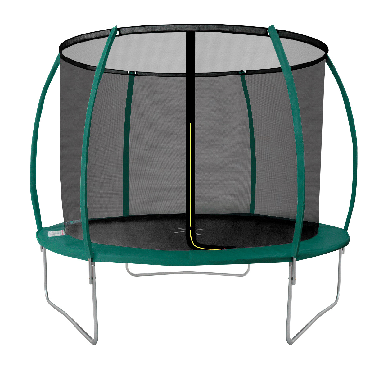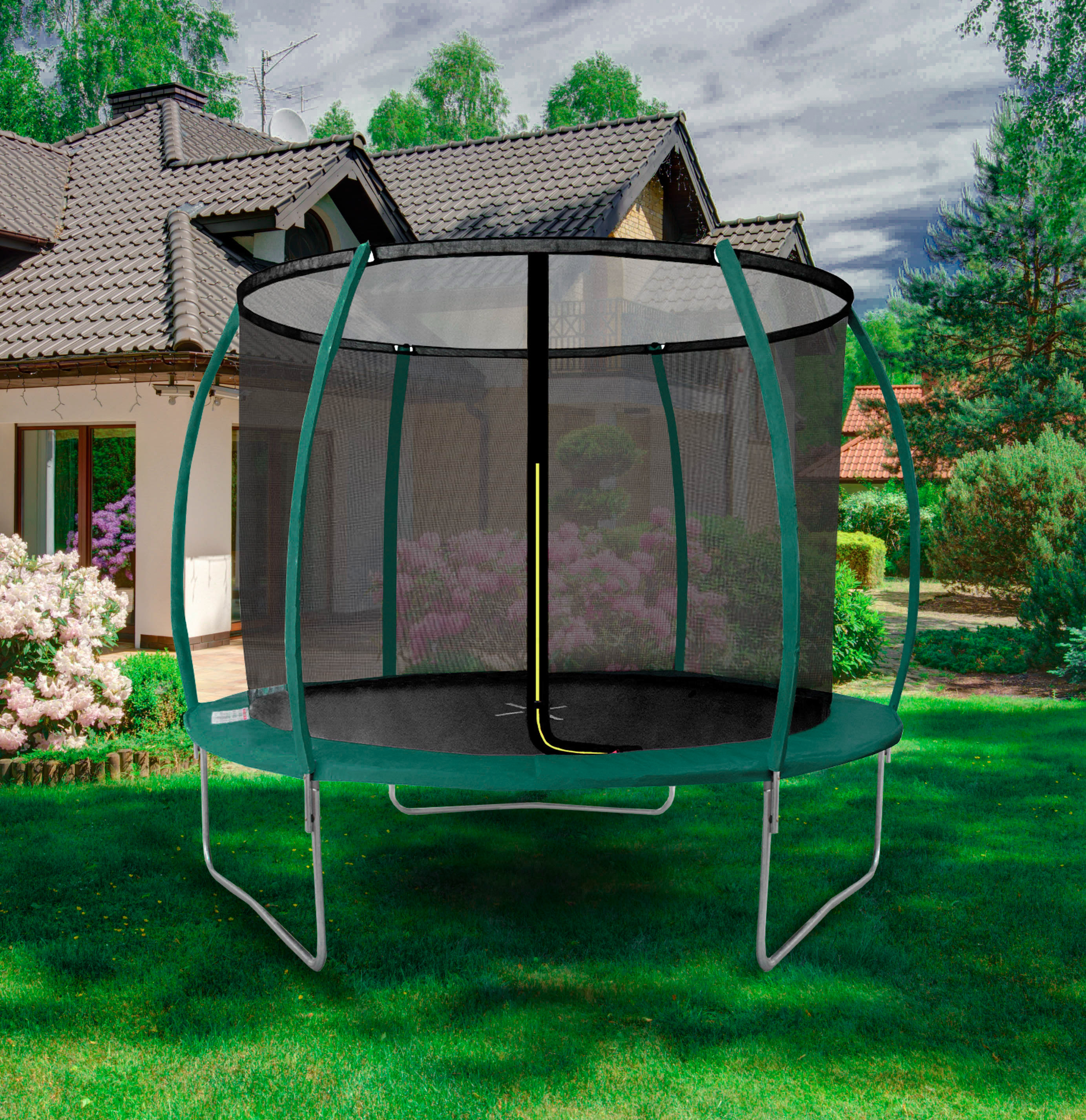 A bejárati nyílás L alakú cipzárral van ellátva, így biztosítva a trambulin teljes lezárását.
