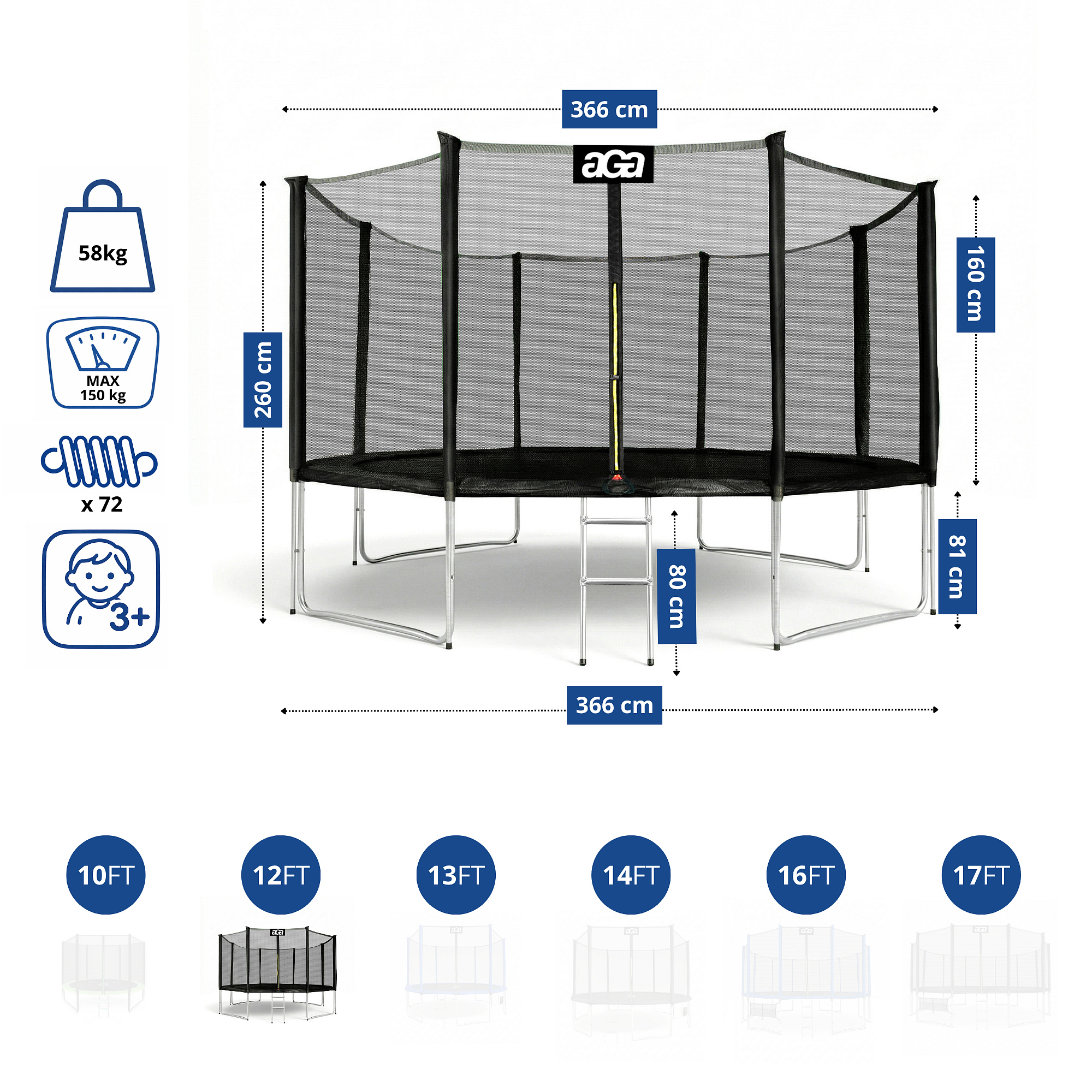 Aga SPORT PRO 366 cm trambulin védőhálóval - specifikáció.