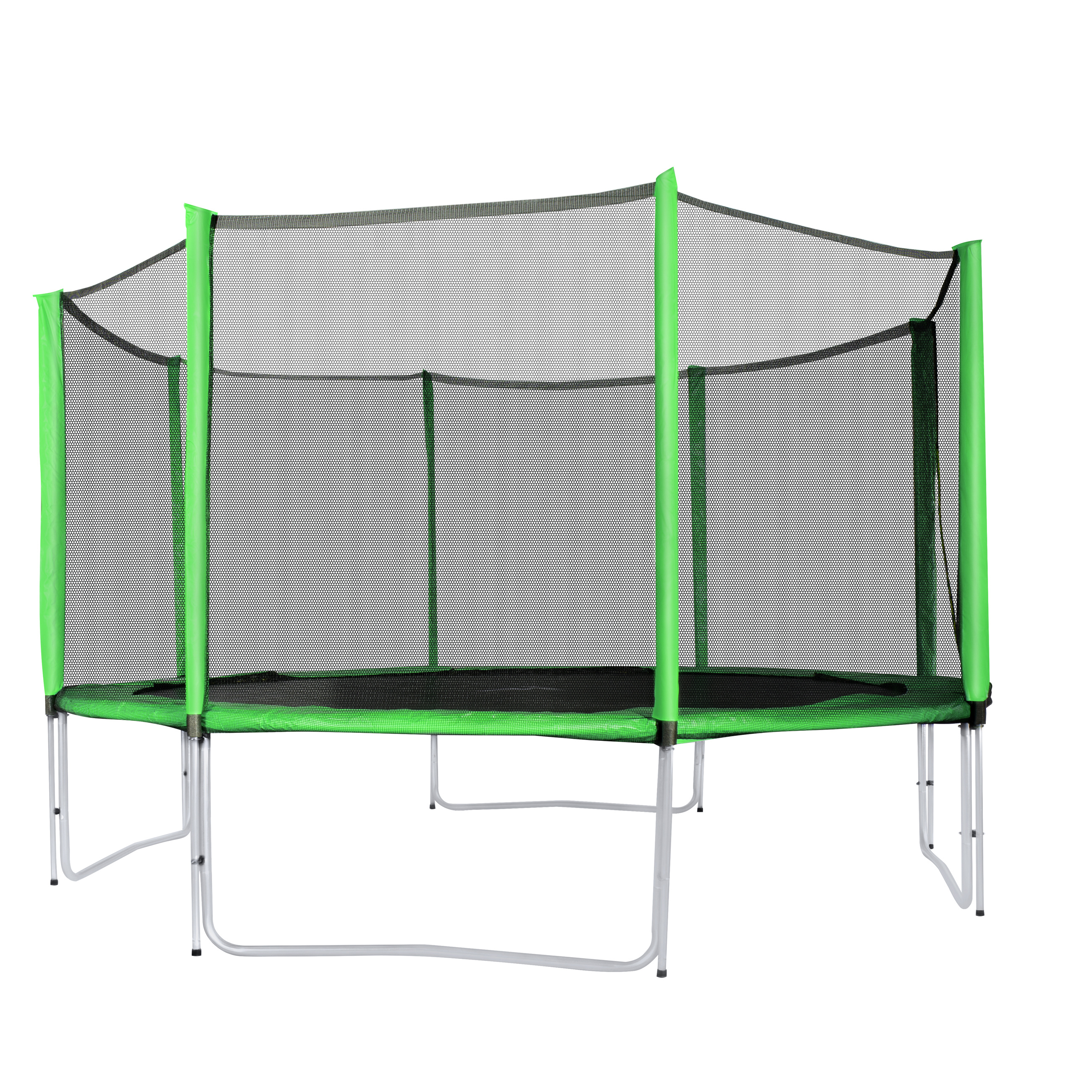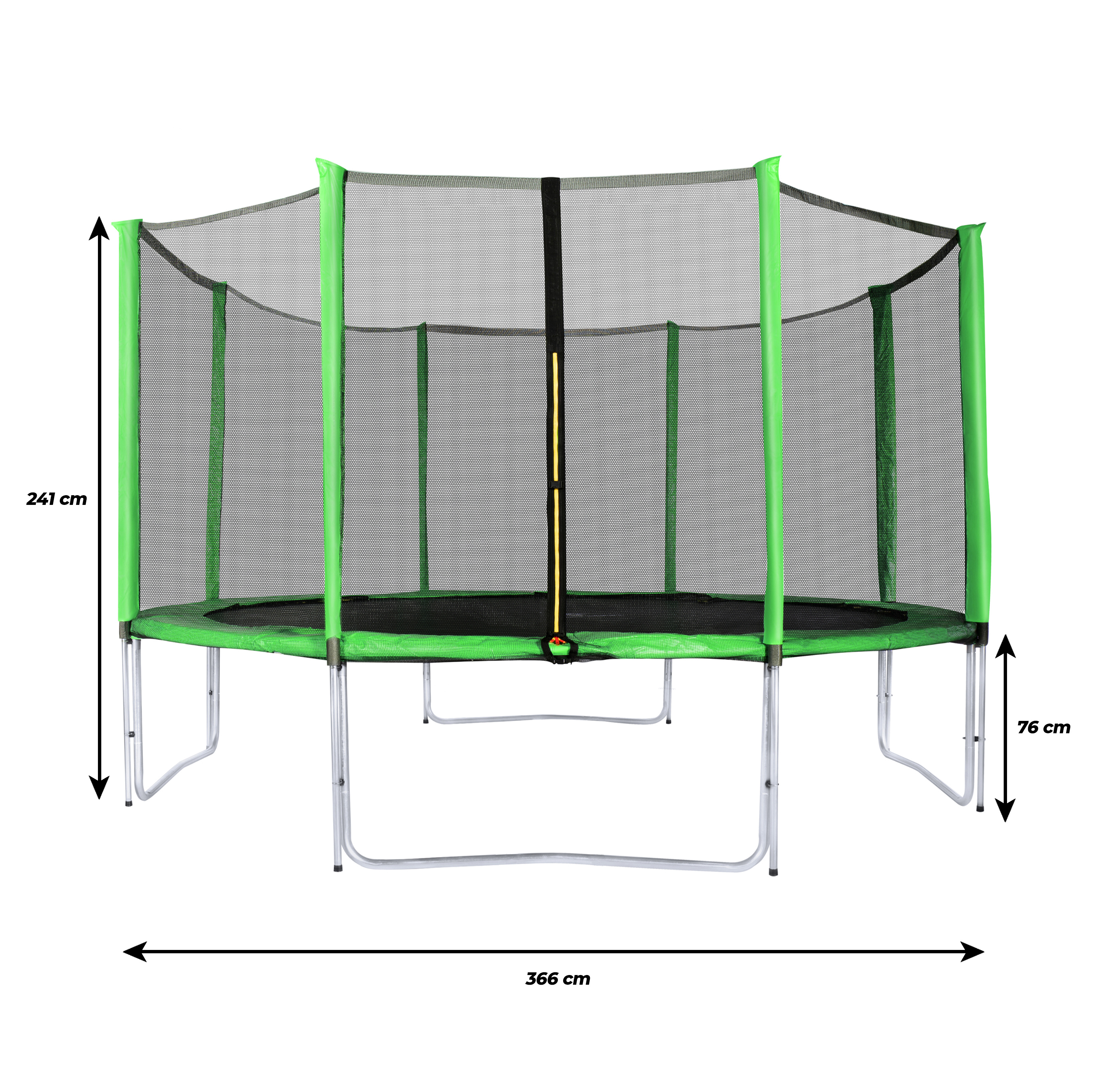 Az Aga SPORT PRO 366 cm-es világoszöld trambulin specifikációi védőhálóval.