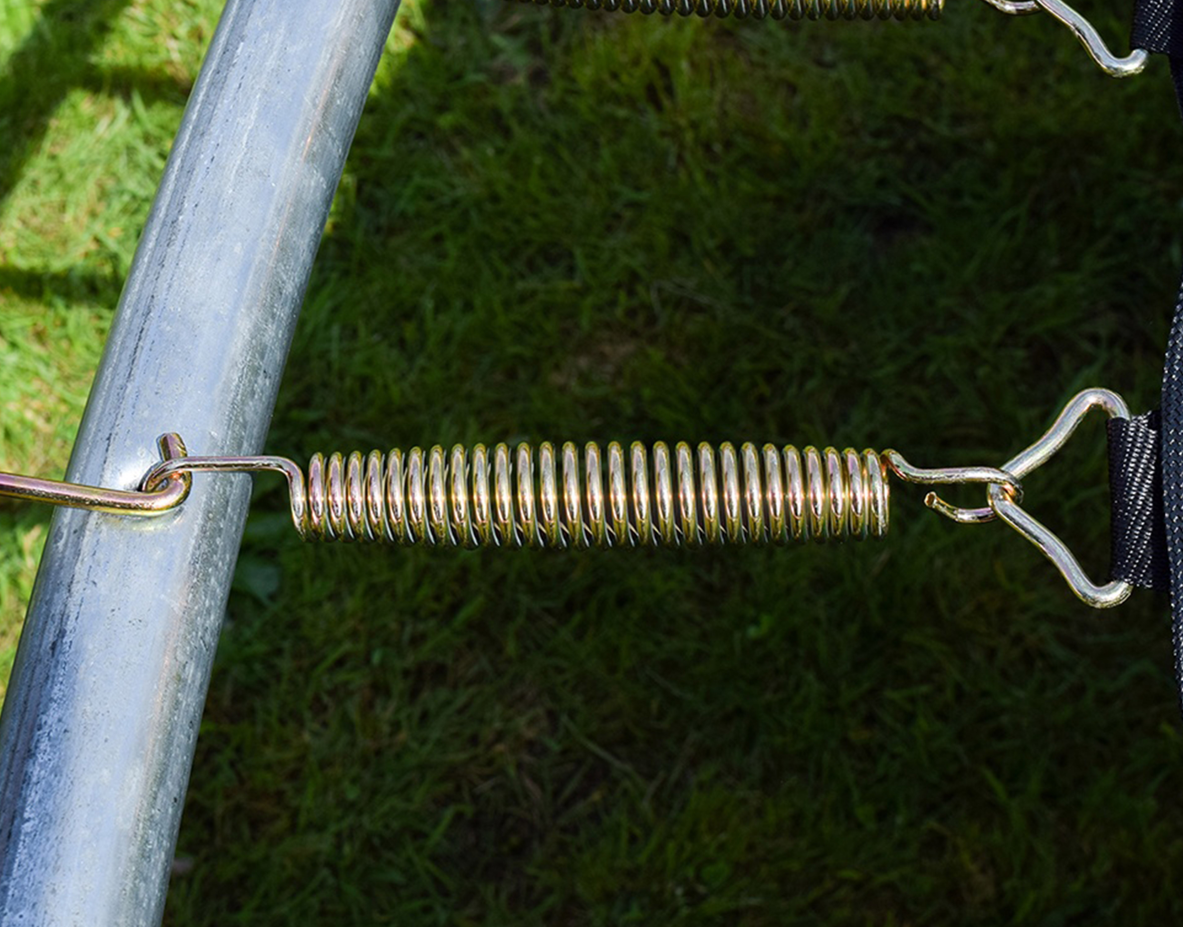 A Hi-Ten megerősített trambulin szerkezet kiváló minőségű, horganyzott acélból készült, kiváló korrózióállósággal.