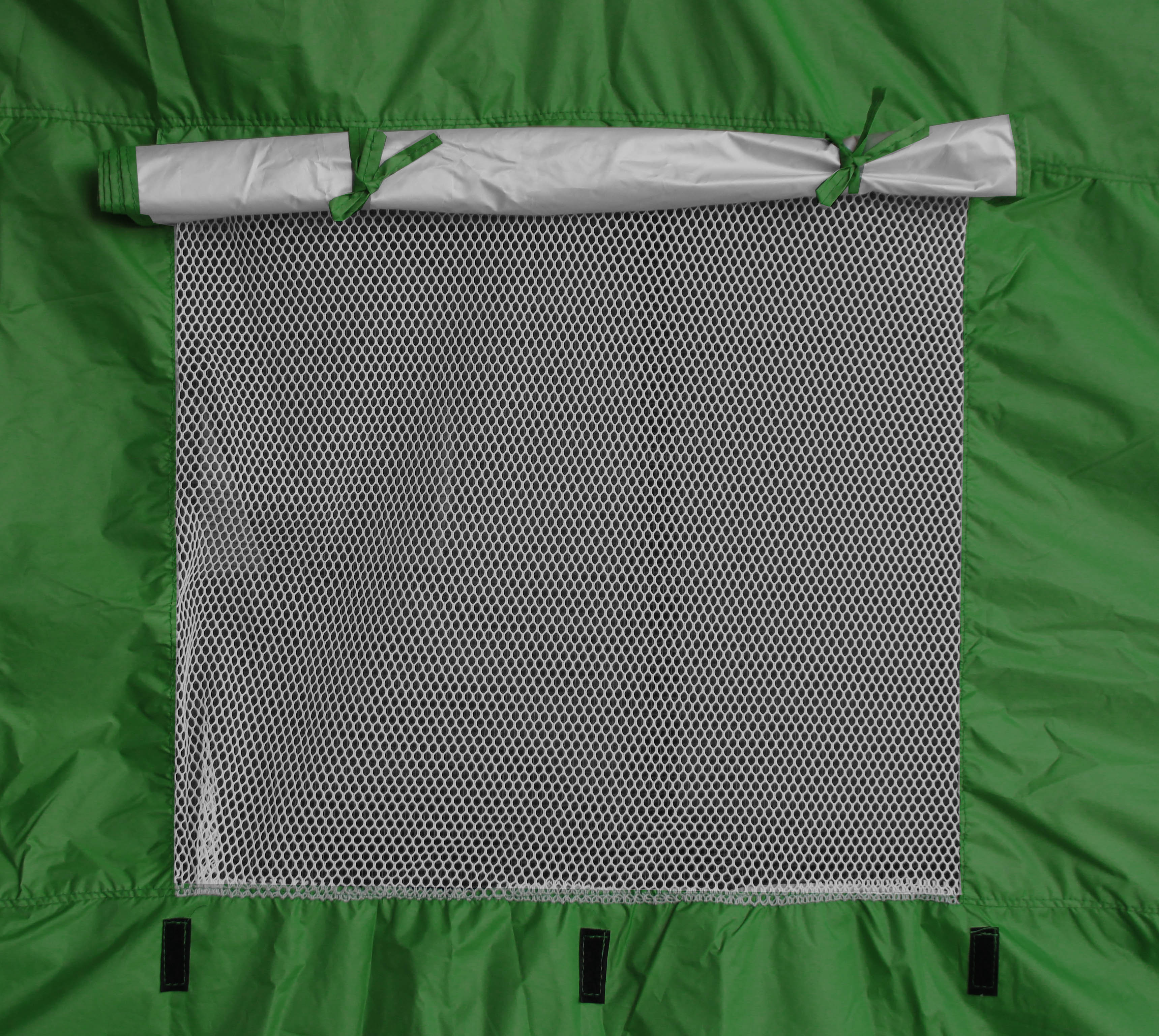 A sátor szellőzőnyílásokkal van felszerelve, amelyek lehúzható redőnyökkel és rovarhálókkal vannak ellátva.