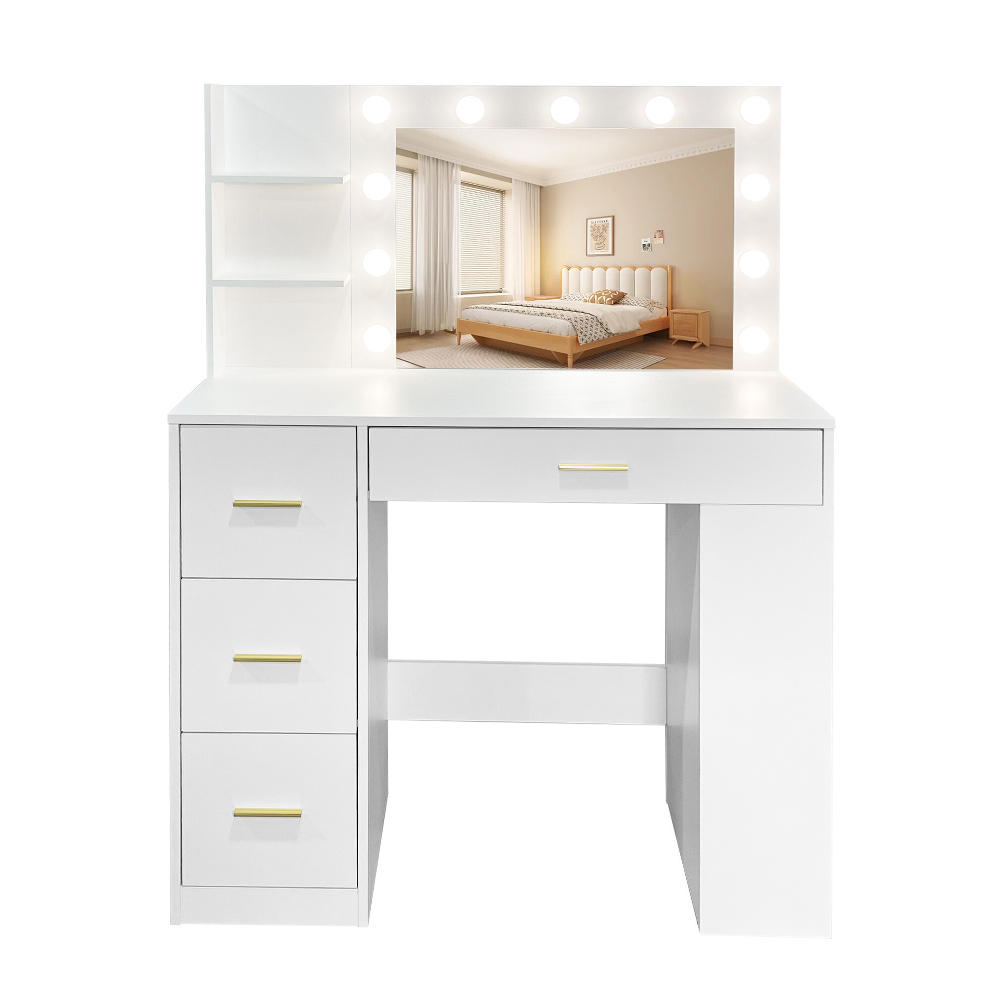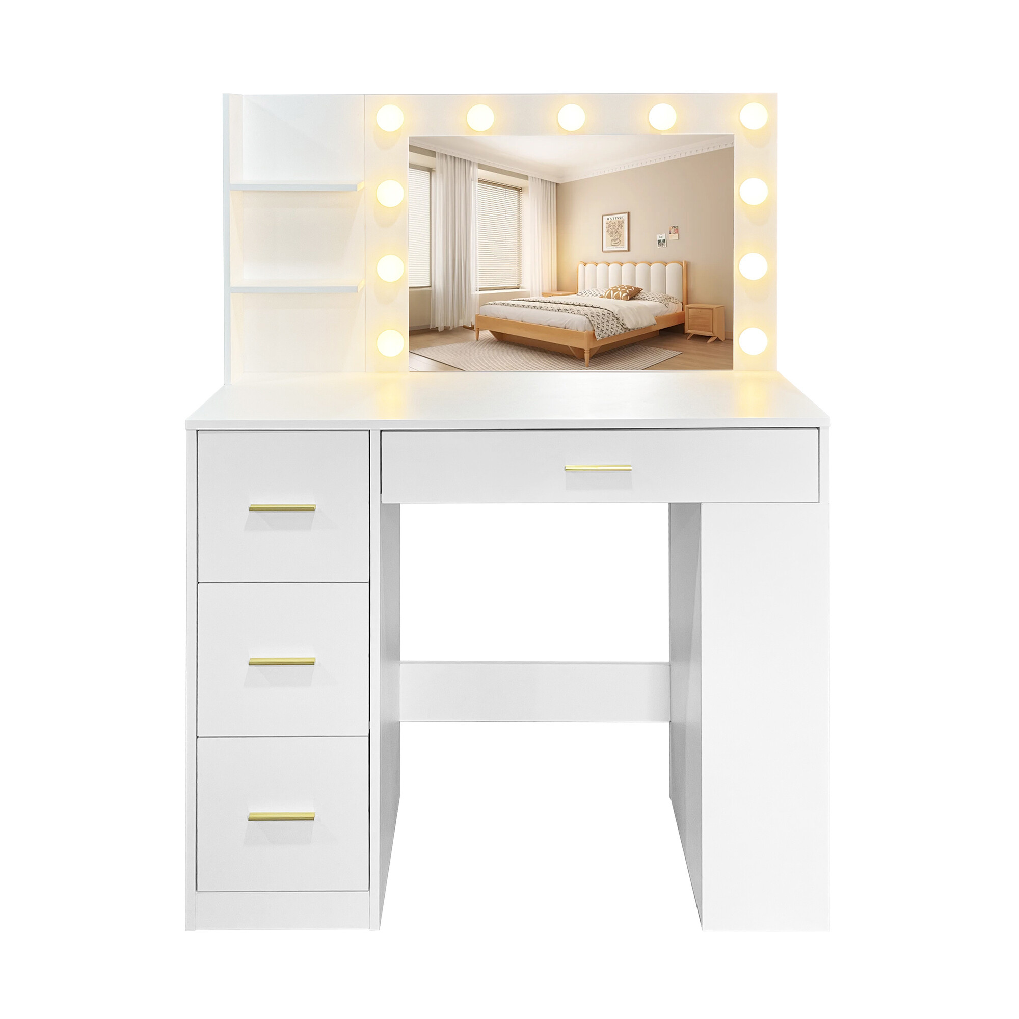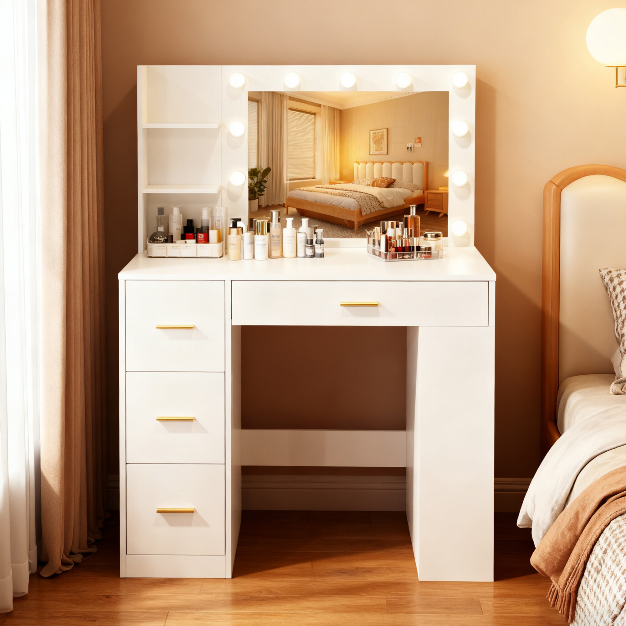 Az asztal domináns eleme egy nagy tükör 11 LED izzóval, amelyeknél egyszerűen változtathatja a fény hőmérsékletét hidegtől a semlegesig és melegig. Ennek köszönhetően mindig ideális megvilágítást biztosíthat a sminkeléshez, hajformázáshoz vagy az esti bőrápoláshoz.