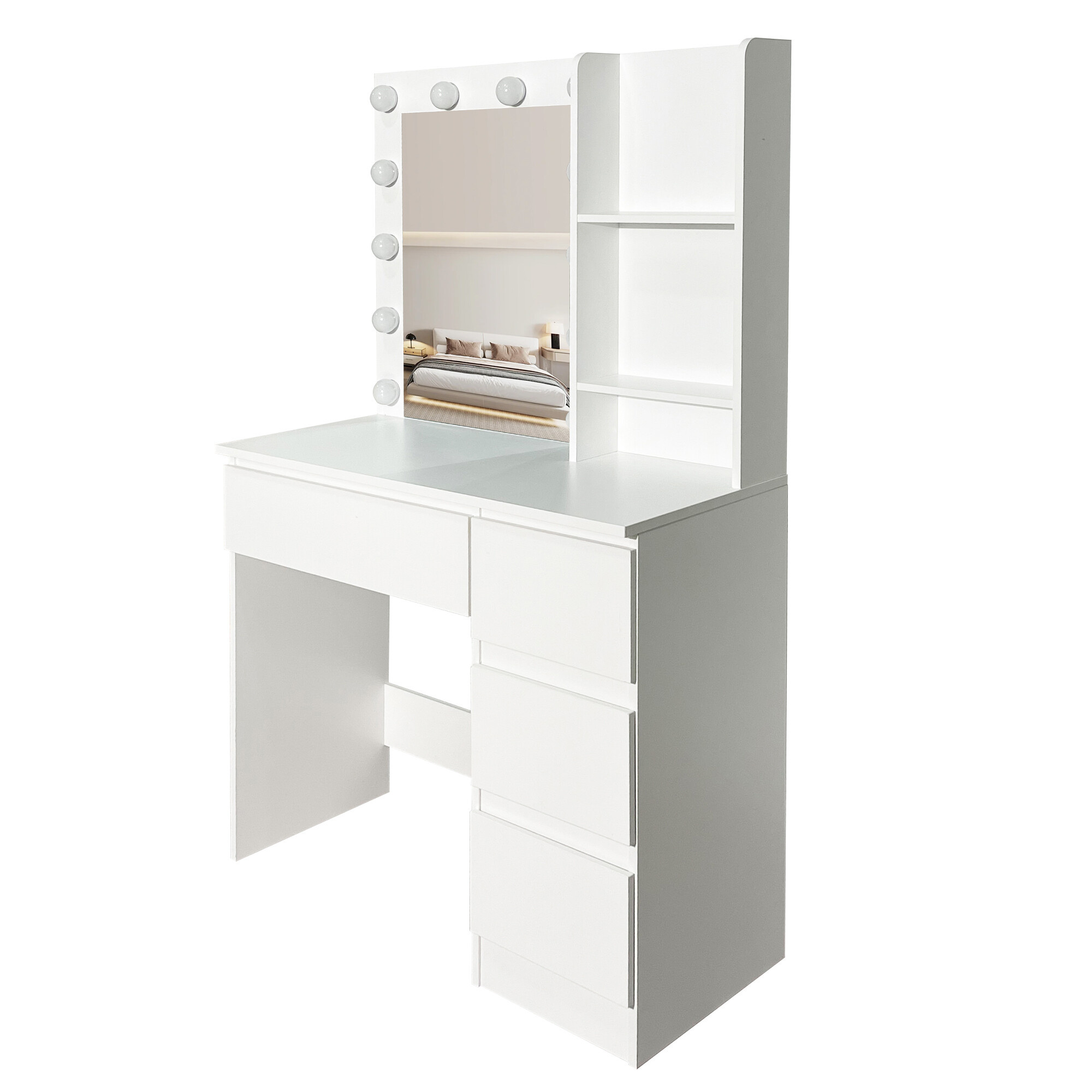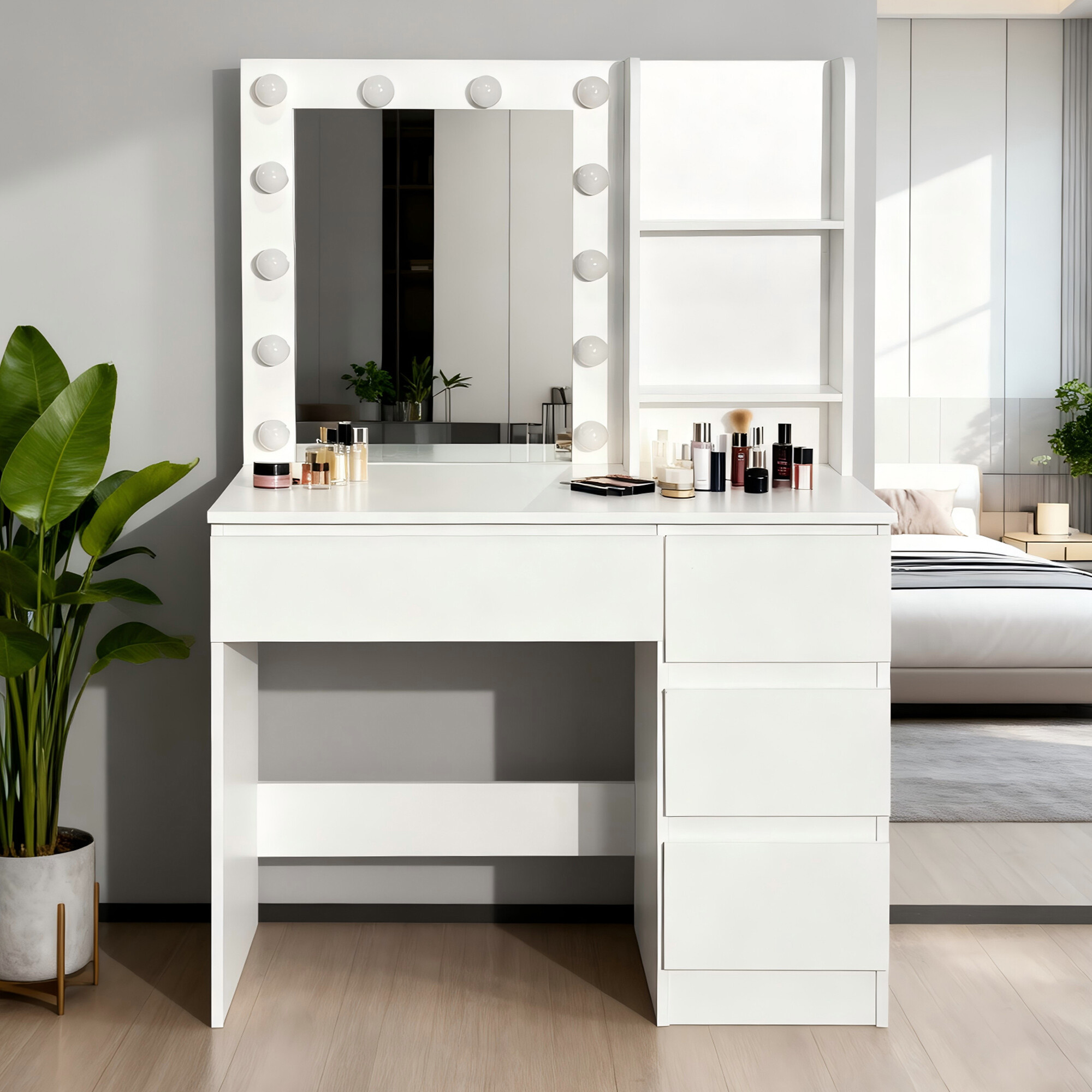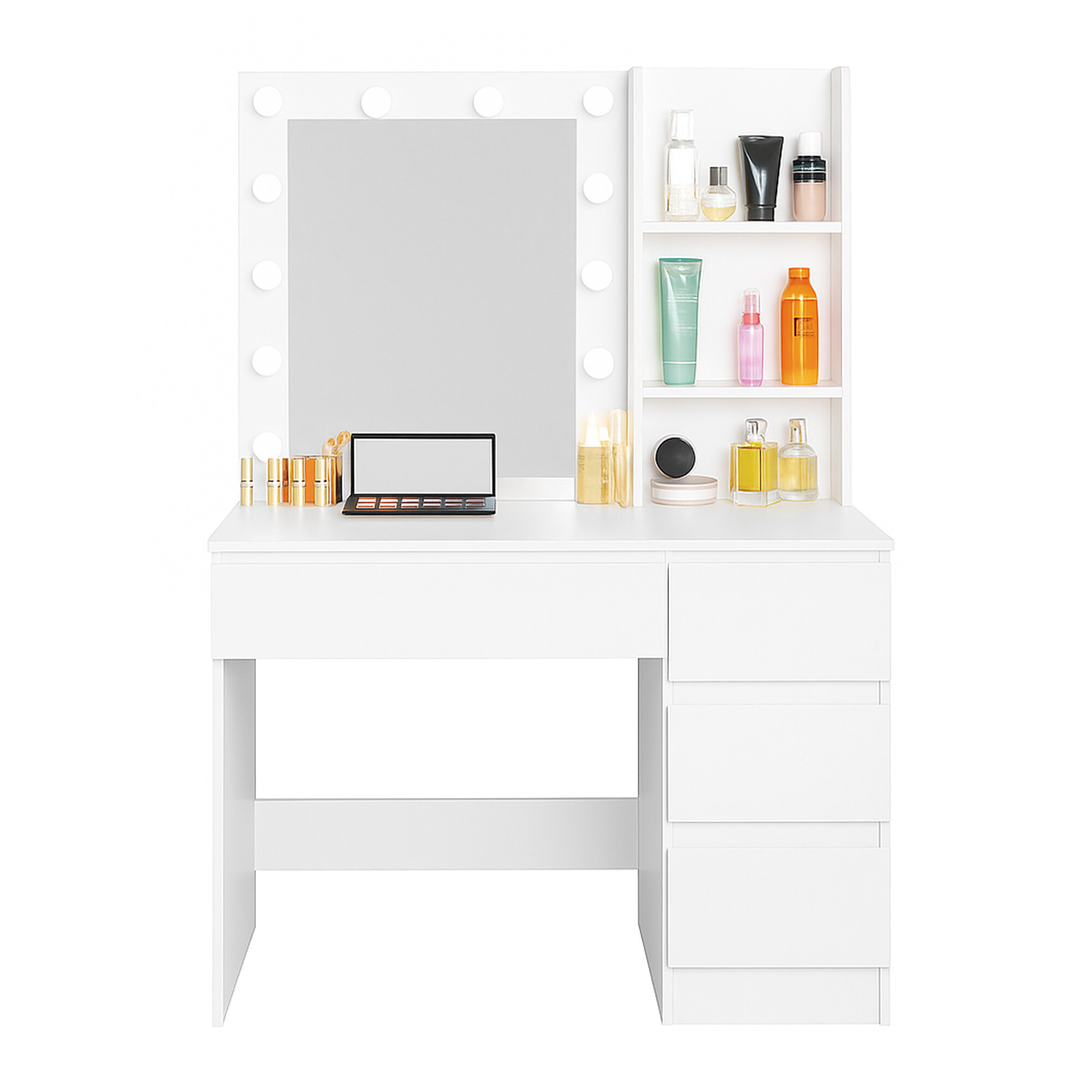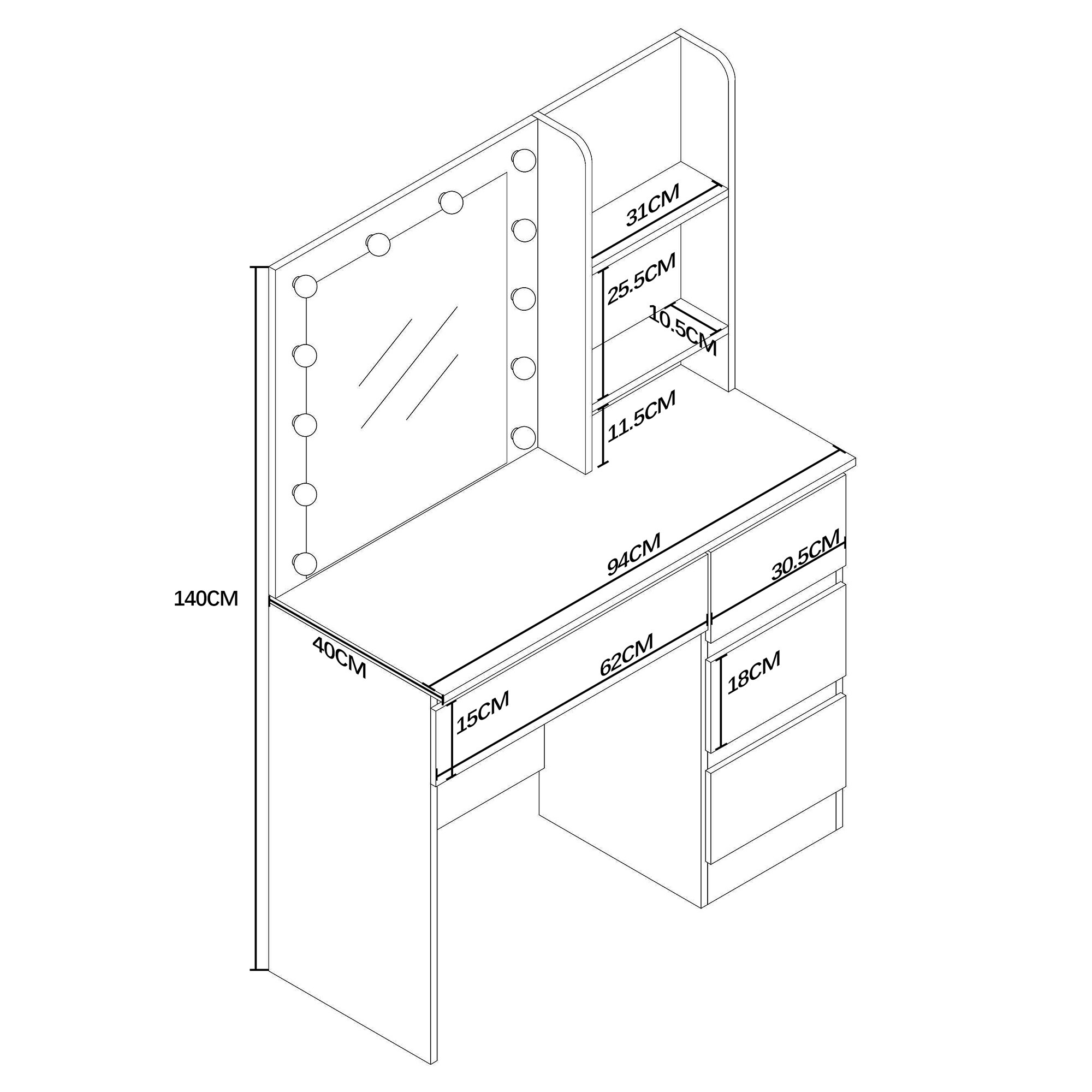 A 94 × 40 × 140 cm-es méreteivel az asztal remekül illik kisebb hálószobákba vagy lakásokba is. Modern kialakítása, amelyet finom LED világítás egészít ki, stílusos és otthonos helyet teremt a mindennapi szépségápolási rituálékhoz.