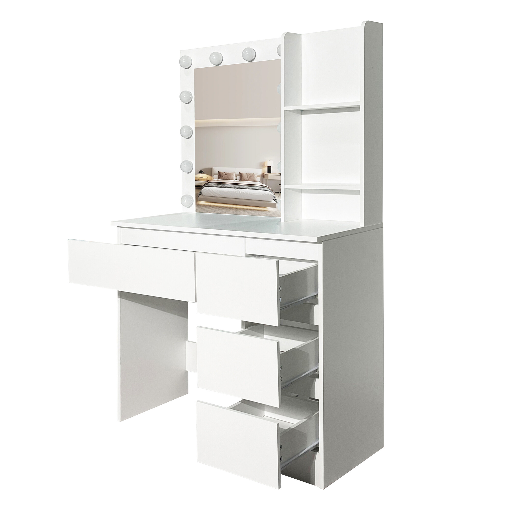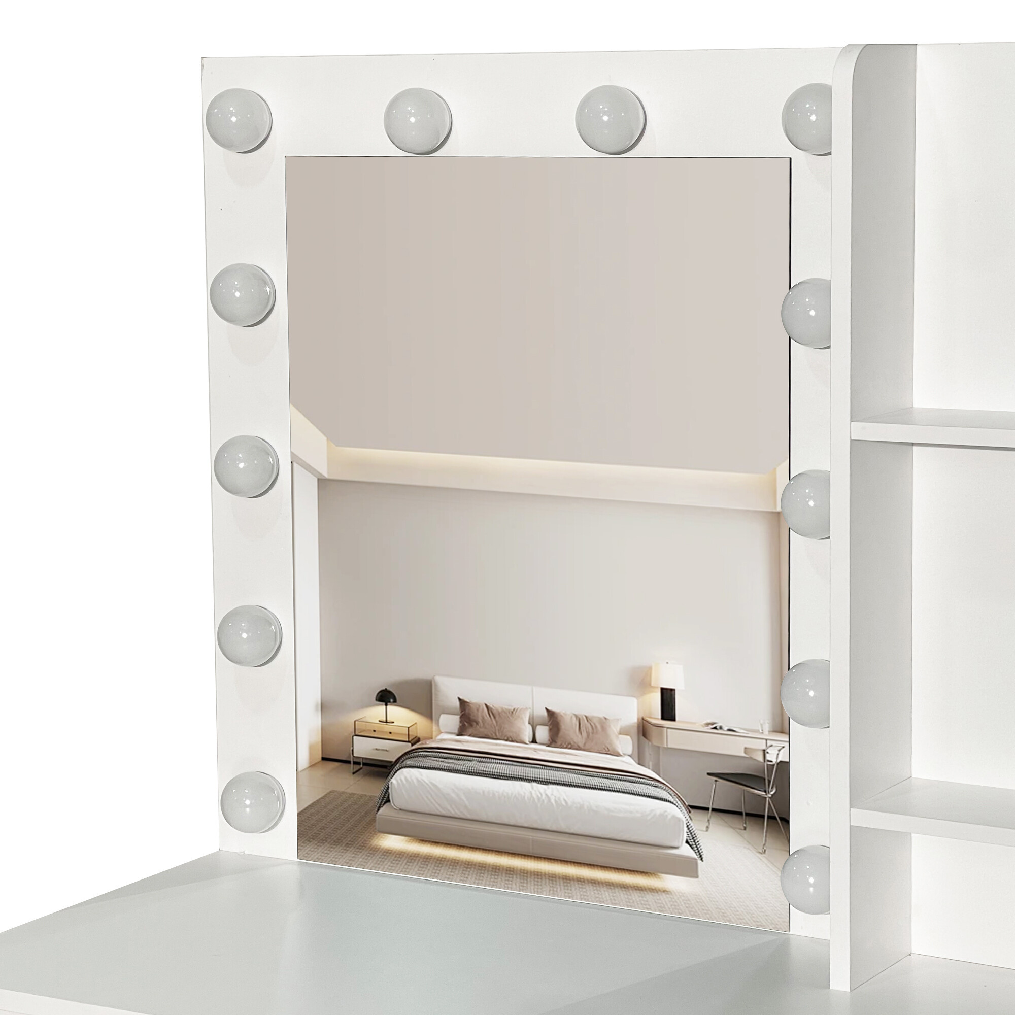 Élvezze a kényelmes és stílusos sminkelést ezzel a modern fésülködőasztallal, tükörrel és LED világítással. Elegáns fehér fésülködőasztal tiszta vonalakkal, amely luxust és praktikusságot kölcsönöz hálószobájának vagy öltözőjének.