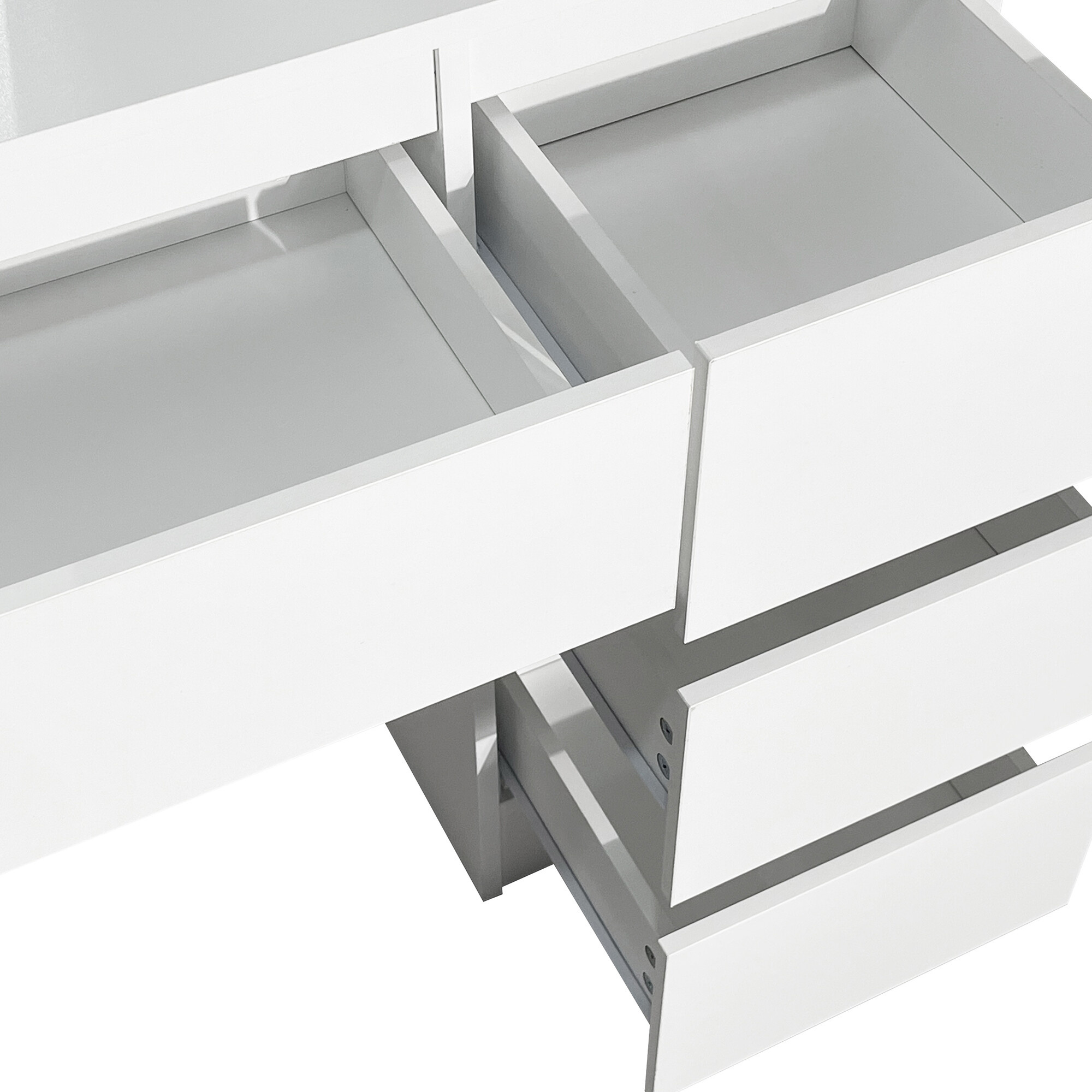 Az asztal tágas munkafelülettel van felszerelve, amelyre kényelmesen elfér a kozmetika és a kiegészítők is. Négy praktikus fiók lehetővé teszi a smink, ékszerek és egyéb szükségletek áttekinthető tárolását, míg a tükör melletti két nyitott polc helyet biztosít dekorációknak vagy gyakran használt termékeknek.