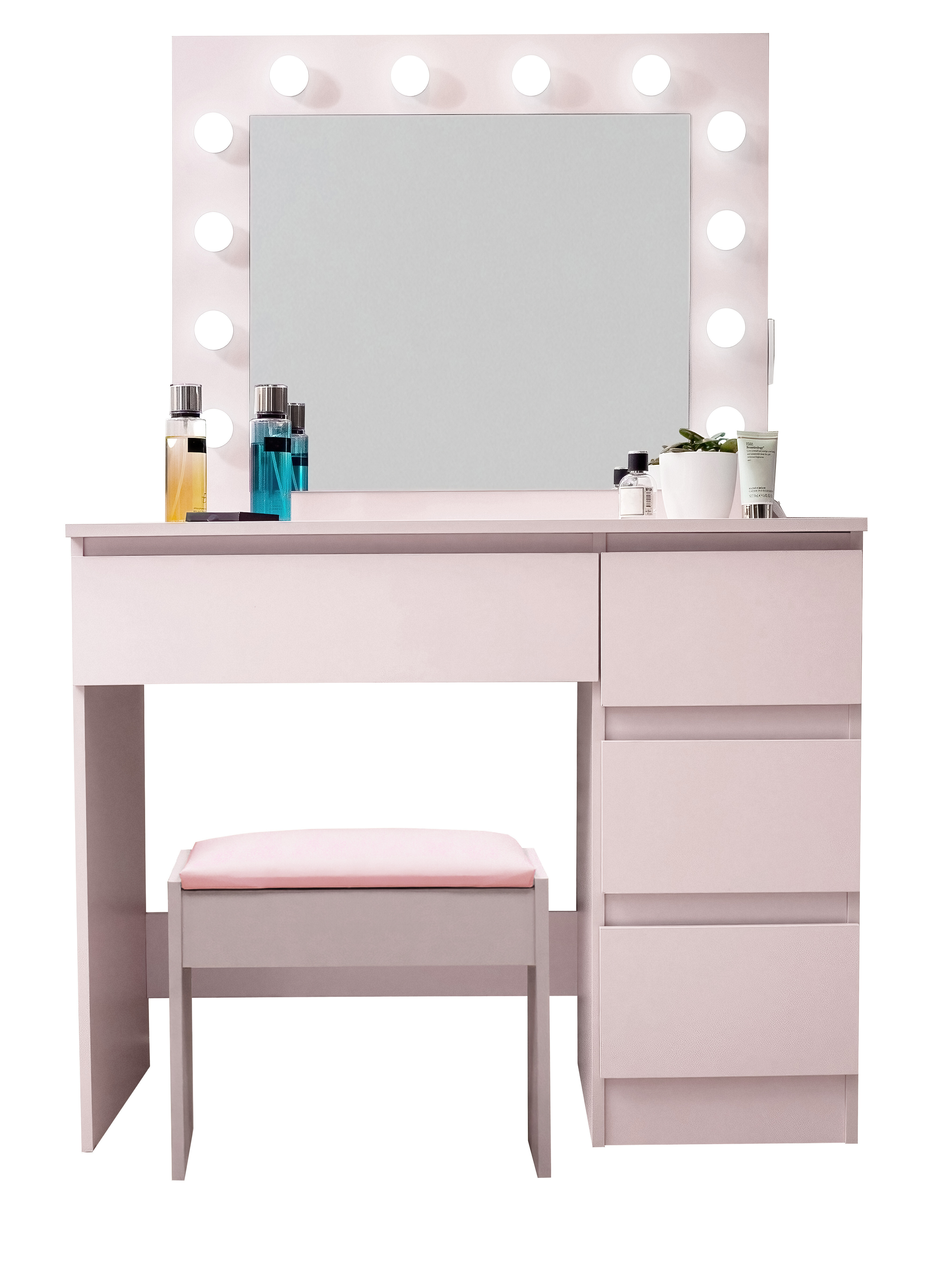 A tükör oldalán van egy elektromos aljzat például hajszárítóhoz, hajvasalóhoz és USB csatlakozók mobil eszközök töltéséhez.A puff kiváló minőségű puha habból készült, amelyen órákig lehet ülni.