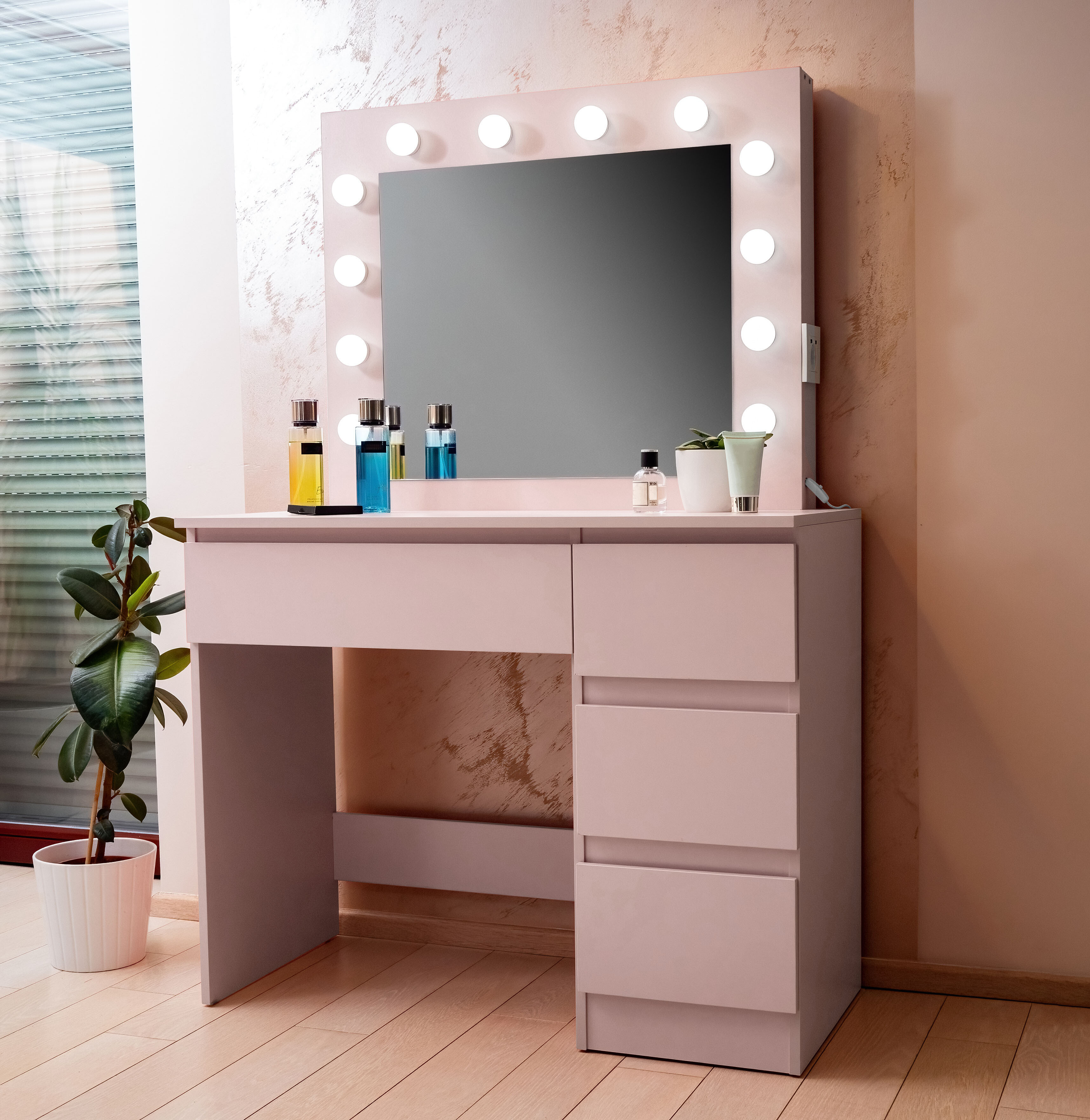 Biztosan értékelni fogja a 4 tágas fiókot is, amelyekben kényelmesen elhelyezheti az összes kozmetikai eszközét, ékszerét és egyéb kiegészítőit.
