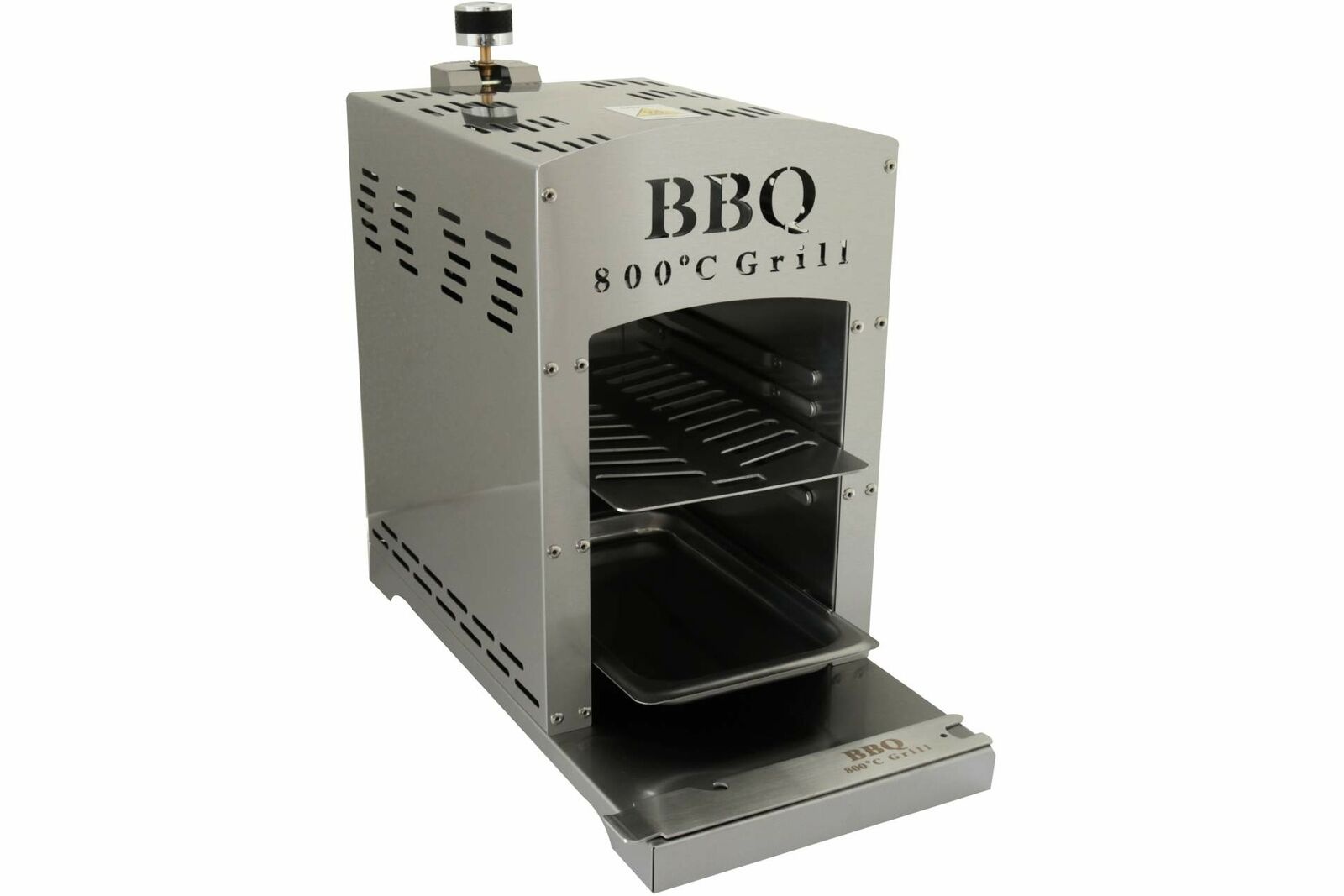 Grillező tartozékokkal, beleértve a gázcsövet, rozsdamentes acél leeresztő tálcát.