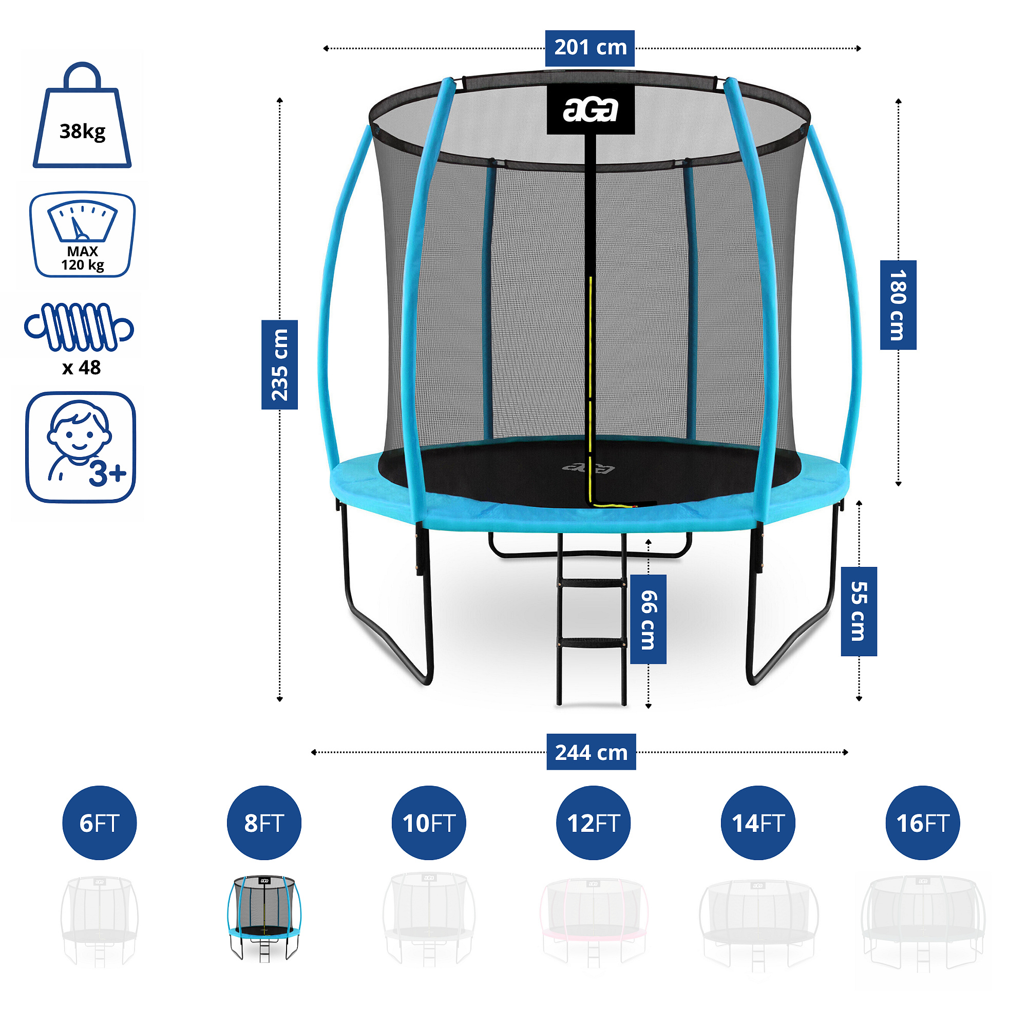 - Trambulin átmérője: 250 cm (8 ft)