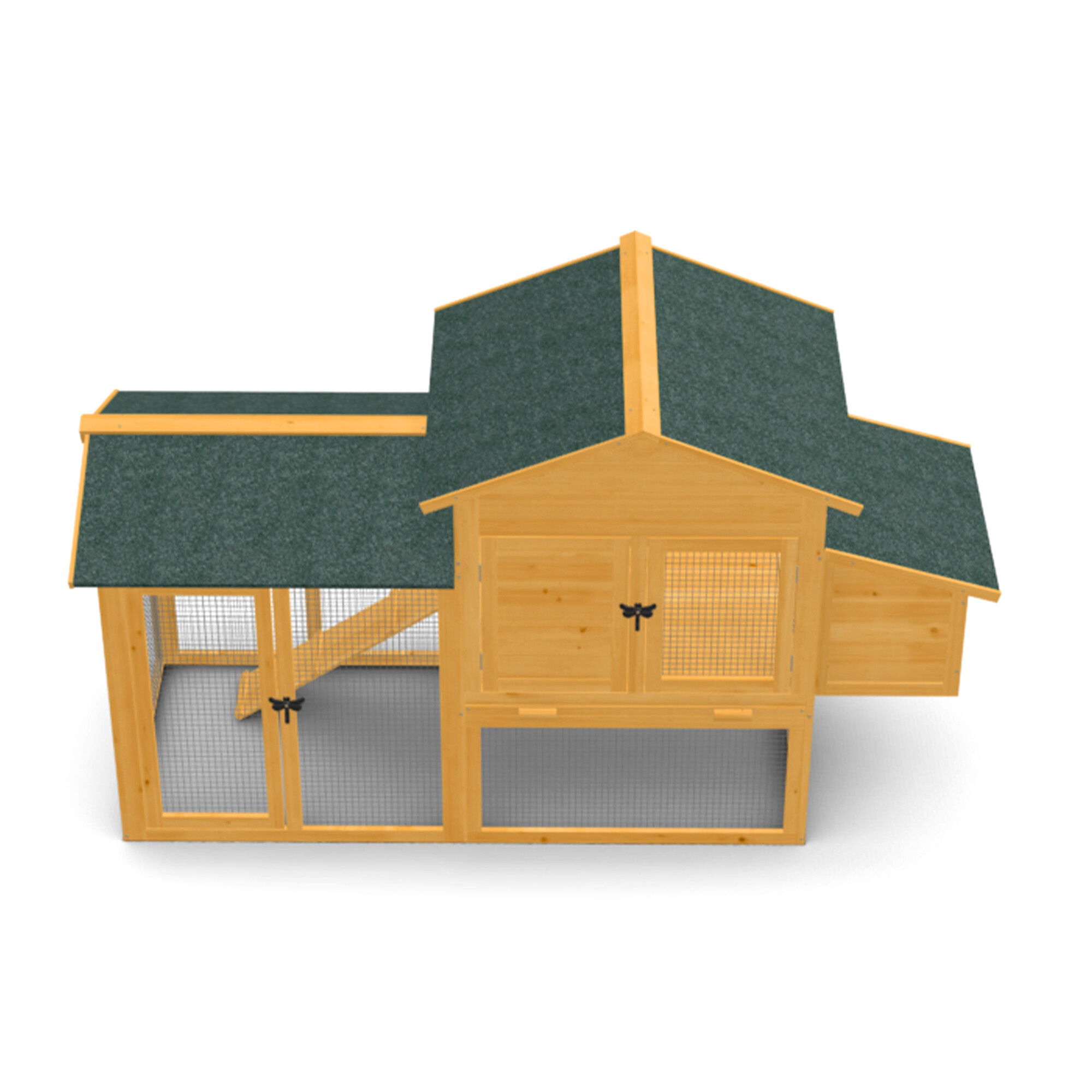 A tető kiváló minőségű zsindelyfedéssel van ellátva, amely megvédi a tyúkokat az esőtől és a hótól. Az alsó emeletről a felső emeletre egy rámpa vezet, amelyen az állatok könnyen felmászhatnak. Az ajtó könnyen becsukható és tolóreteszekkel rögzíthető.A tyúkól egyik fő előnye a lehajtható tető, amely megkönnyíti a tojásokhoz való hozzáférést.