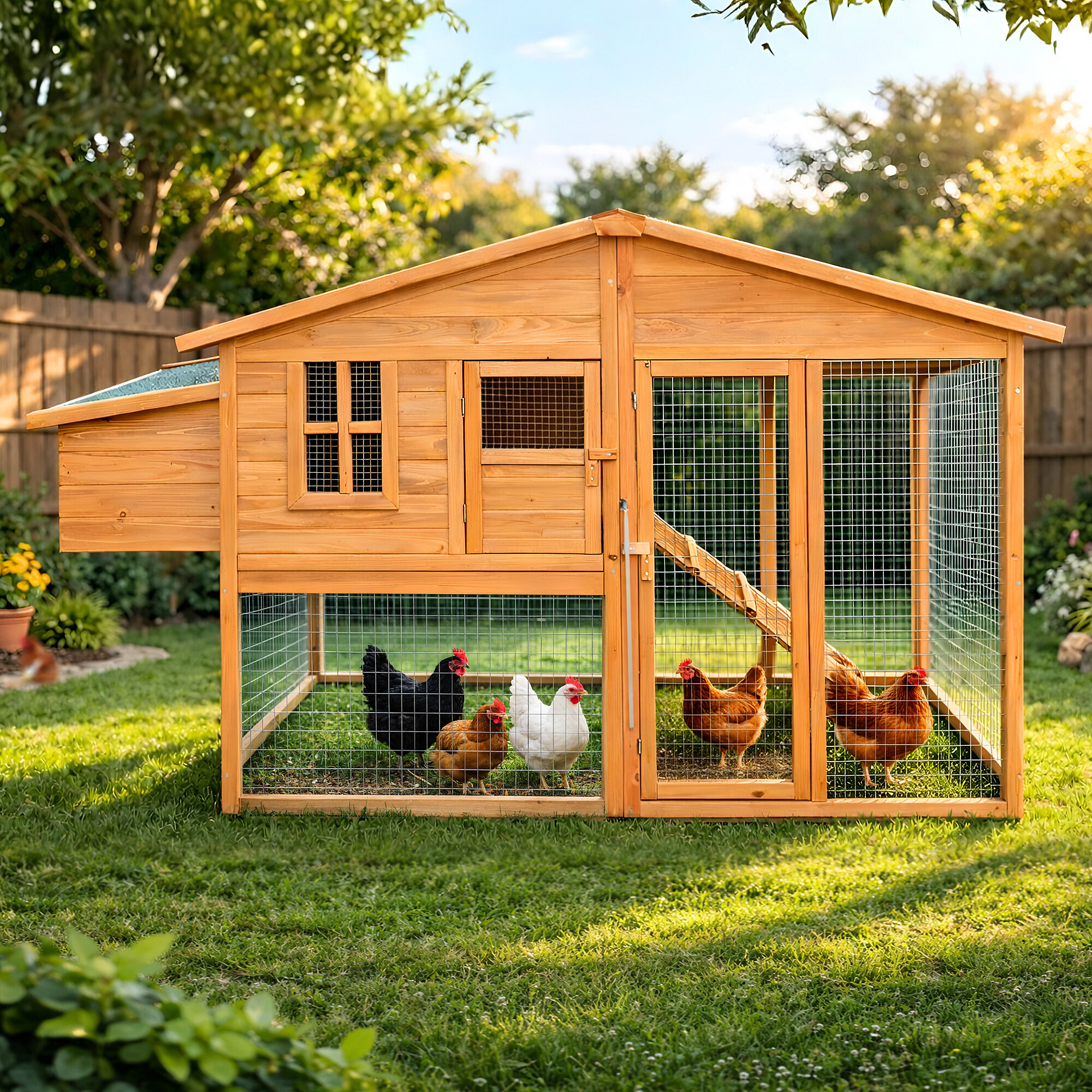 A lakóterülethez csatlakozó kifutó lehetővé teszi a tyúkok szabad mozgását.