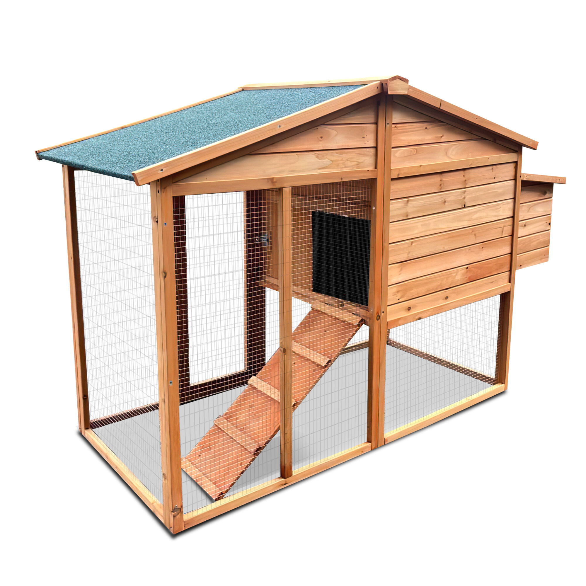 A tető kiváló minőségű zsindelyfedéssel van ellátva, amely megvédi a tyúkokat az esőtől és a hótól. Az alsó emeletről a felső emeletre egy rámpa vezet, amelyen az állatok könnyen felmászhatnak. Az ajtó könnyen becsukható és tolóreteszekkel rögzíthető.A tyúkól egyik fő előnye a lehajtható tető, amely megkönnyíti a tojásokhoz való hozzáférést.