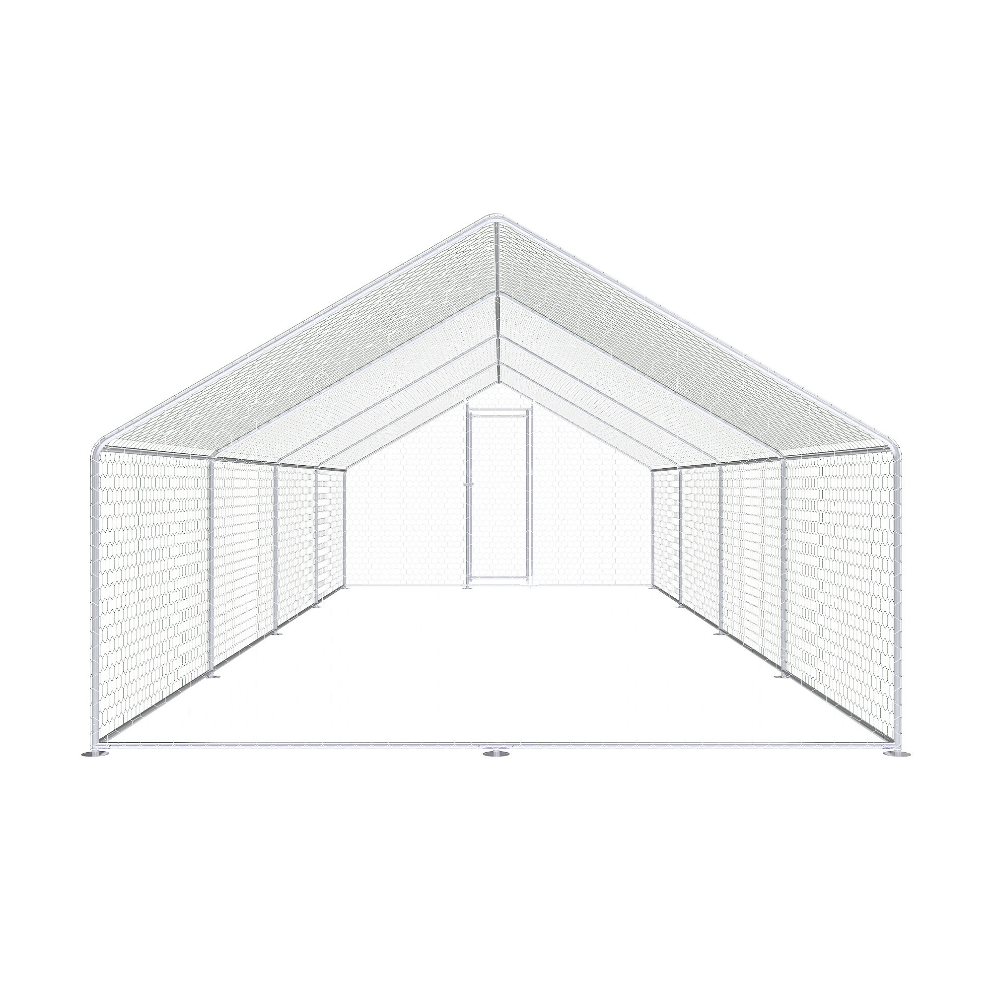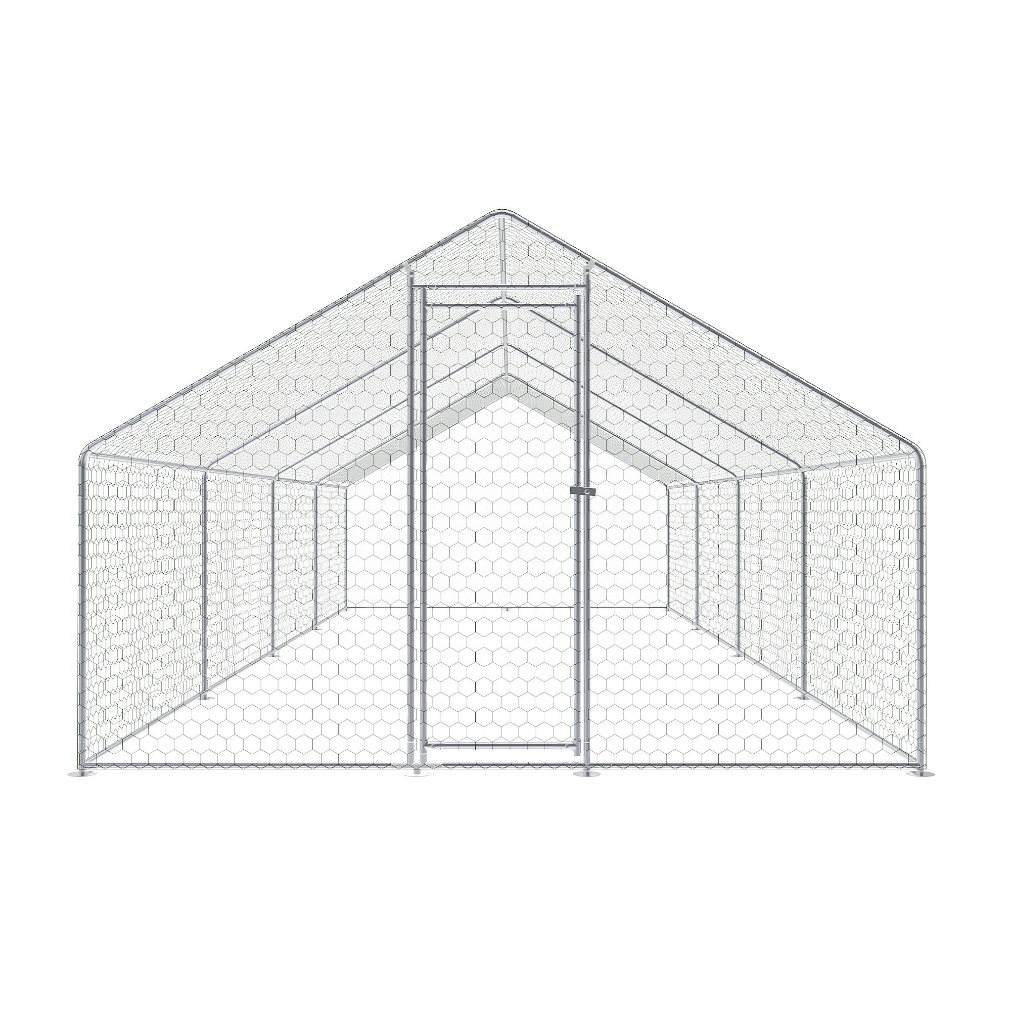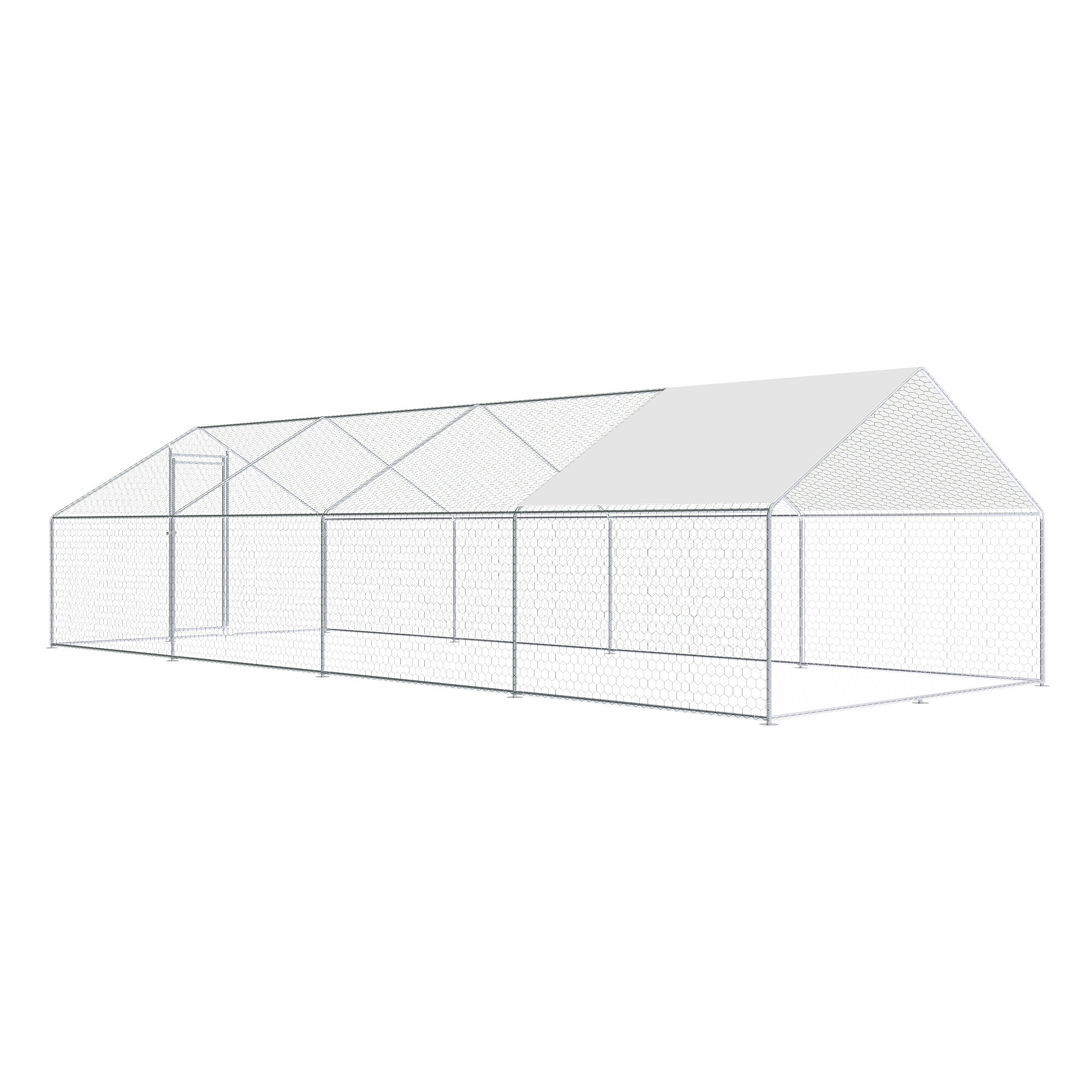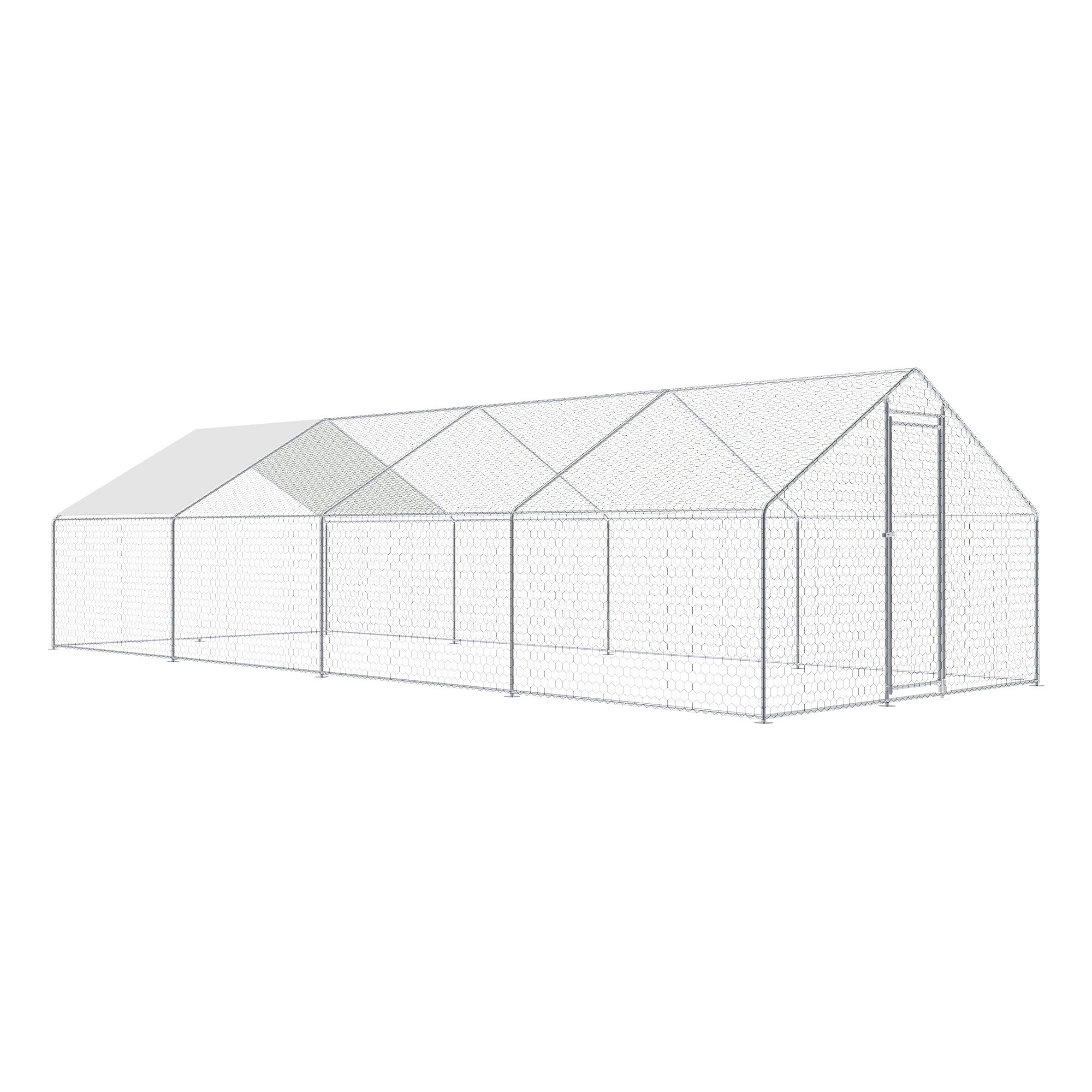 A baromfi kifutó horganyzott acélból készült, szilárd szerkezettel rendelkezik, amely korrózióálló és alkalmas hosszú távú kültéri használatra. Ennek köszönhetően a szerkezet megőrzi funkcionalitását még rendszeres időjárási kitettség esetén is. Az egész kifutó horganyzott hálóval van kiegészítve, amely védőhálóként szolgál a tyúkok, kacsák és más apró állatok számára, és egyben segít megvédeni az állatokat a ragadozóktól.