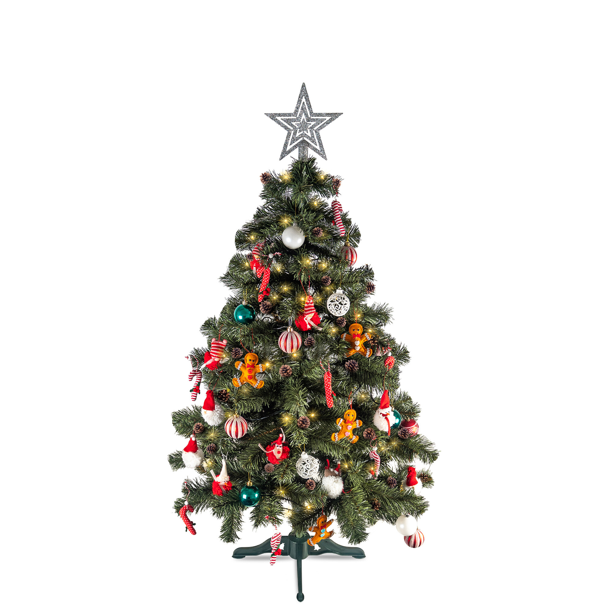 A karácsonyfa csomag része a tobozok és a négykarú műanyag állvány is.