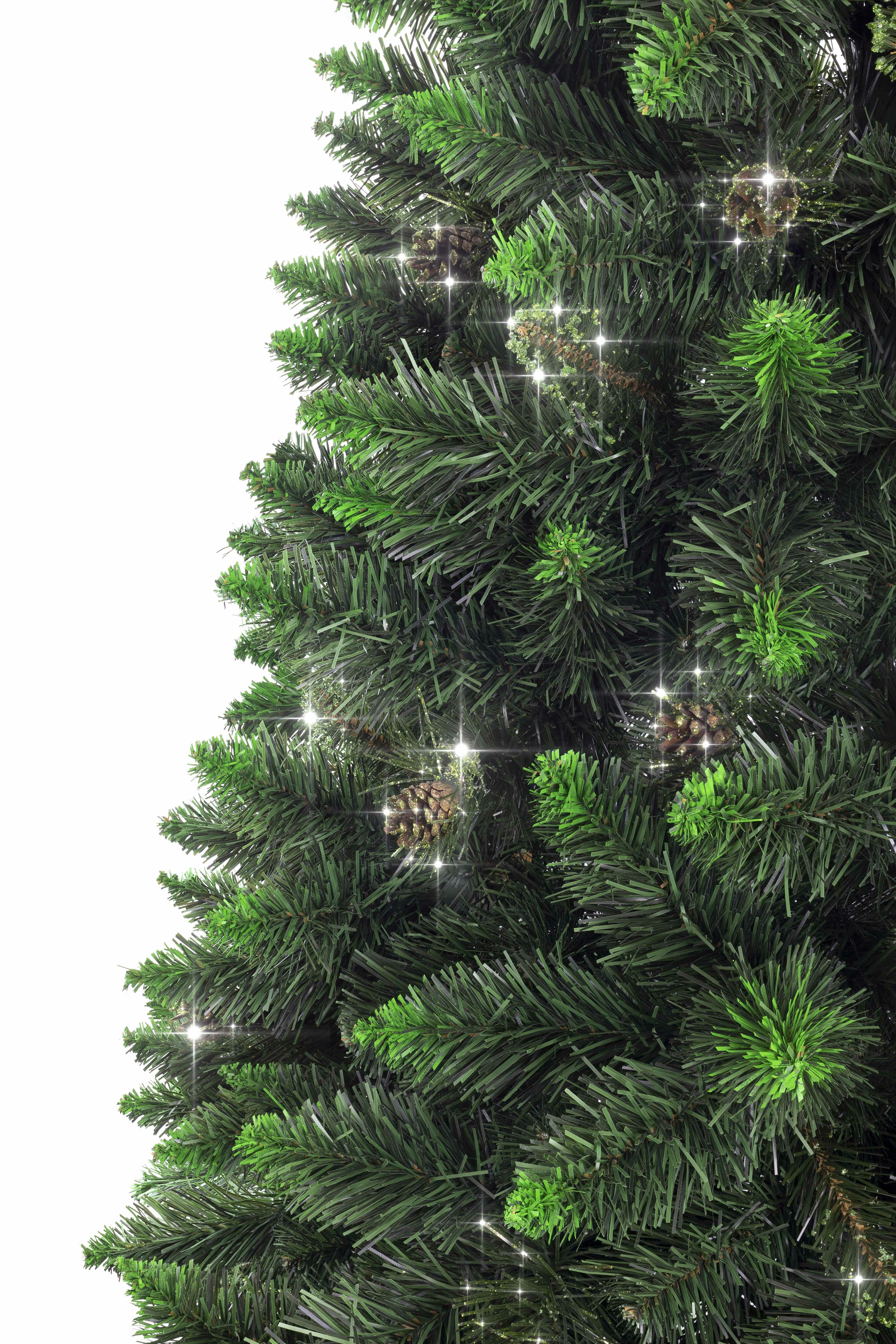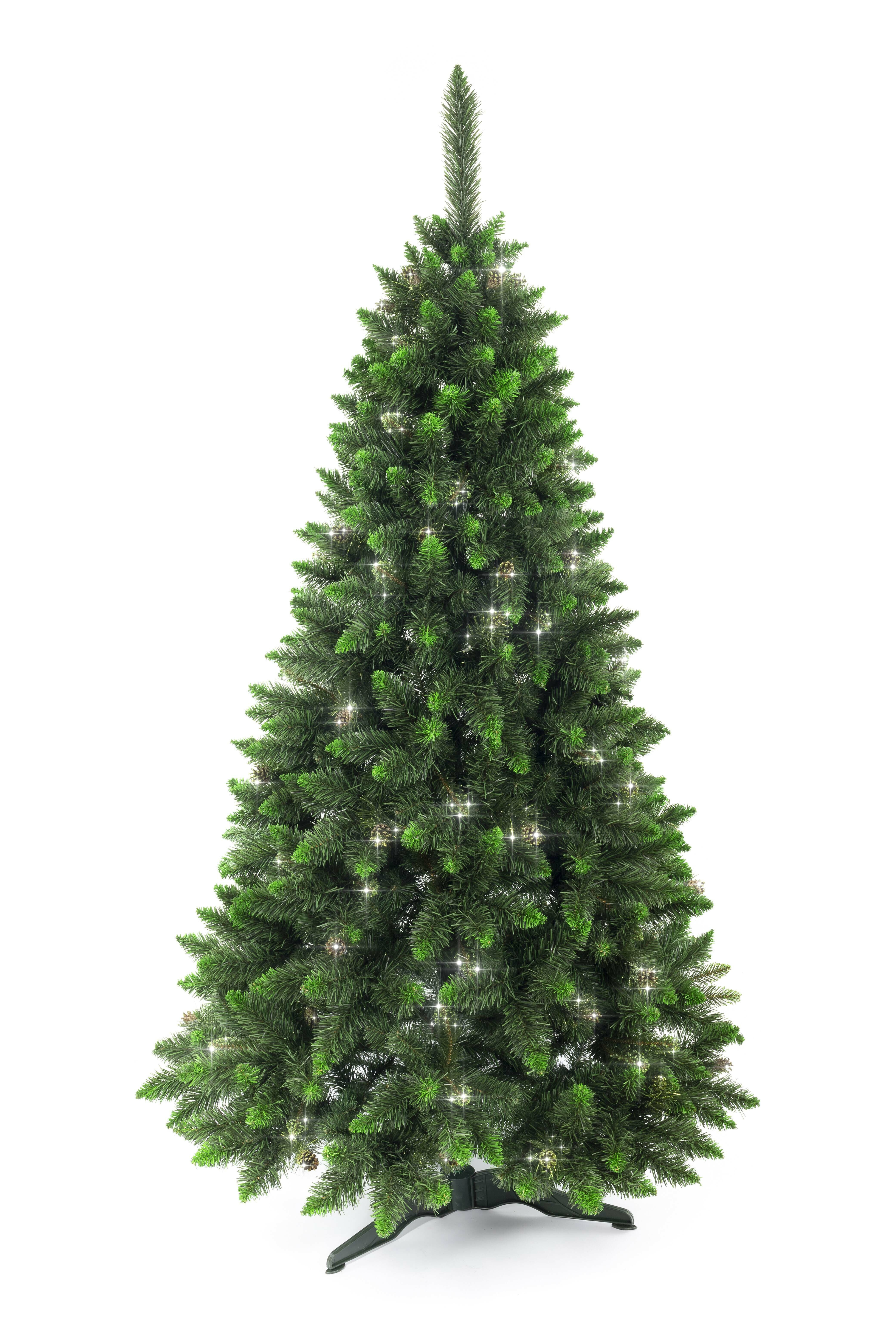 Luxusos műfenyő, amelynek teljes magassága 150 cm, természetes megjelenésű, gyönyörű zöld, sűrű fenyő, amelyet zöld csillámok díszítenek.