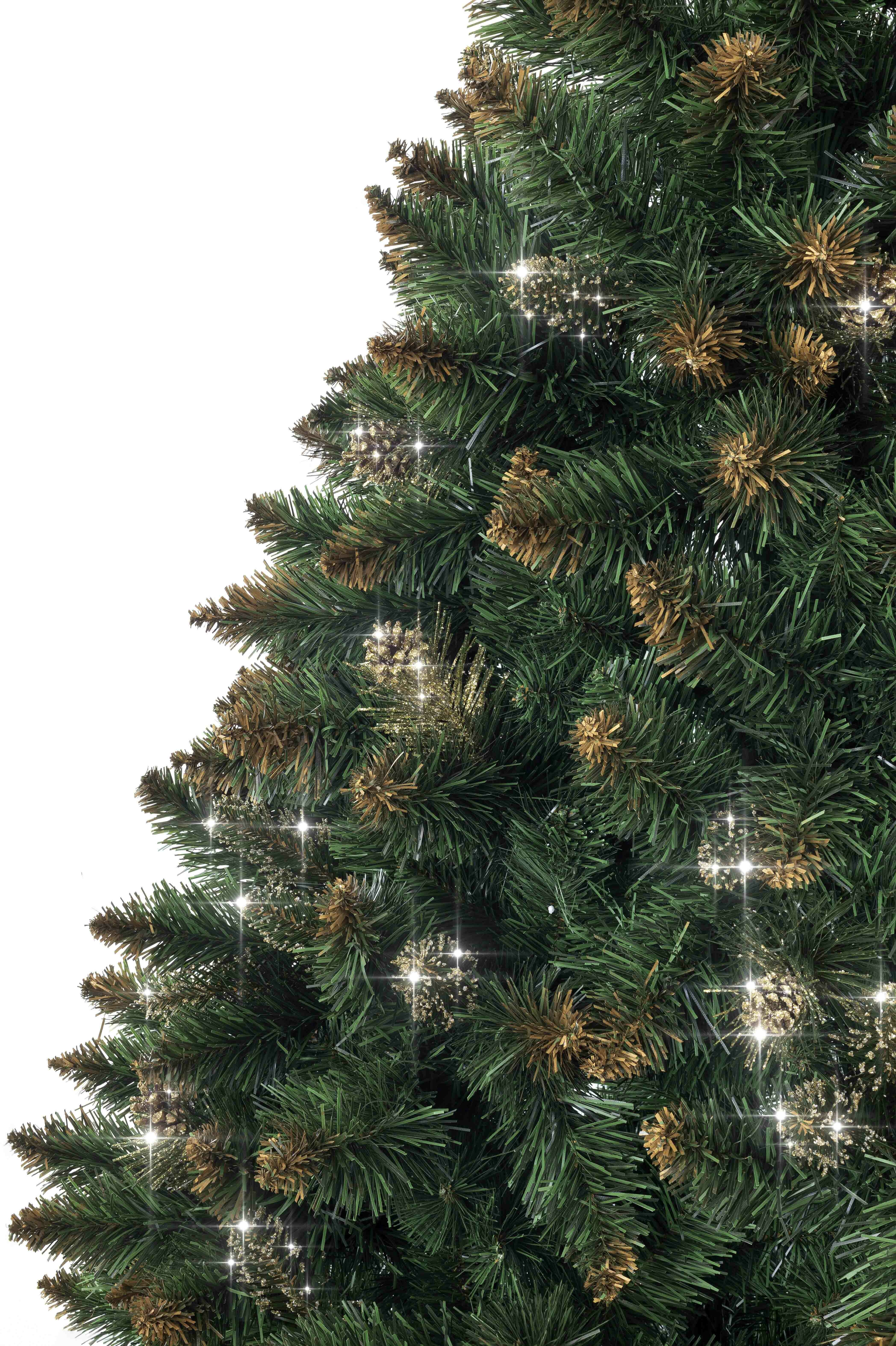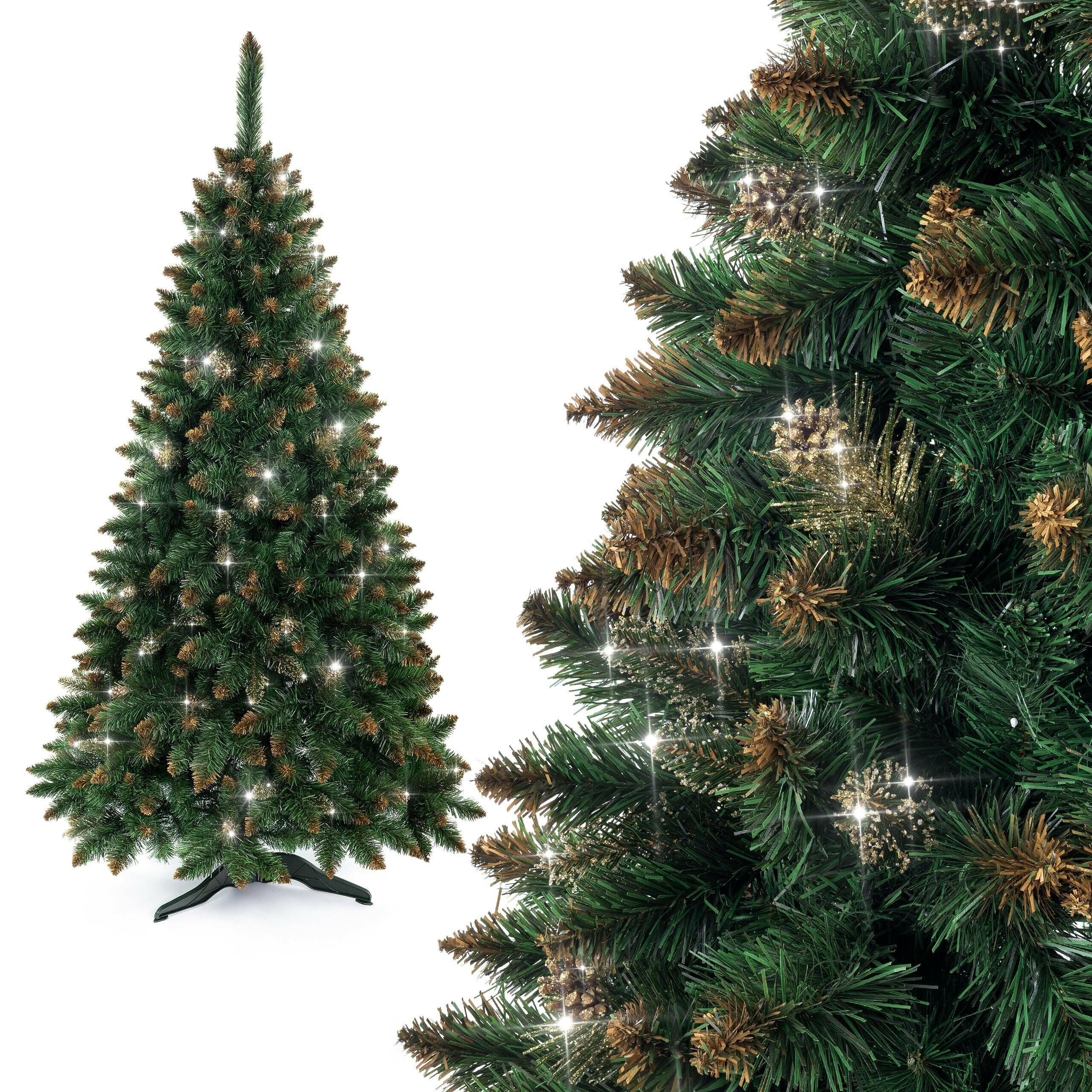 Luxusos műfenyő, amelynek teljes magassága 150 cm, természetes megjelenésű, gyönyörű zöld, sűrű fenyő, amelyet arany csillámok díszítenek.