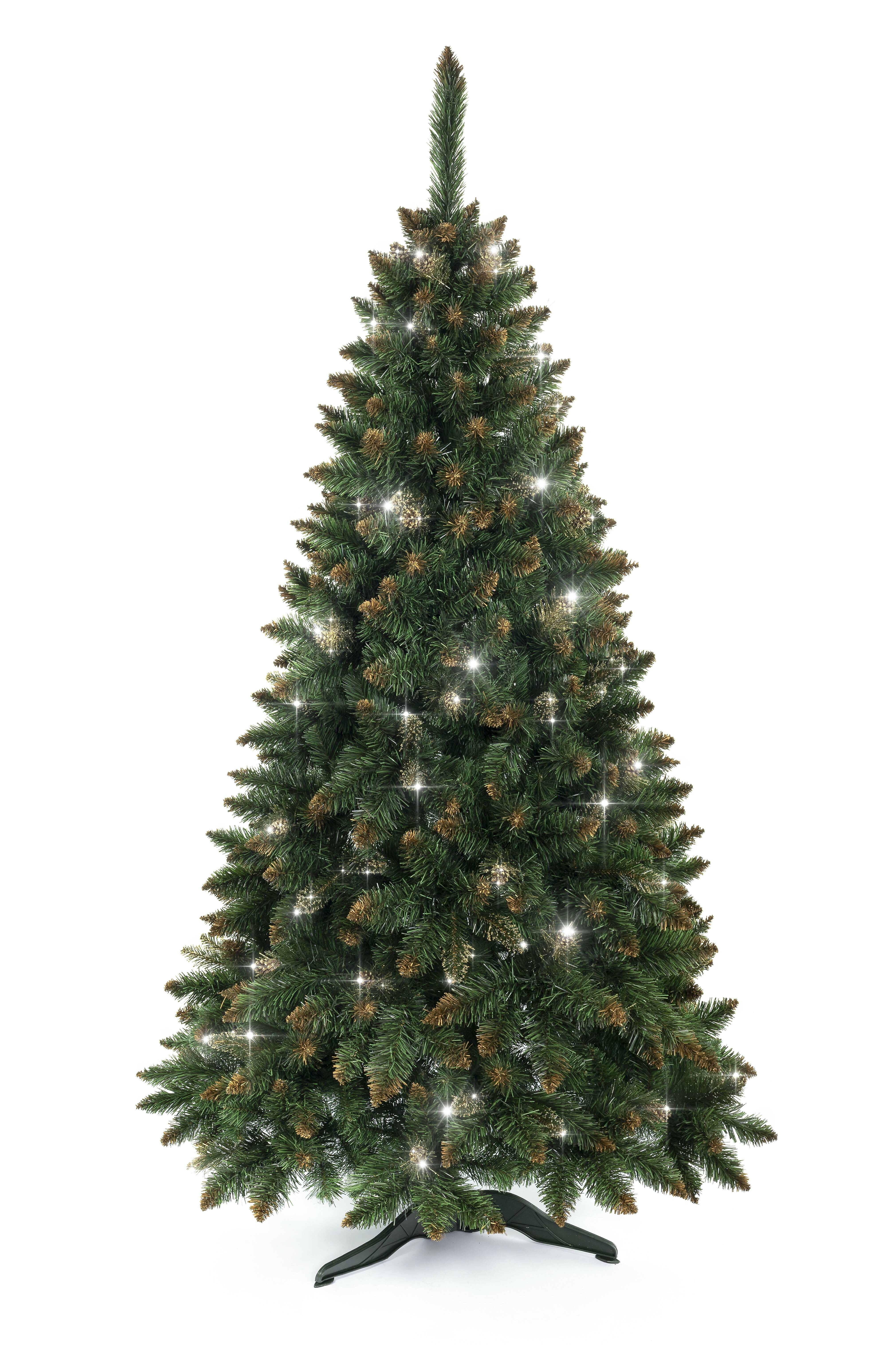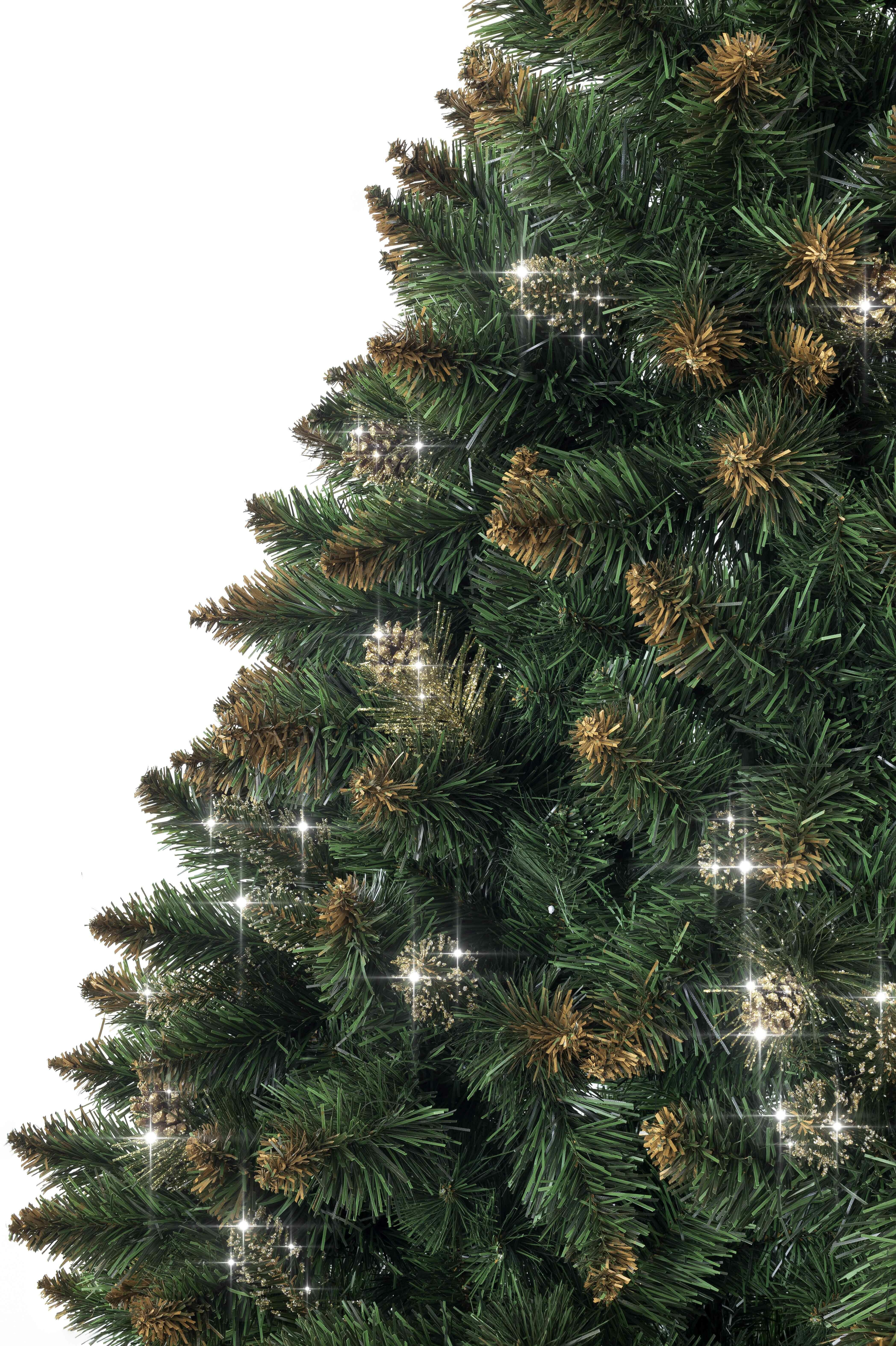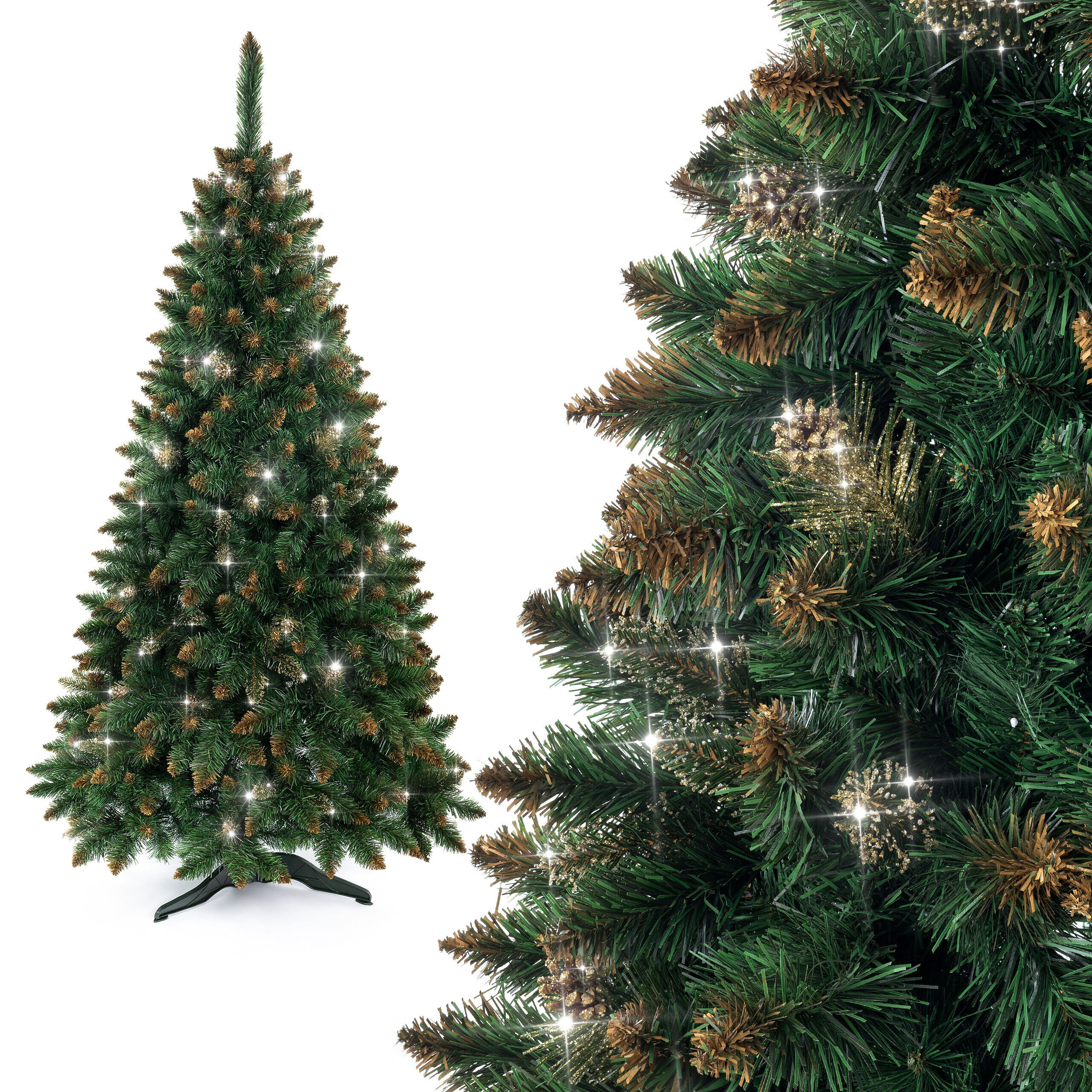 Luxusos műfenyő, amelynek teljes magassága 180 cm, természetes megjelenésű, gyönyörű zöld, sűrű fenyő, amely arany csillámokkal van díszítve.