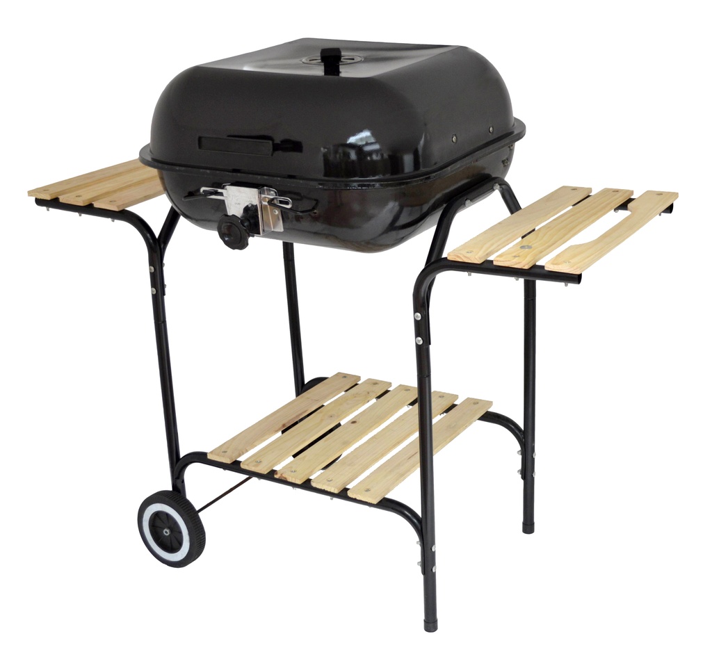 A grillsütő 2 fa tároló polcot is tartalmaz az oldalán és 1et a grillsütő alatt.A grill magassága könnyen állítható.