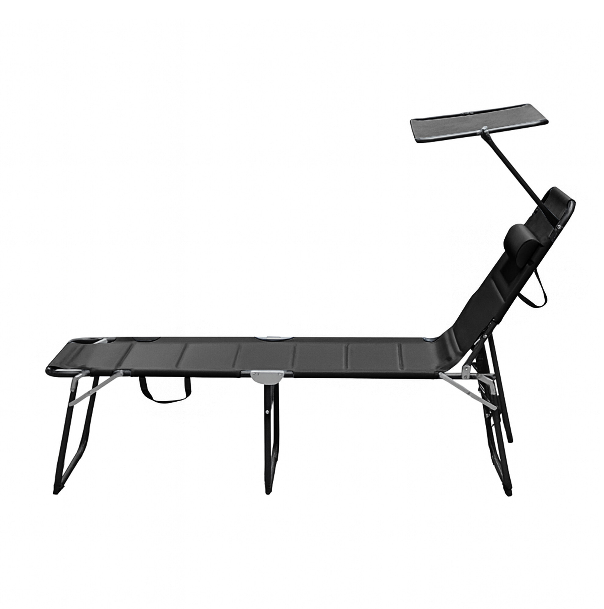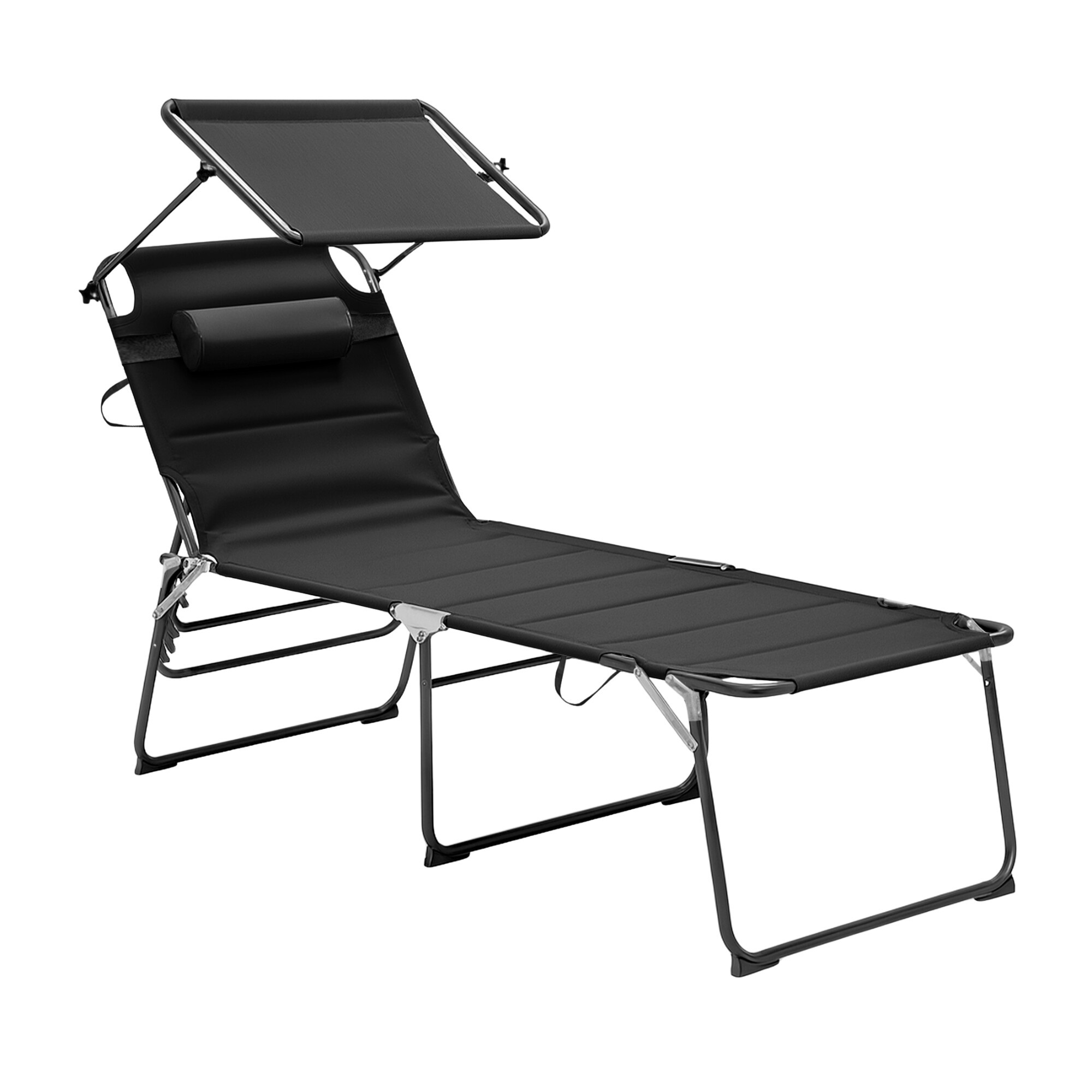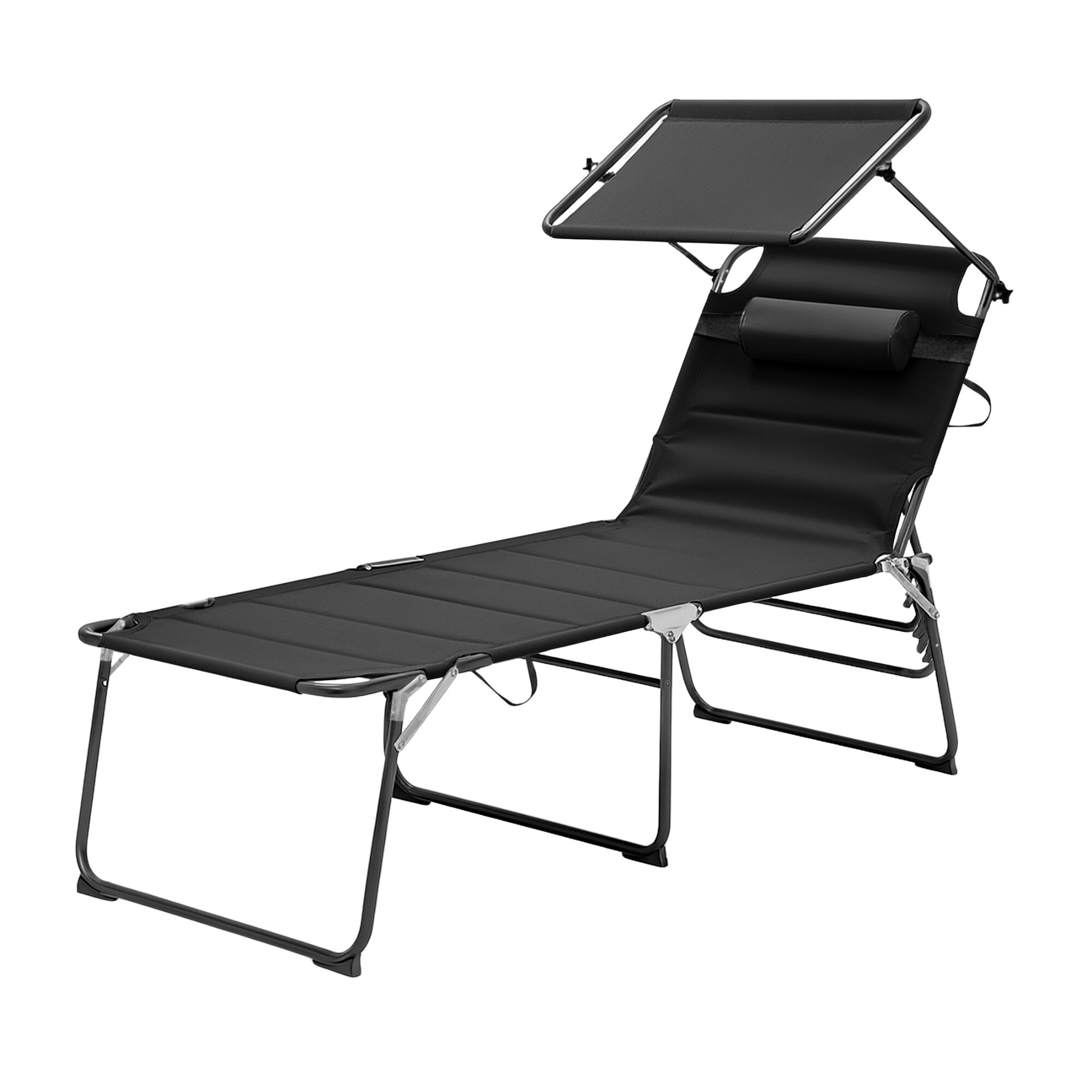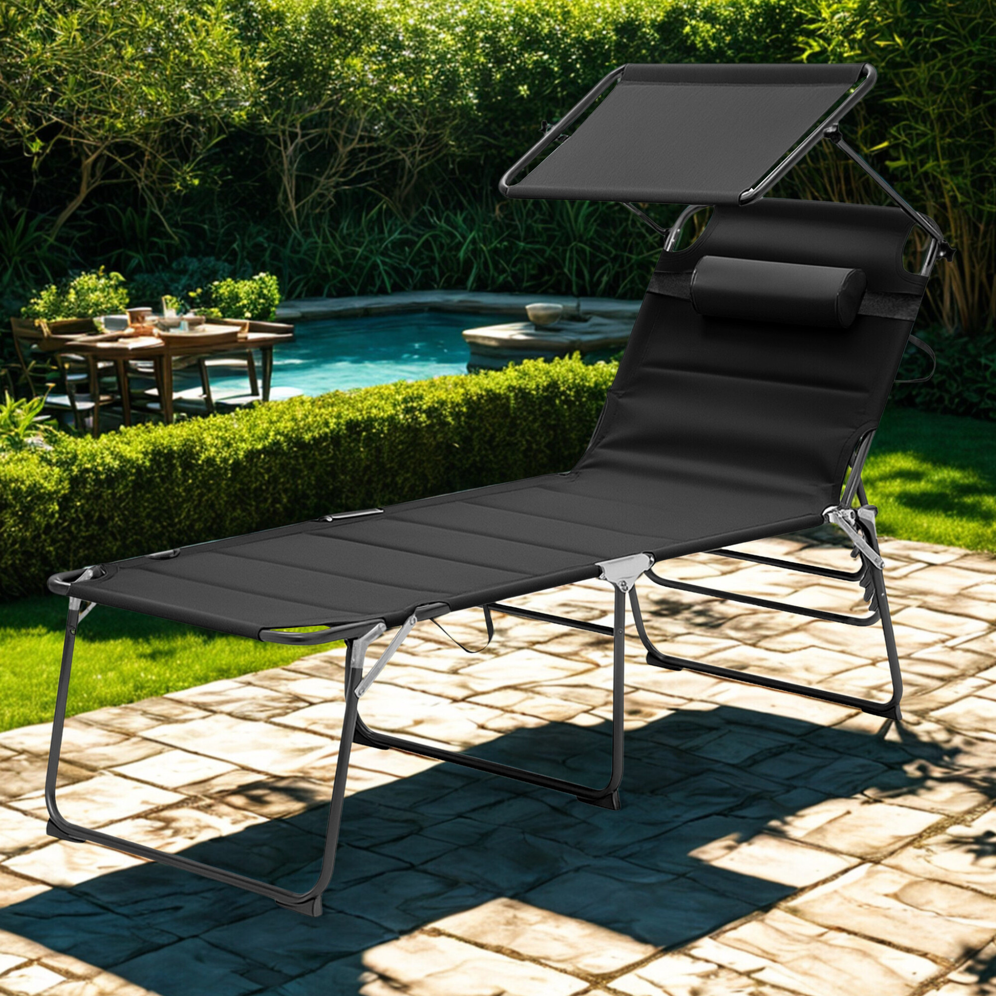 Összecsukható kerti nyugágy napellenzővel, párnázással és megerősített alumínium szerkezettel, modern dizájnnal, alkalmas kertekbe, kempingezéshez vagy strandokra.