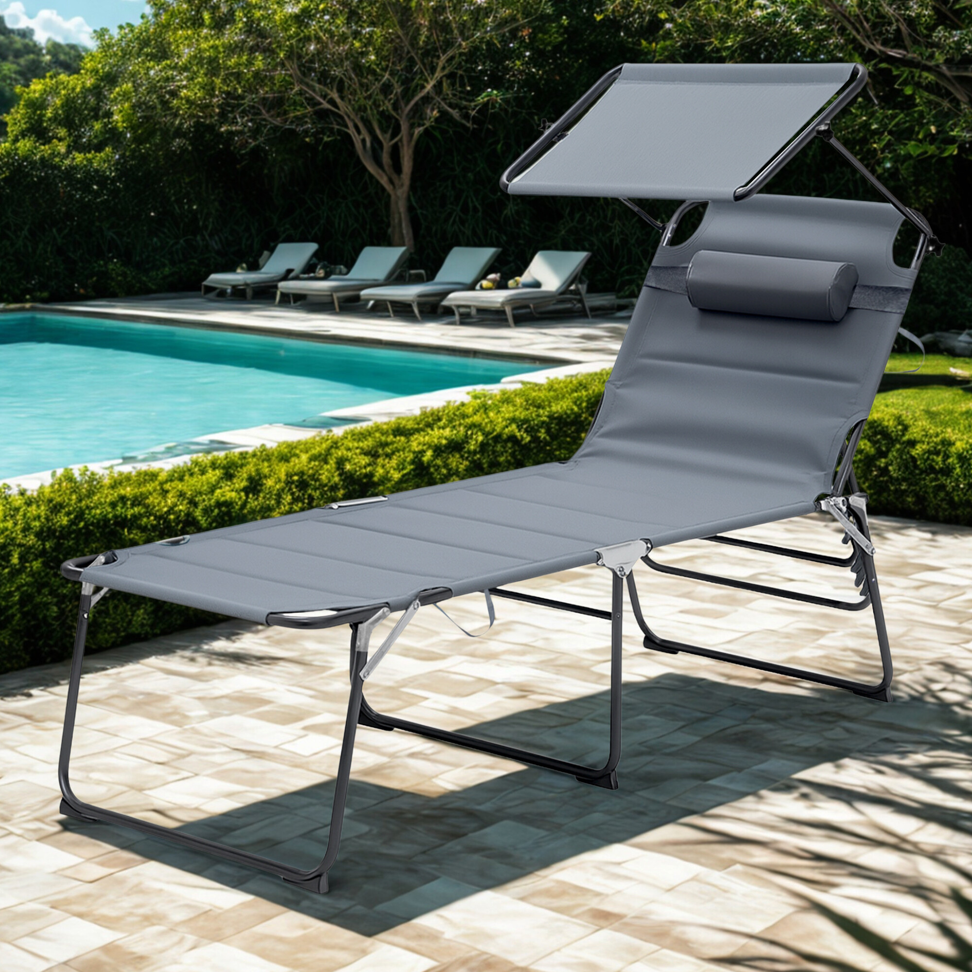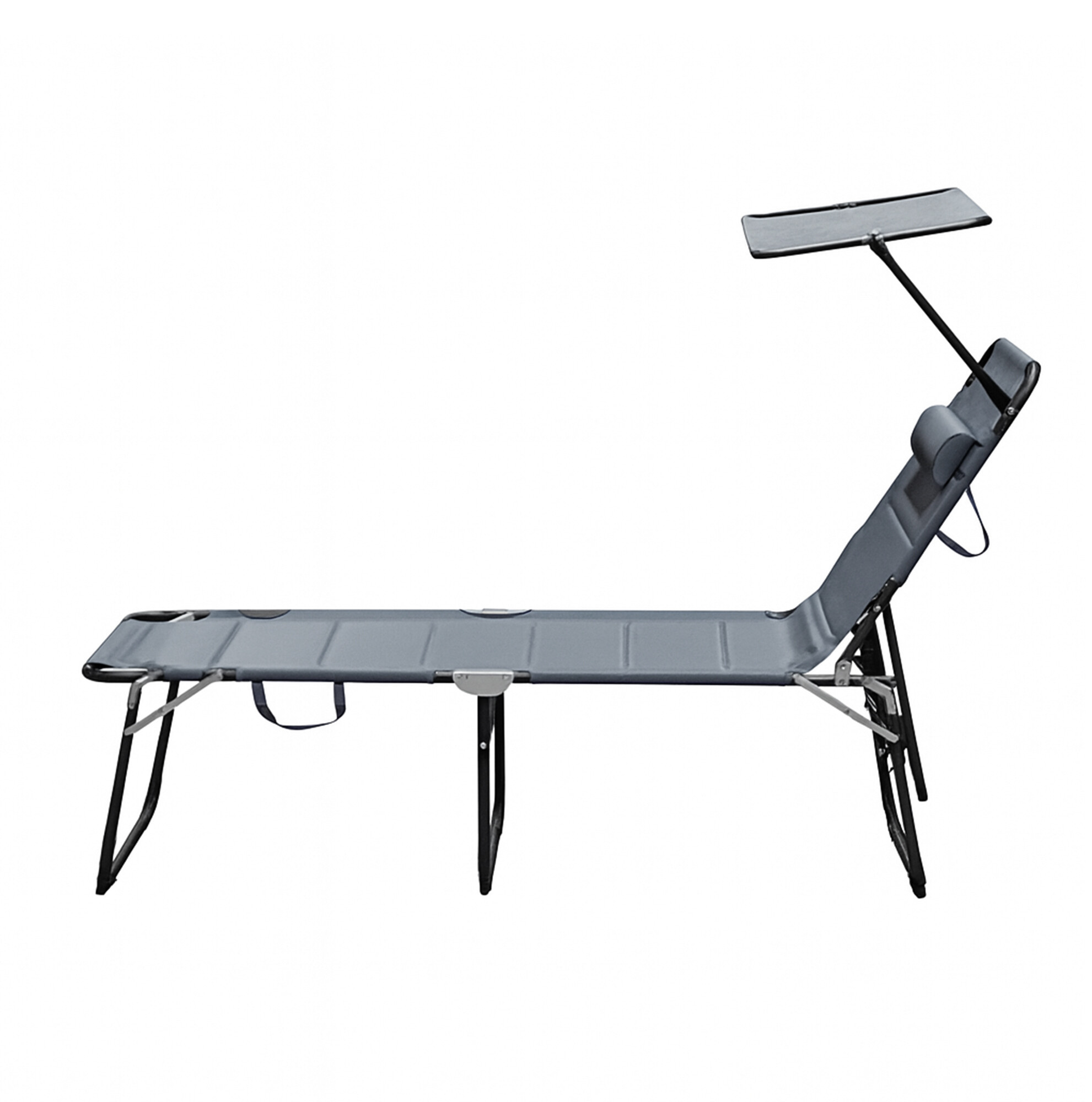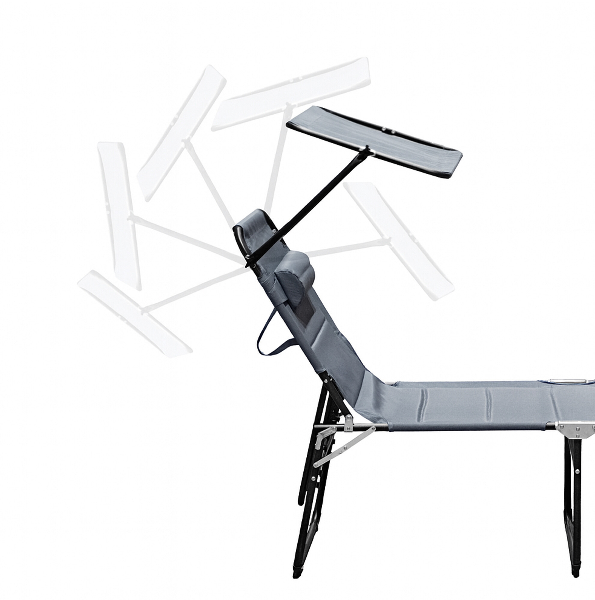 Összecsukható kerti nyugágy napellenzővel, párnázással és megerősített alumínium szerkezettel, modern dizájnnal, alkalmas kertekbe, kempingezéshez vagy strandokra.