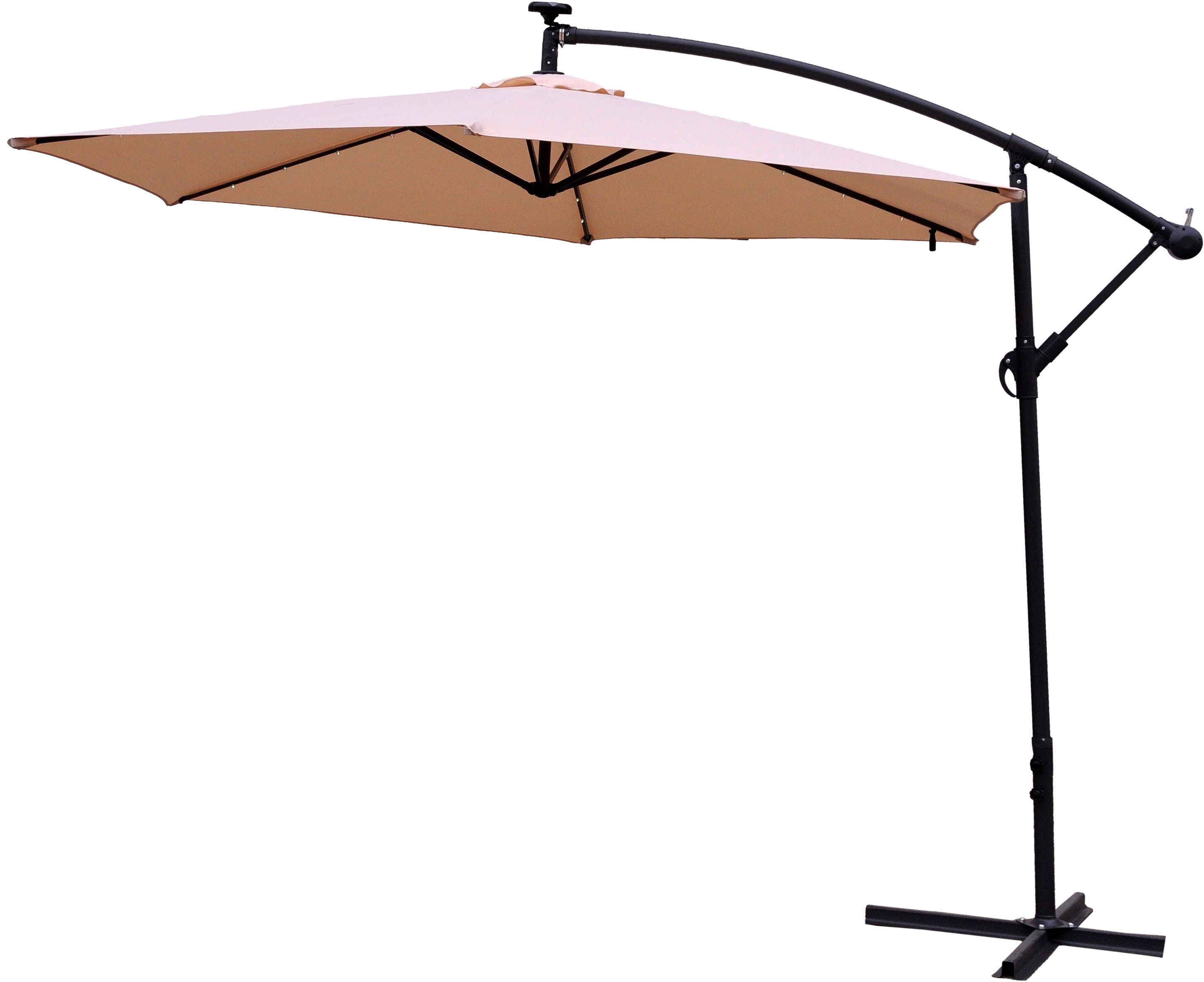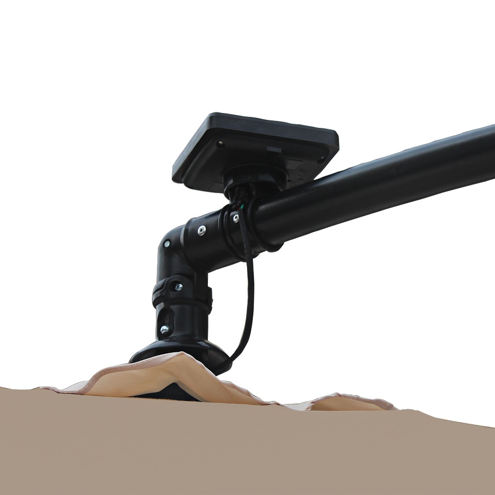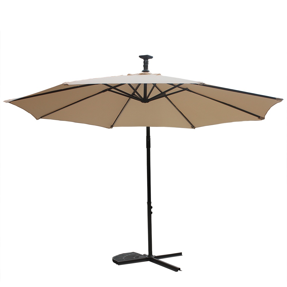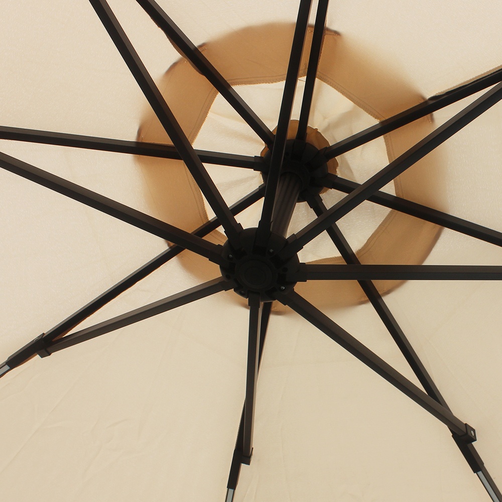 Praktikus, LED-es háttérvilágítással ellátott, tartós poliészterből készült kerti konzolos napernyő, melynek lába az árnyékolt területen kívül helyezkedik el.