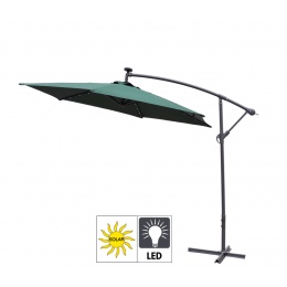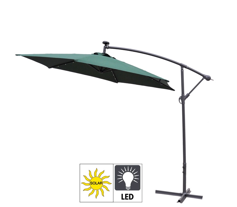 Praktikus, LED-es háttérvilágítással ellátott, tartós poliészterből készült kerti konzolos napernyő, melynek lába az árnyékolt területen kívül helyezkedik el.