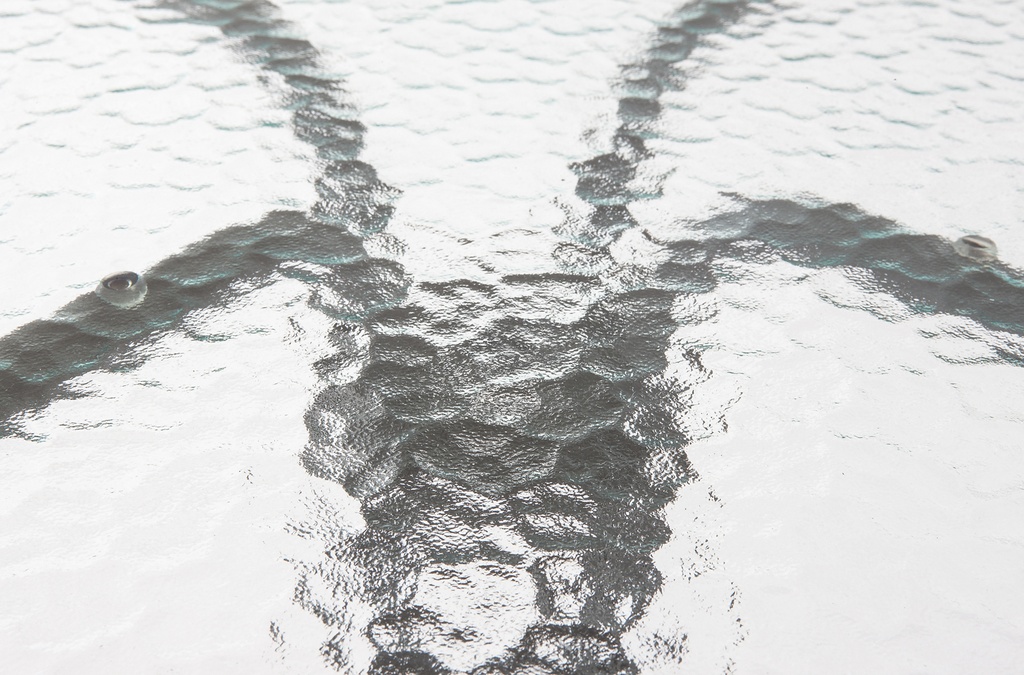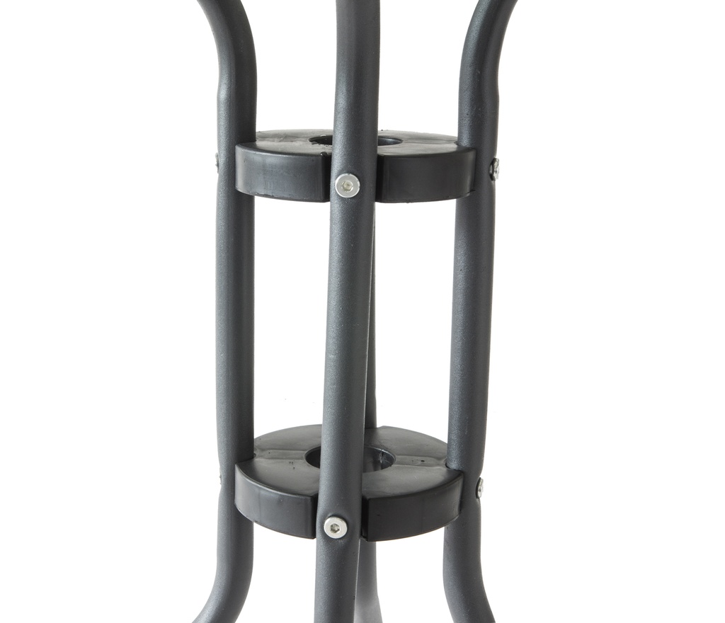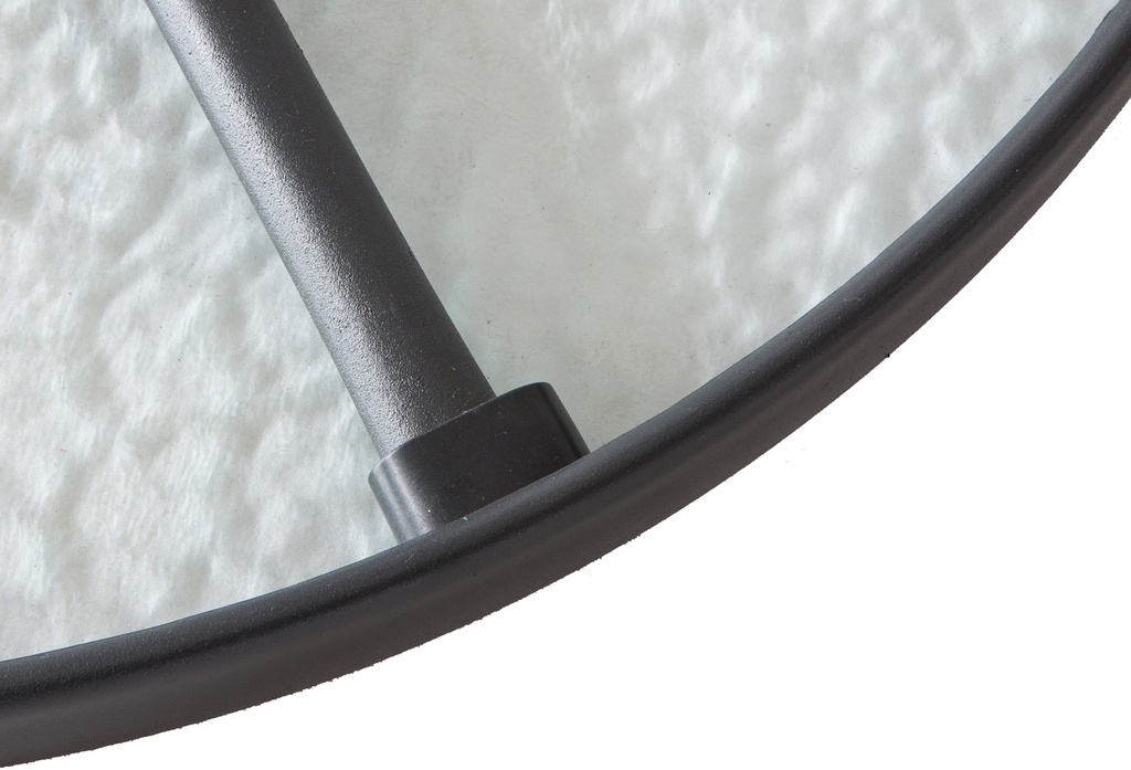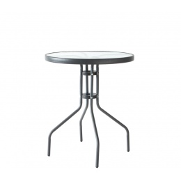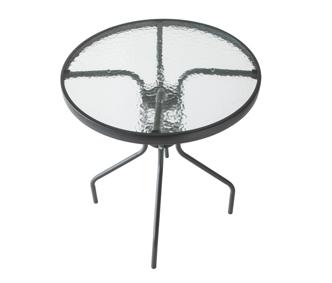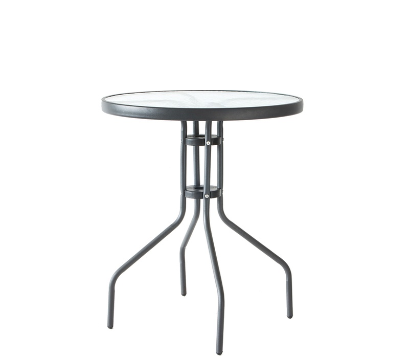 Kerti asztal tömör fémvázzal és recézett üveglappal, modern kialakításban, kertekbe alkalmas, teraszok, kávézók, pavilonok, erkélyek vagy strandok.