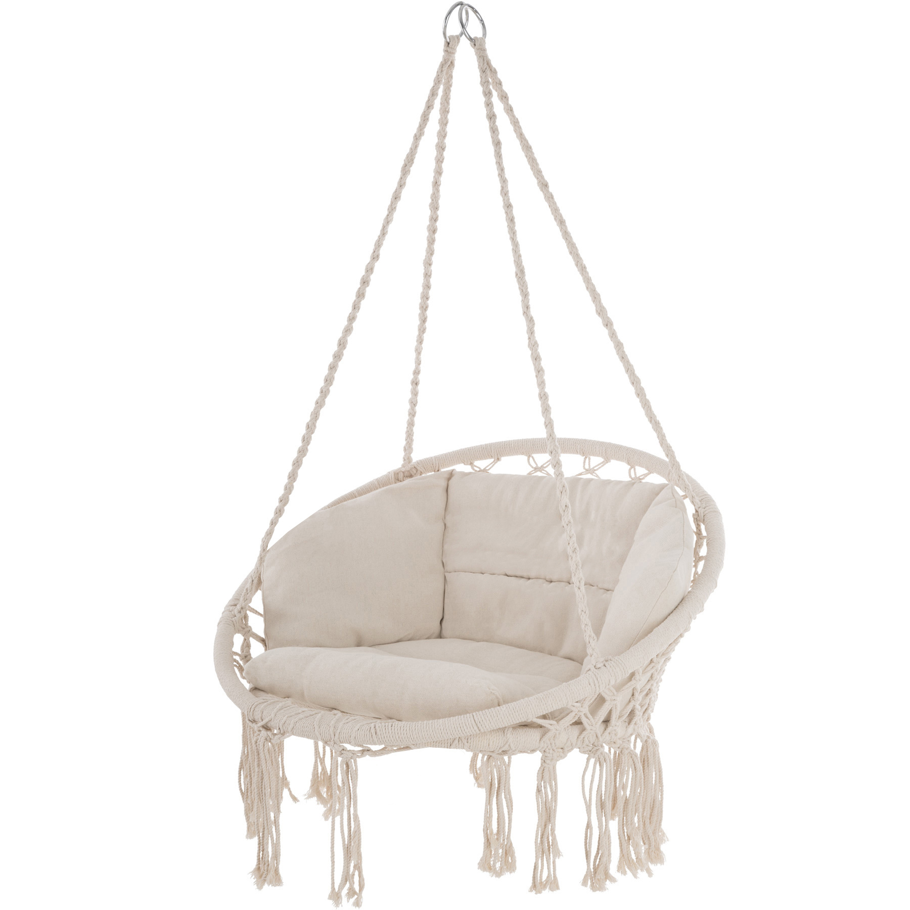 Az ülőrész stabil fémgyűrűkkel van rögzítve, így a szék szinte bárhol felakasztható. Az ülőrész erős fonott kötélből készült.