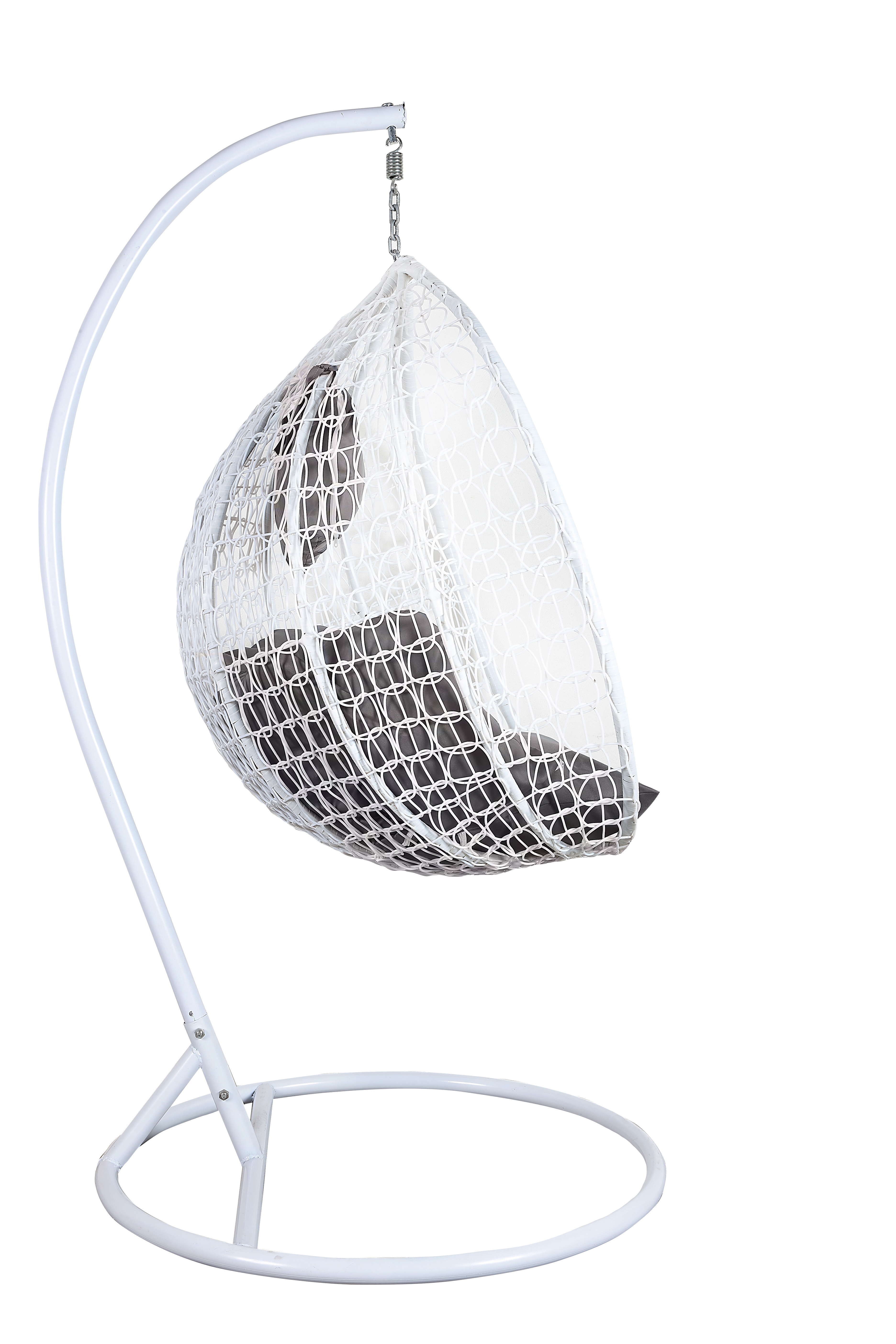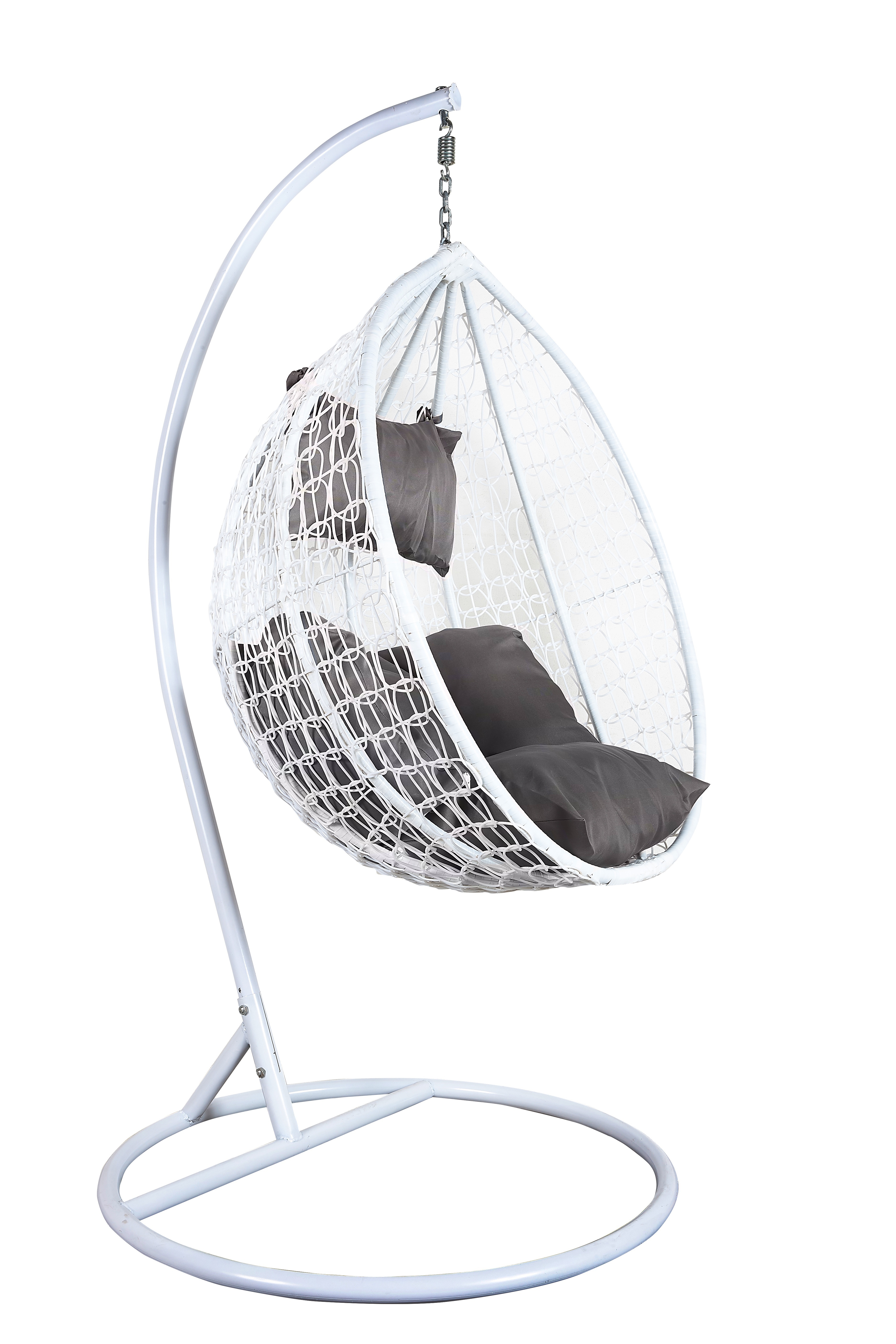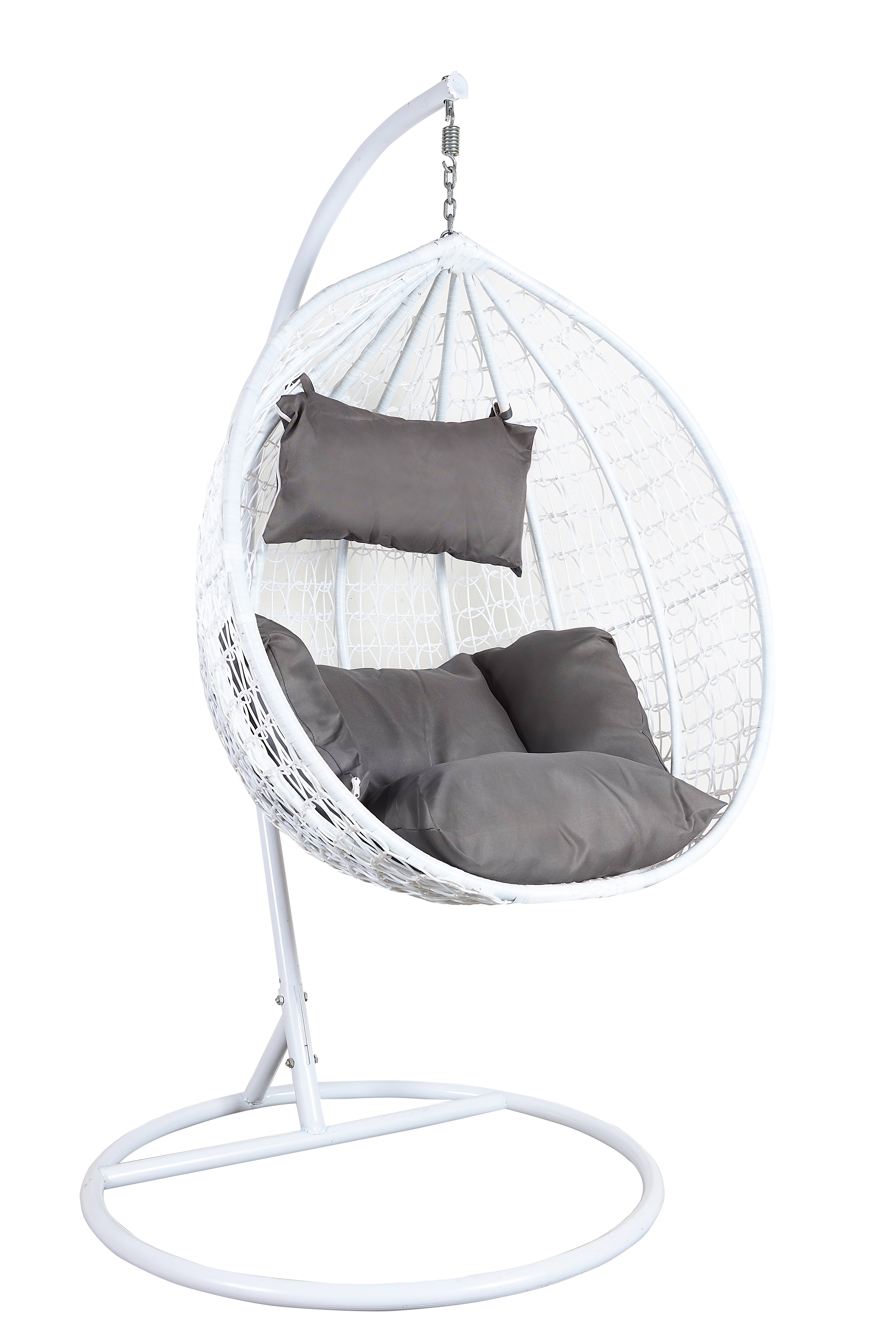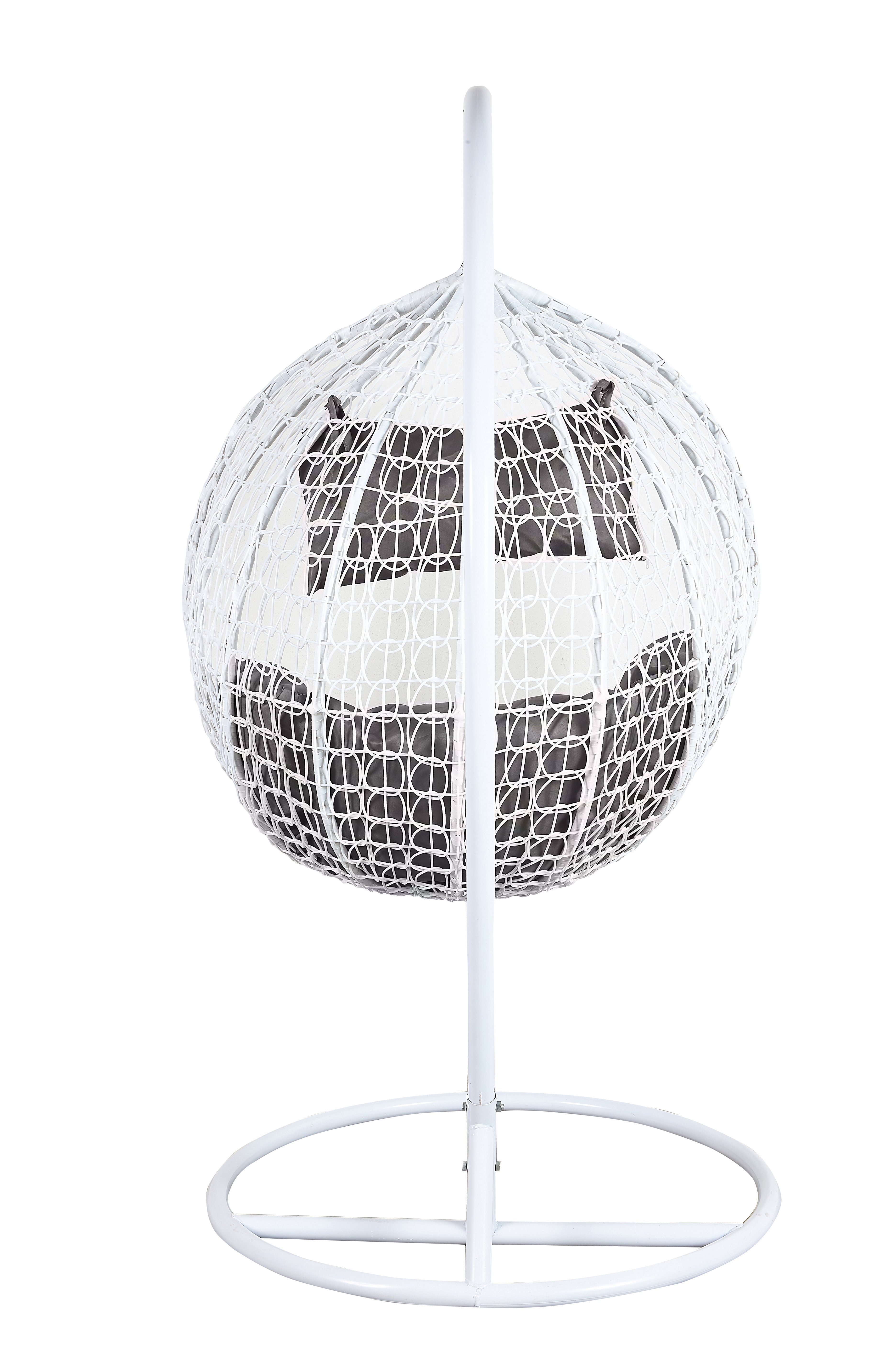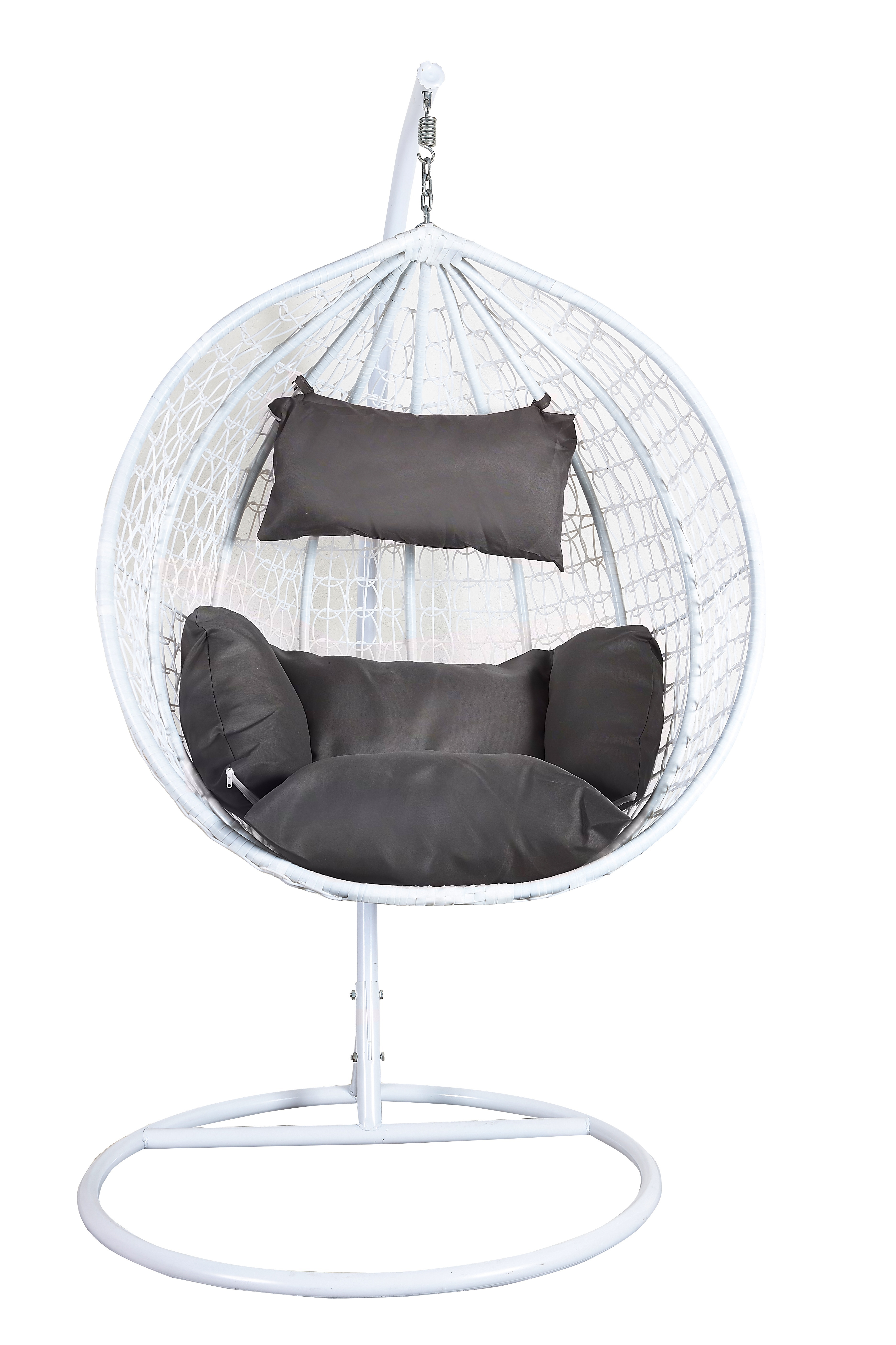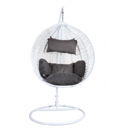 Függő karosszék stabil fémszerkezettel és műrattanból dekoratívan szőtt ülőfelülettel.A függőszék kényelmes párnákat is tartalmaz, amelyek vízállóak.