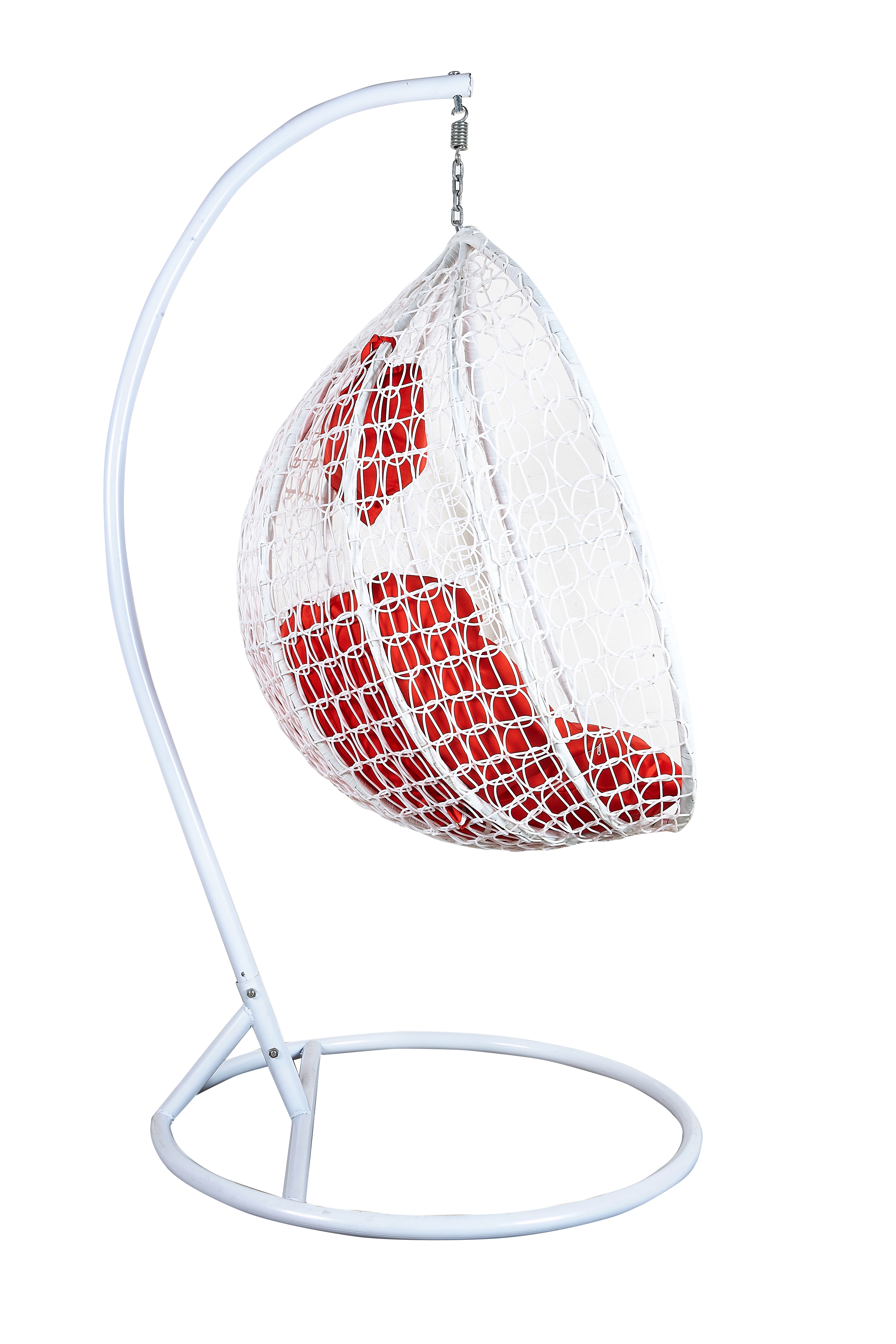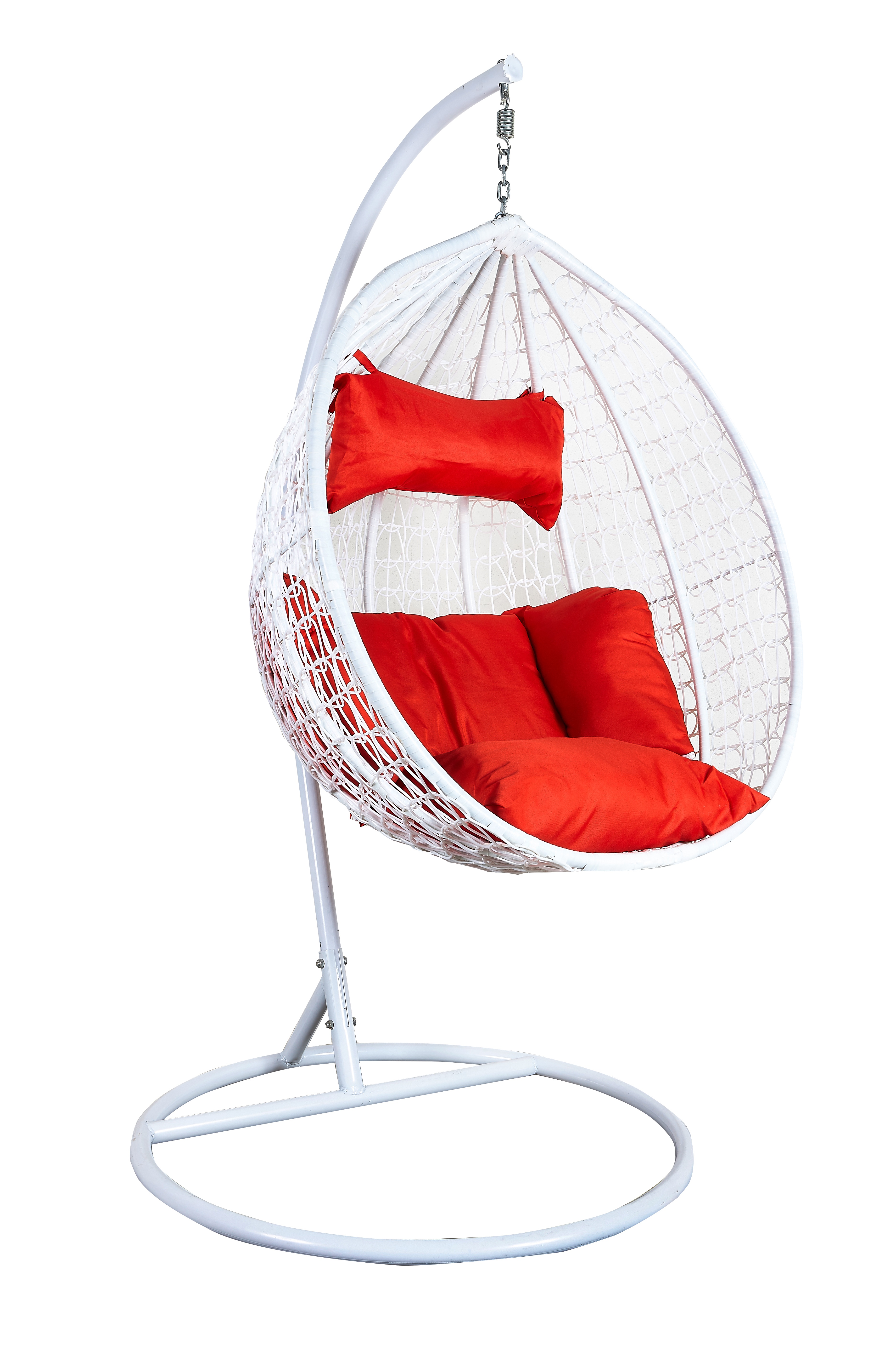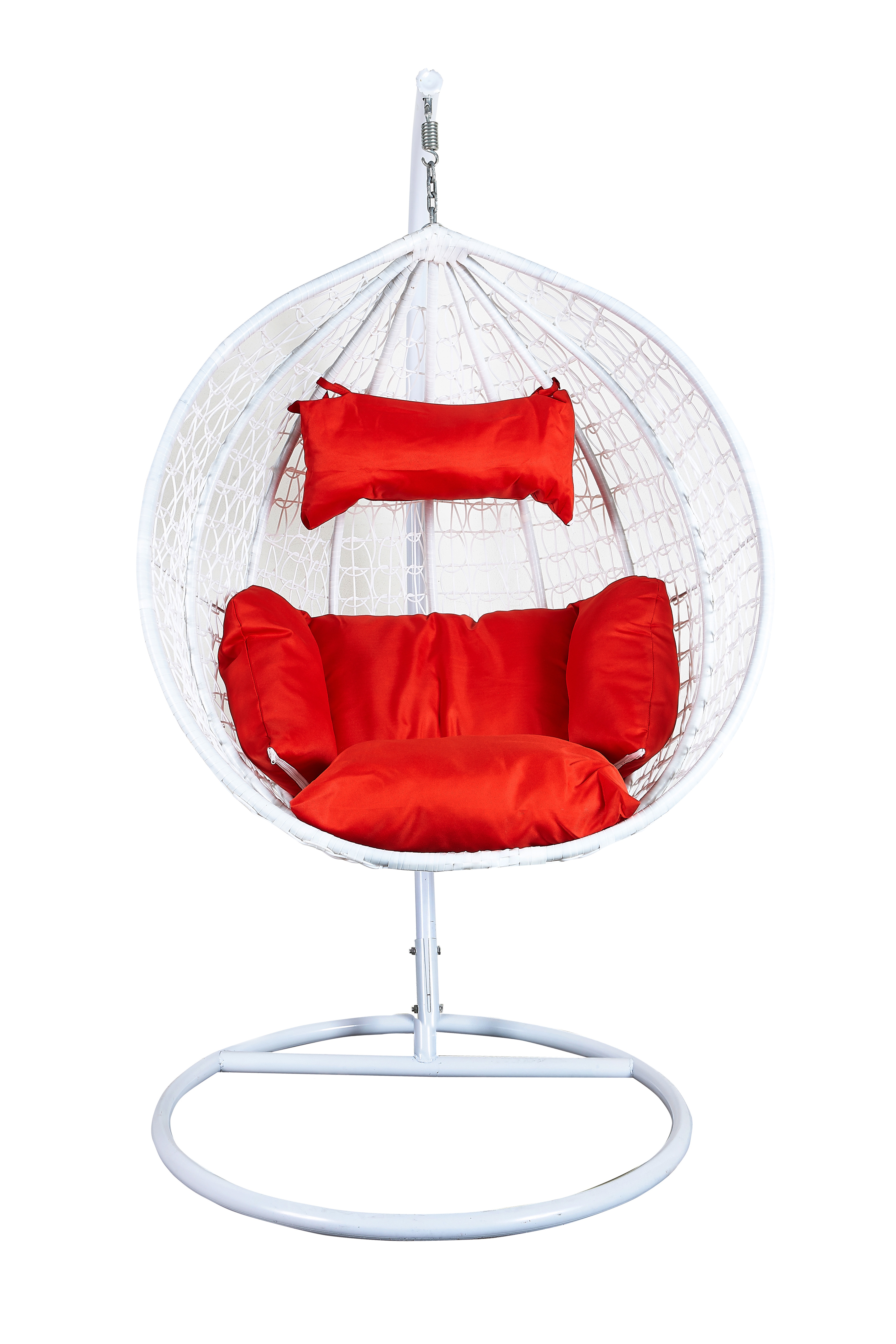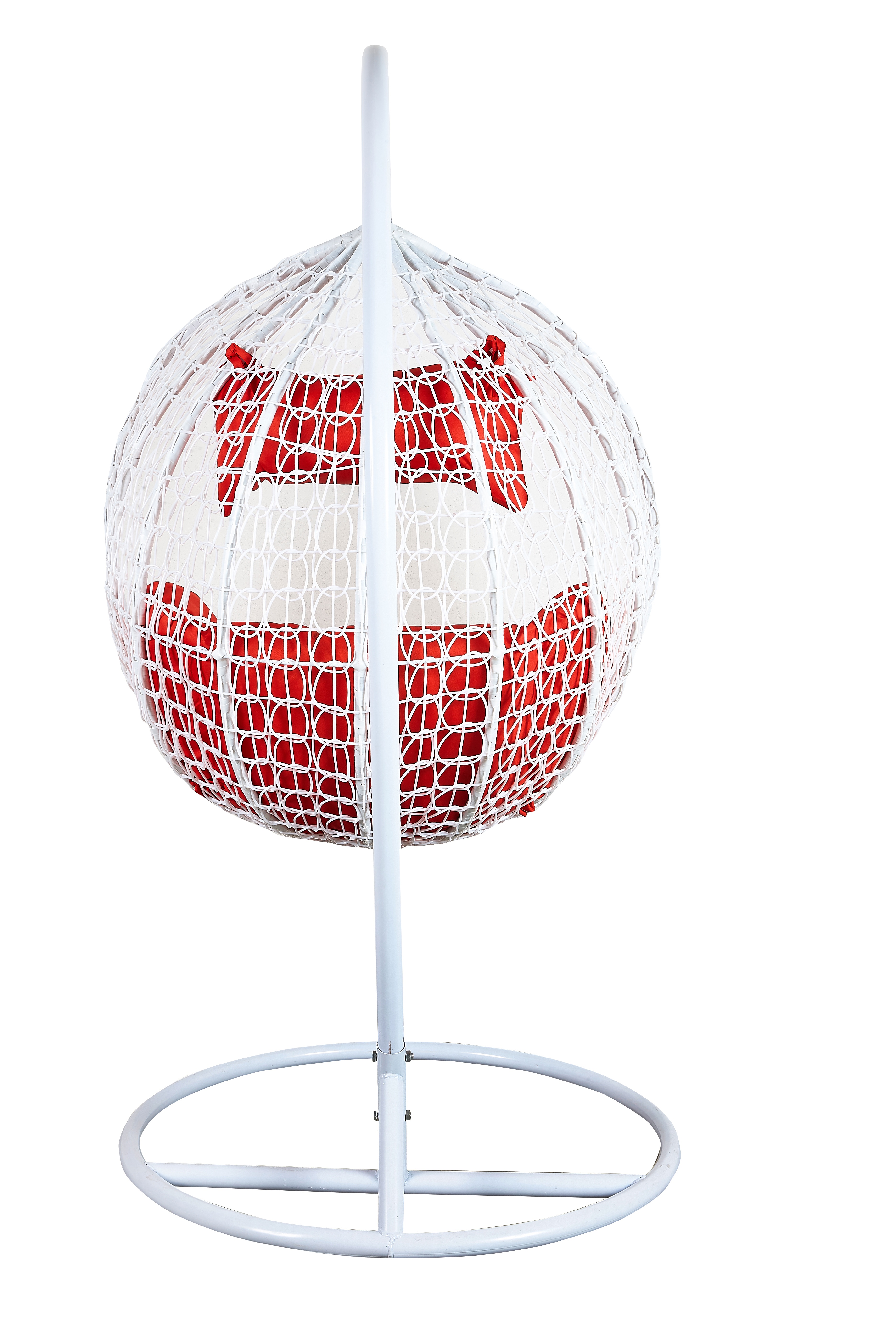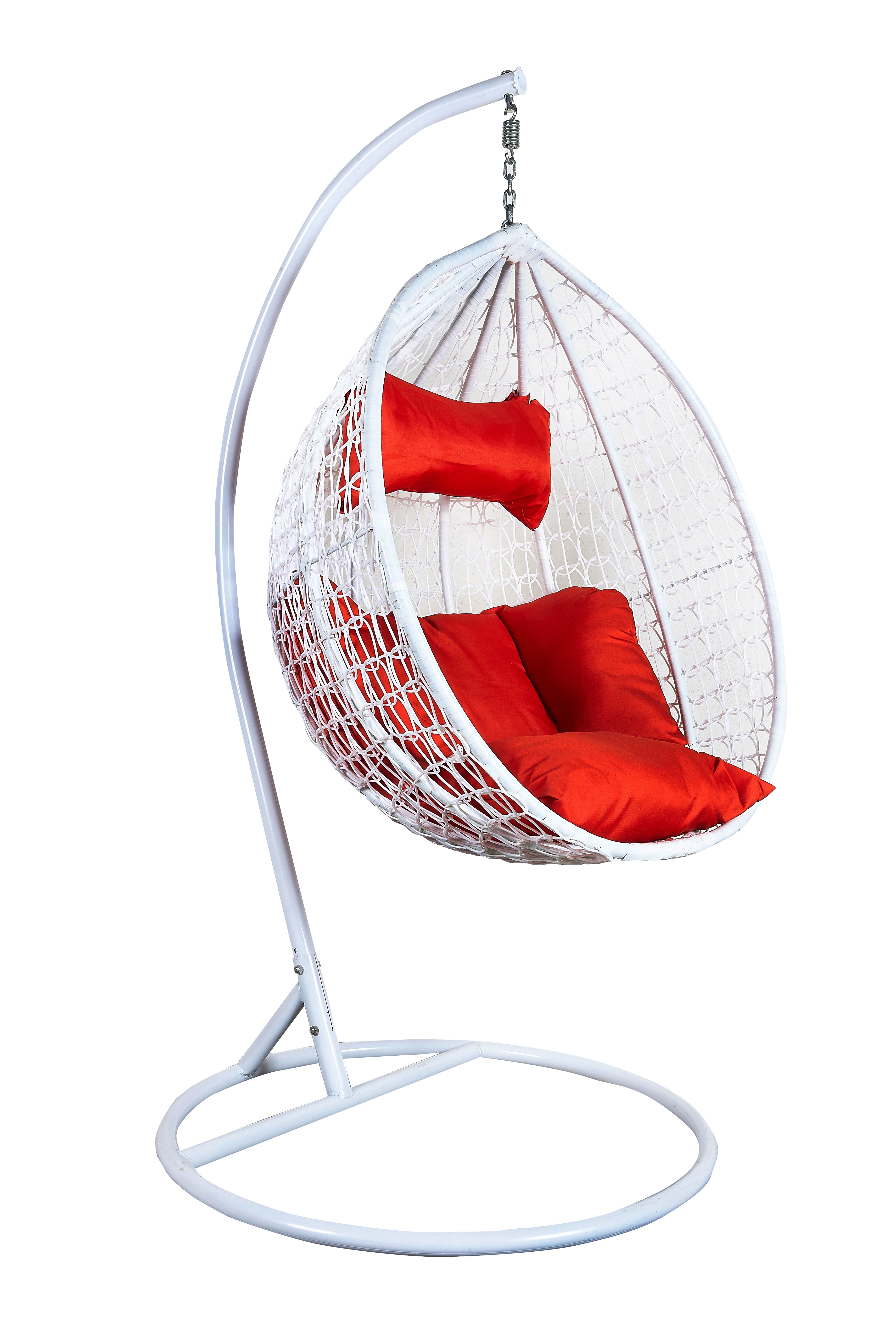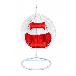 Függő karosszék stabil fémszerkezettel és műrattanból dekoratívan szőtt ülőfelülettel.A függőszék kényelmes párnákat is tartalmaz, amelyek vízállóak.