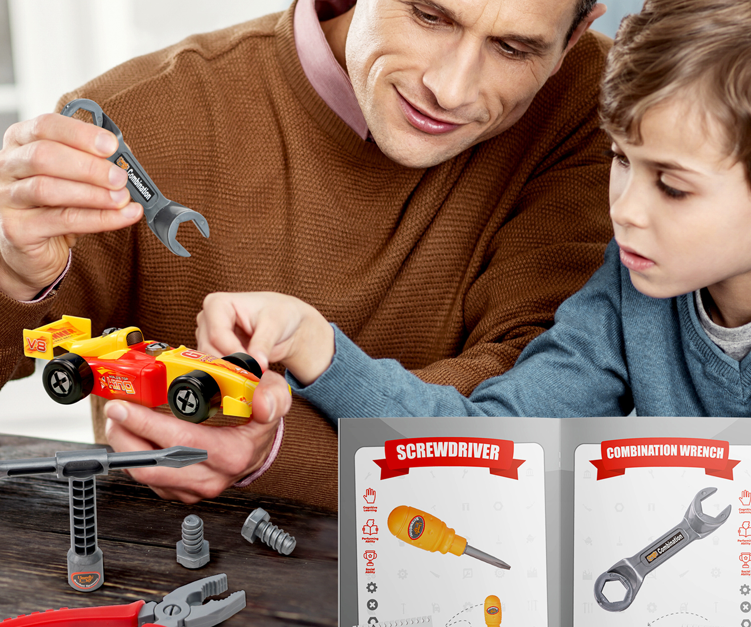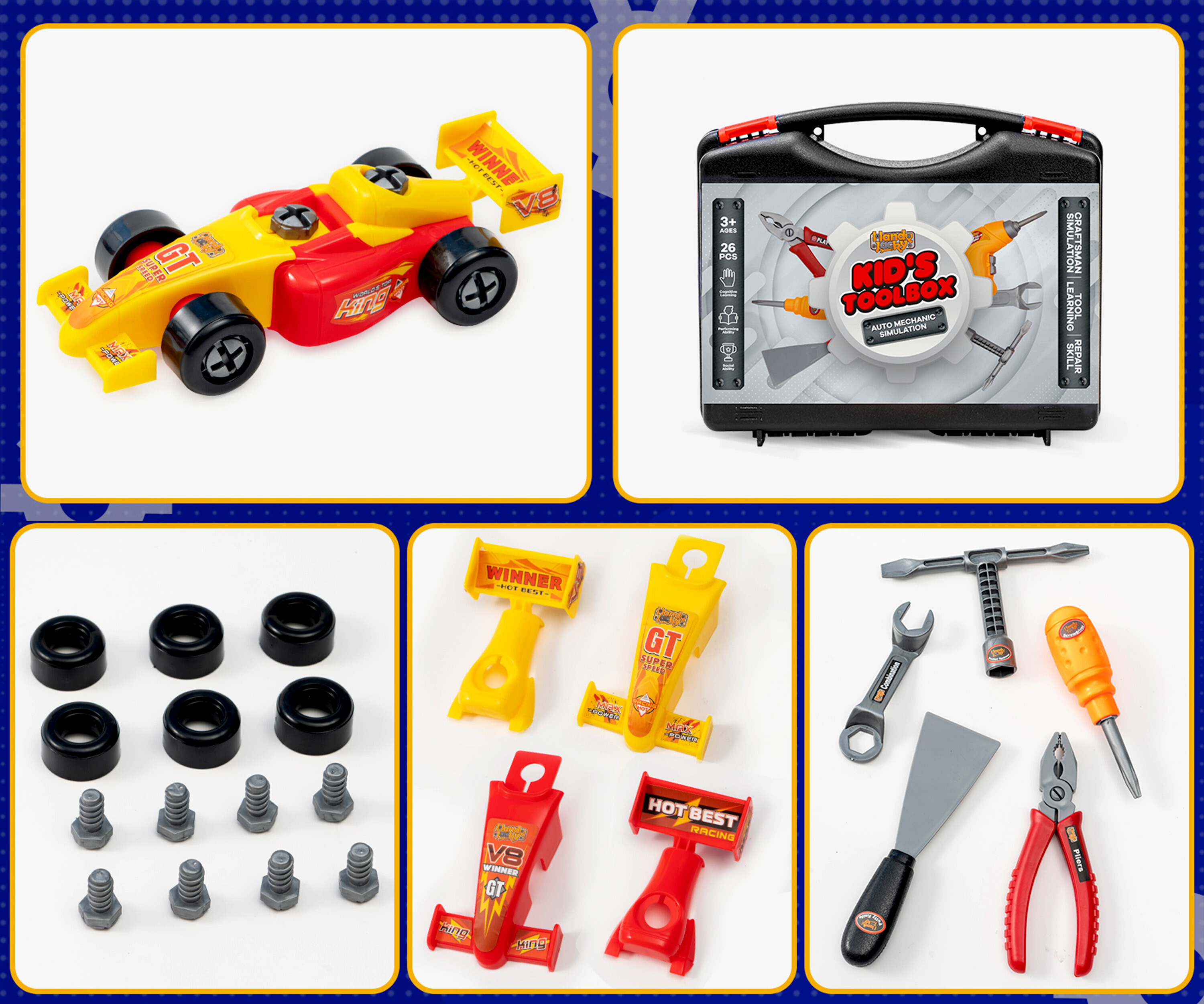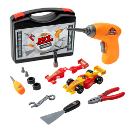 A funkcionális elektromos csavarhúzóval a szerelés gyerekjáték lesz számodra.A Forma-1-es autókat két színkombinációban lehet összeállítani (sárga és piros). A készlet része egy működő gyermek fúrógép, amely elemmel működik és csavarozó bittel van ellátva.