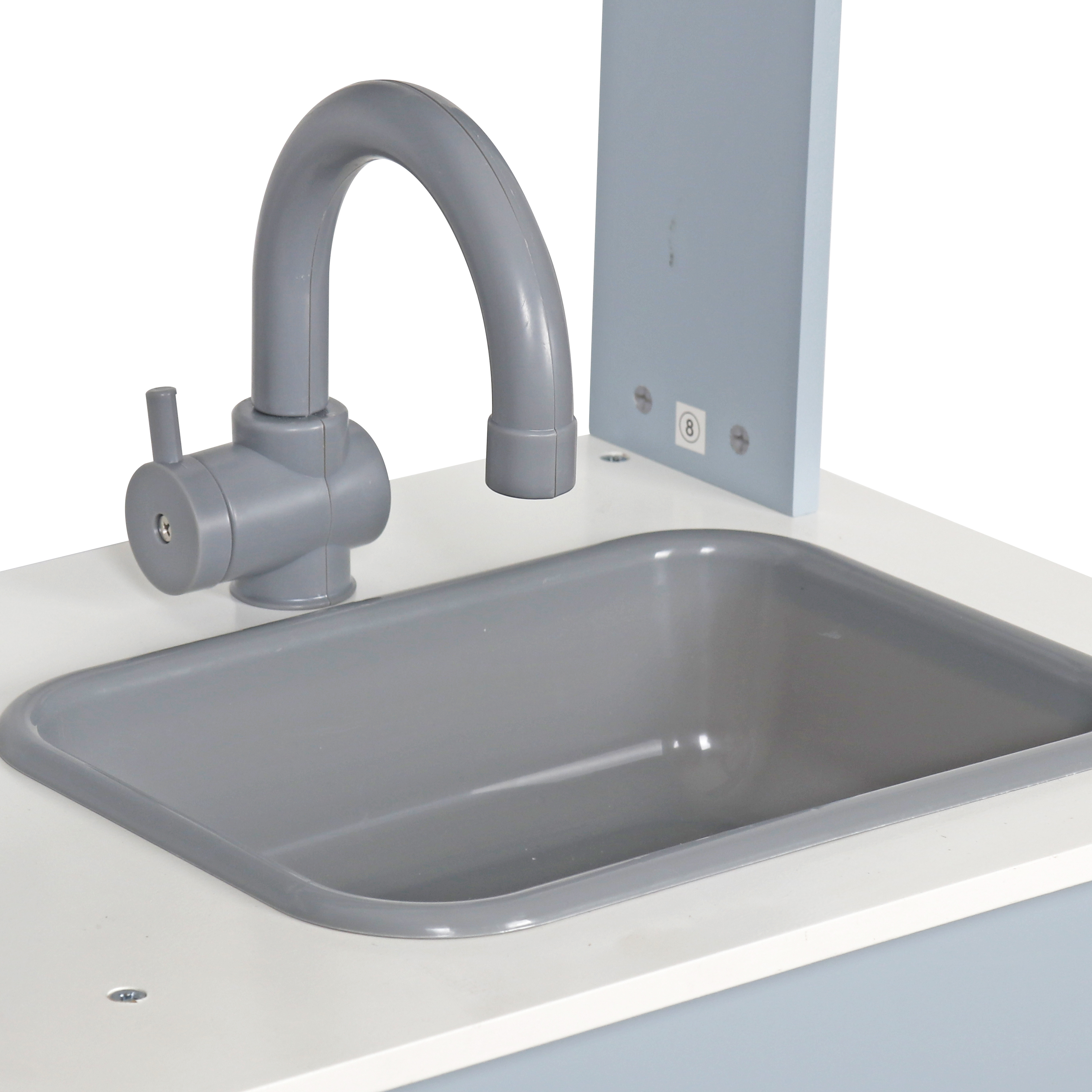 A konyhában nem hiányoznak a polcok az edények tárolására és a kampók a konyhai eszközök felakasztására.A konyhai mosogató kivehető, így a gyerek megtöltheti vízzel, és a konyhai munka befejezése után elmosogathatja az edényeket.