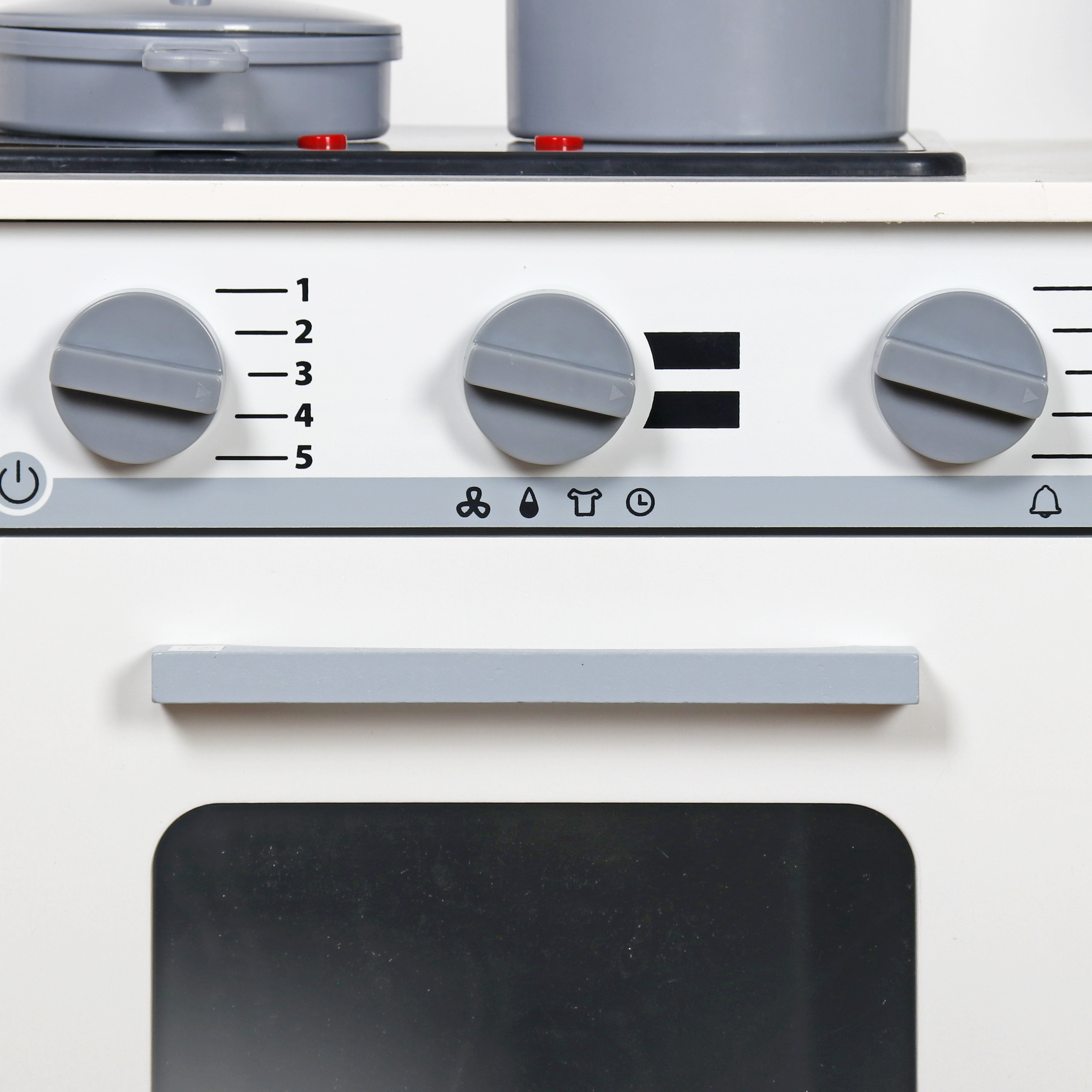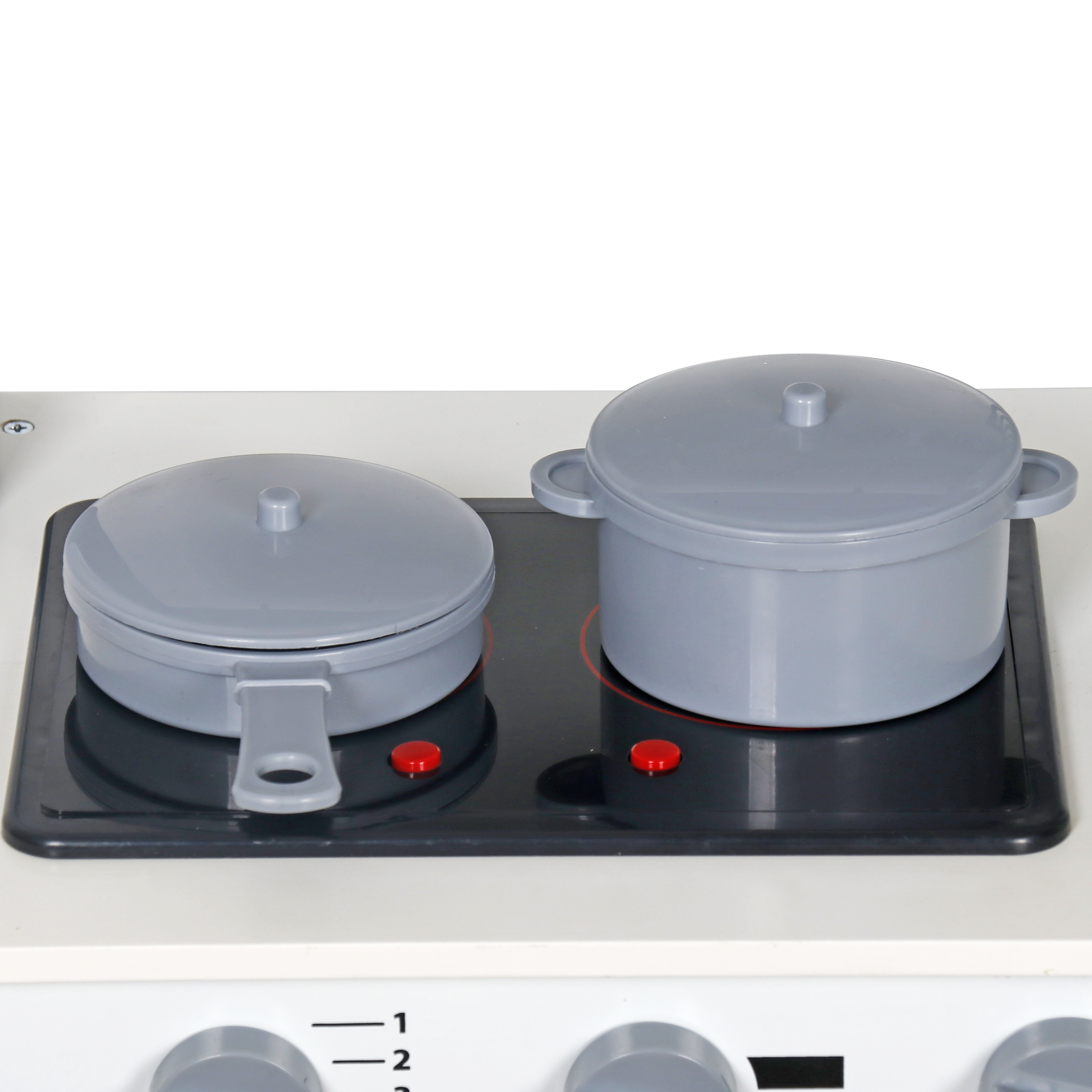 A tűzhely égői meg vannak világítva, és főzési hangot adnak ki. Amikor a gyerek csökkenteni vagy növelni akarja a sütő hőmérsékletét, a gombok kattogó hangokat adnak ki.