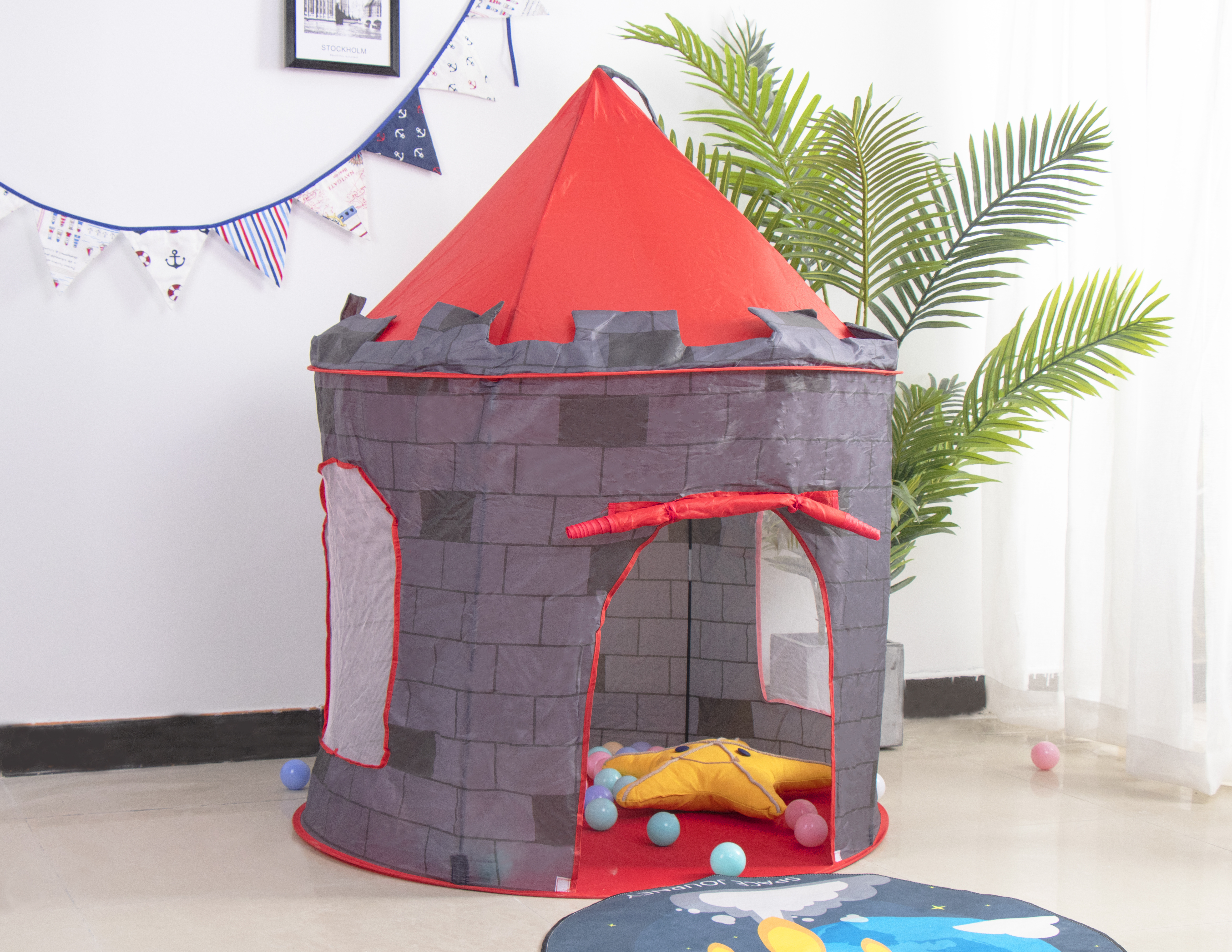 A sátrat néhány perc alatt felállítható.A gyerekszoba vagy a kertje pillanatok alatt várrá változik, ahol a gyermekeid menedéket találnak.