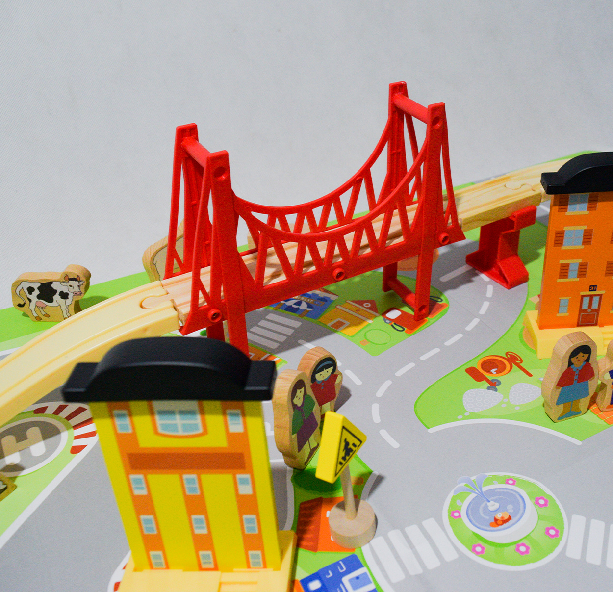 - A készlet tartalmaz - sínrészleteket híddal, tehervonatot, személyvonatot, autókat, fák és táblák készletét, állatkákat
