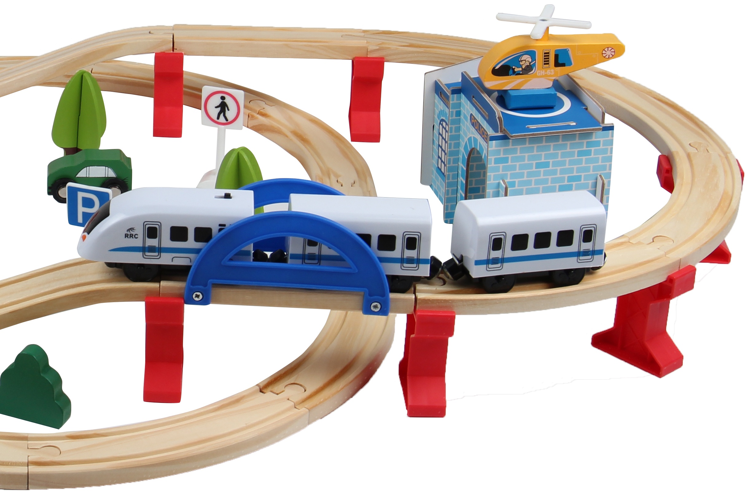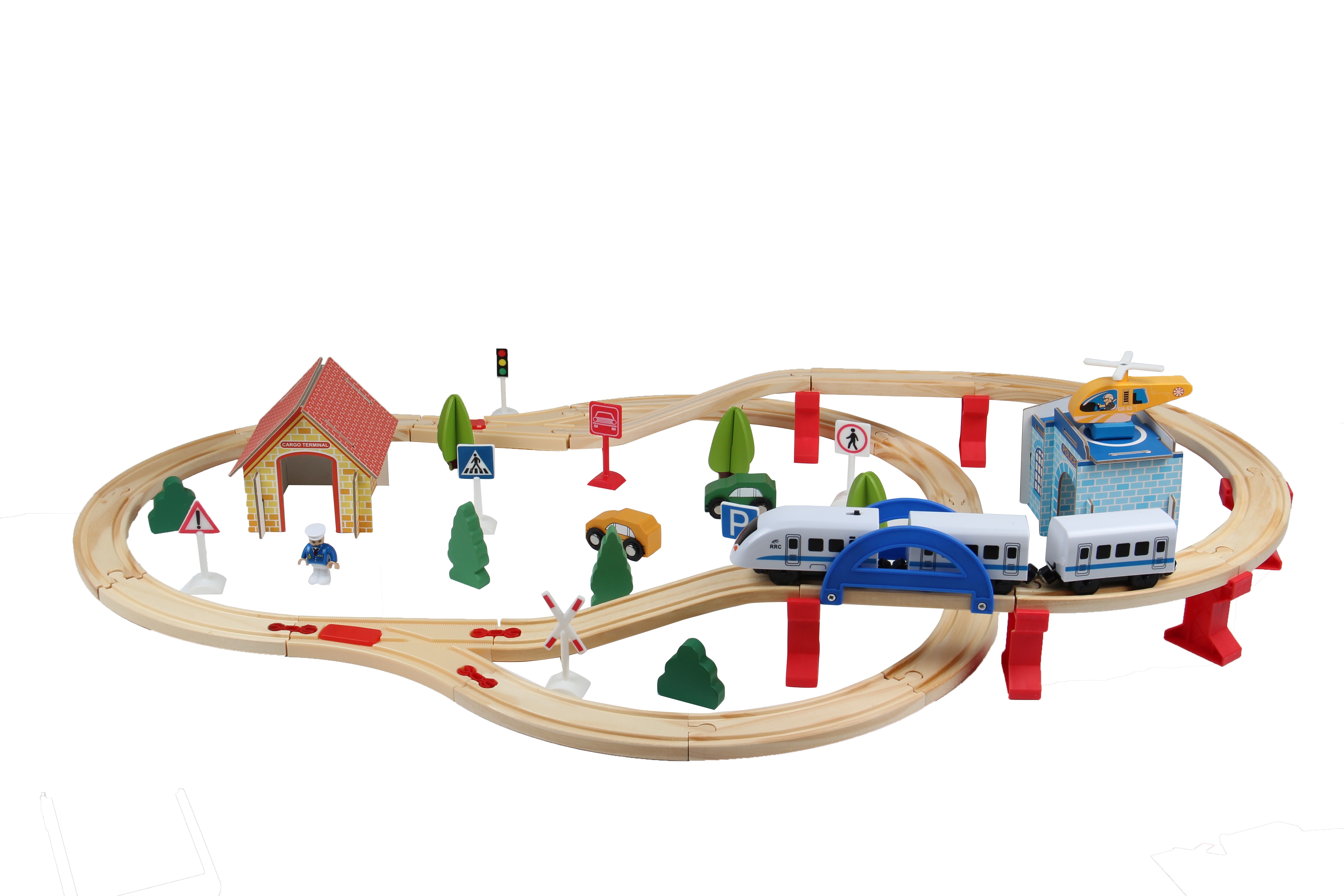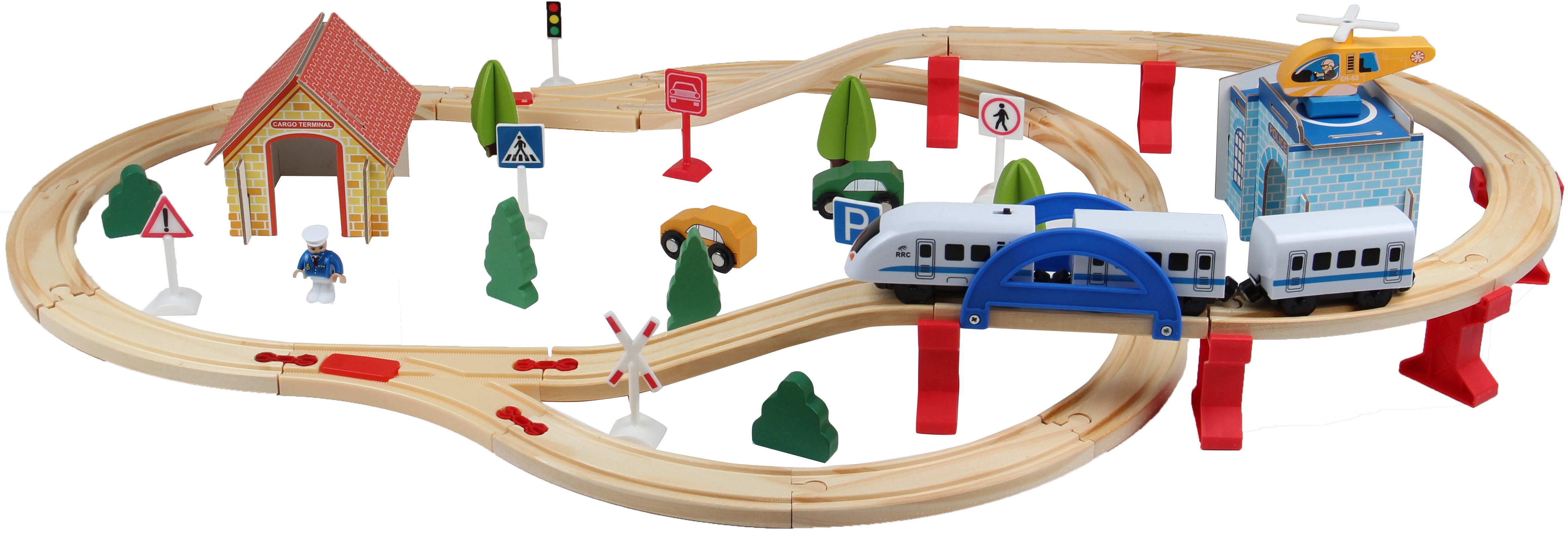 - A készlet tartalmaz - vasúti részek híddal, vonatok, autók, teherautók, épületek, figurák, útjelző táblák és fák