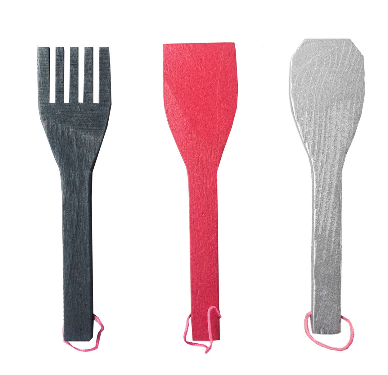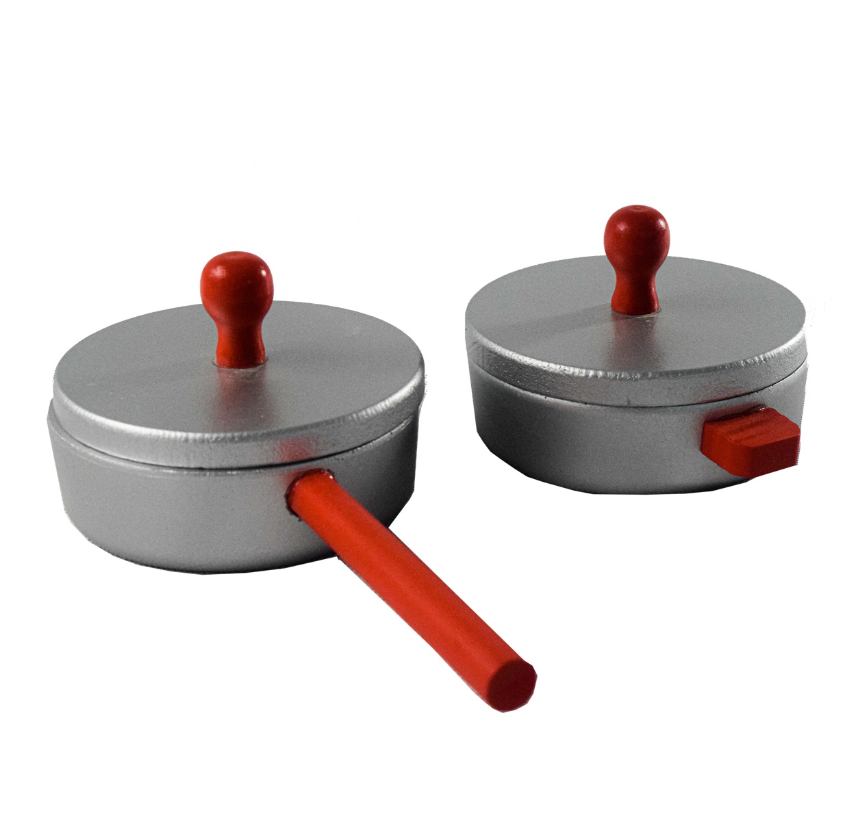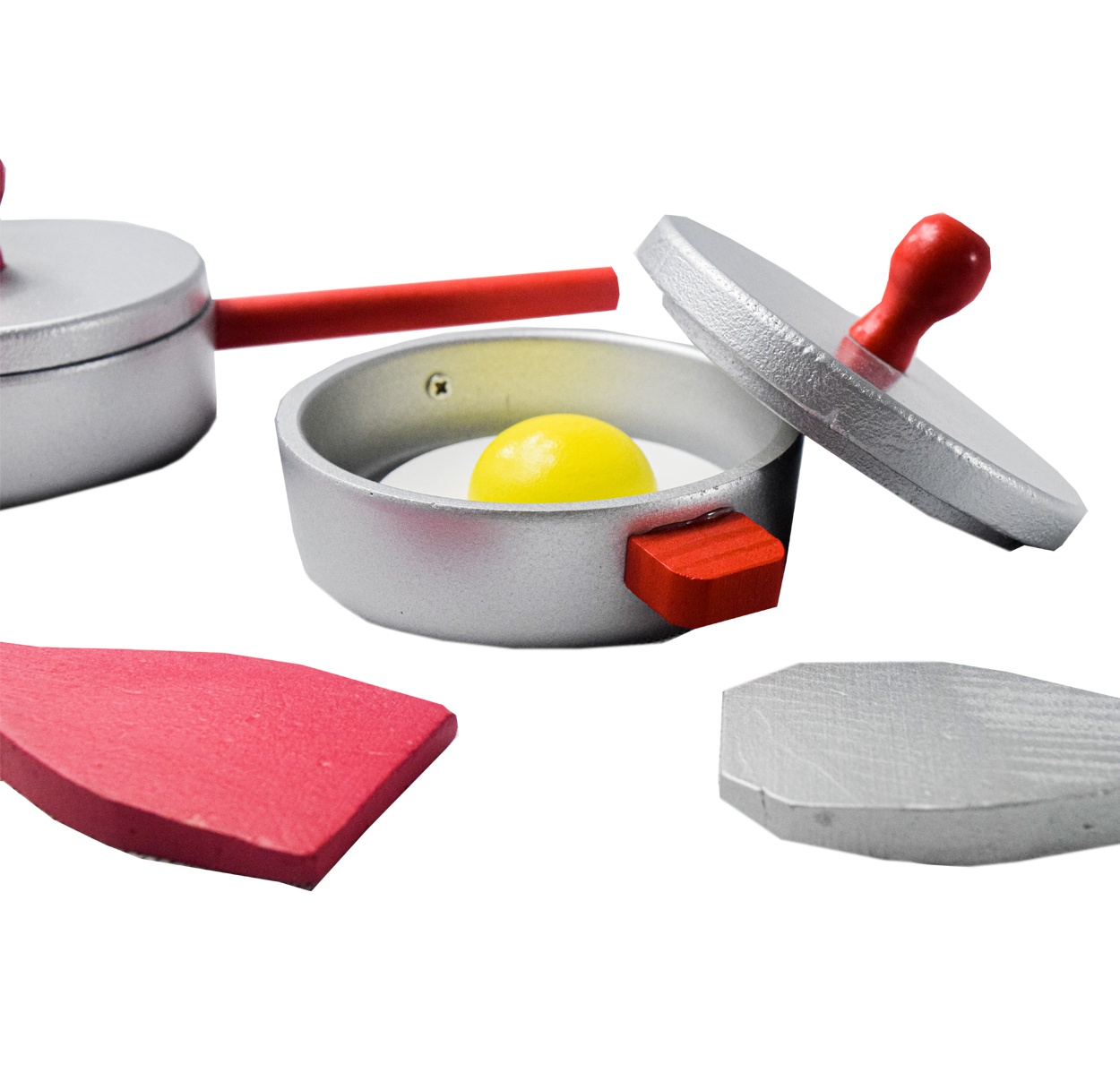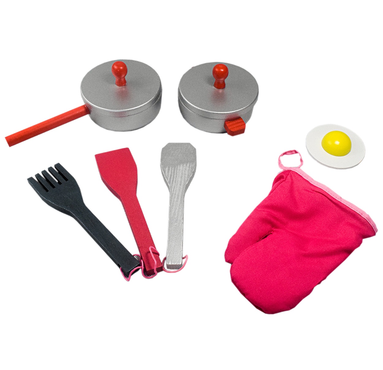 Gyerekek fa edényei COOKWARE SET 7, két fazék, két esztergályos, villa és edényfogó.