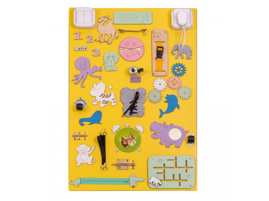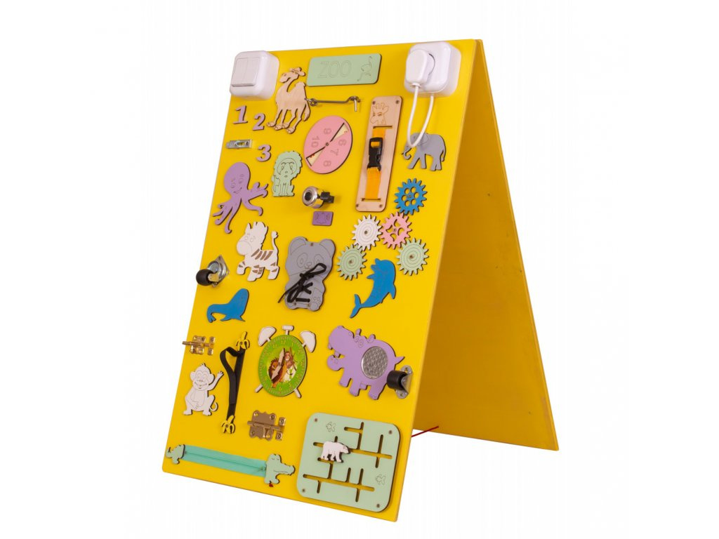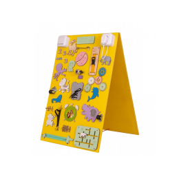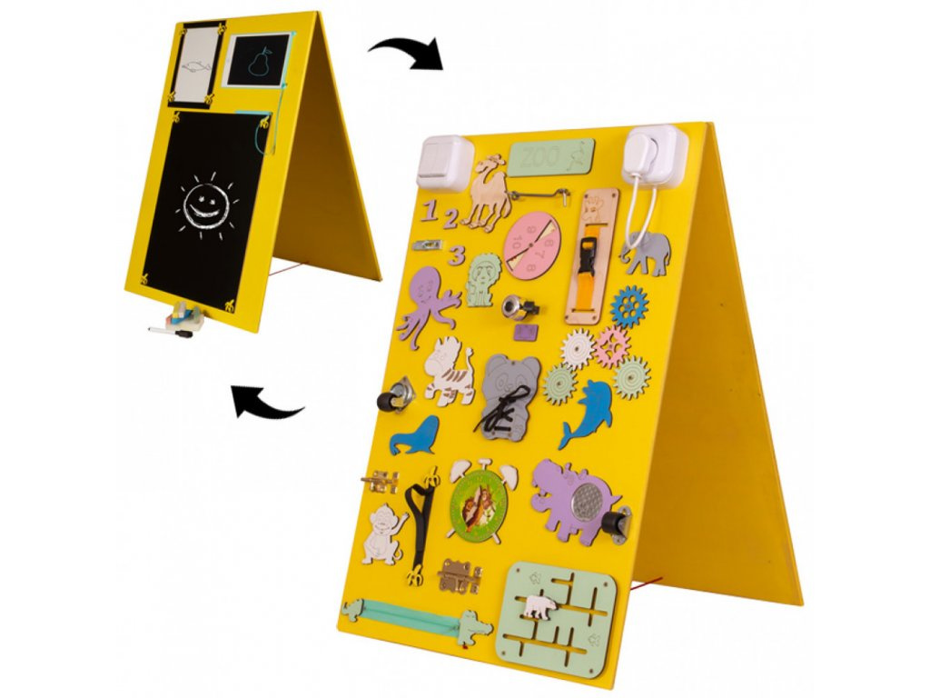A tábla egyik oldalán a kis kezek logikus gondolkodásra ösztönző ingereket fedeznek fel.A cipőfűző könnyen hozzáférhető módja a megkötés megtanulásának, a klasszikus cipzár a kreativitásra ösztönöz.