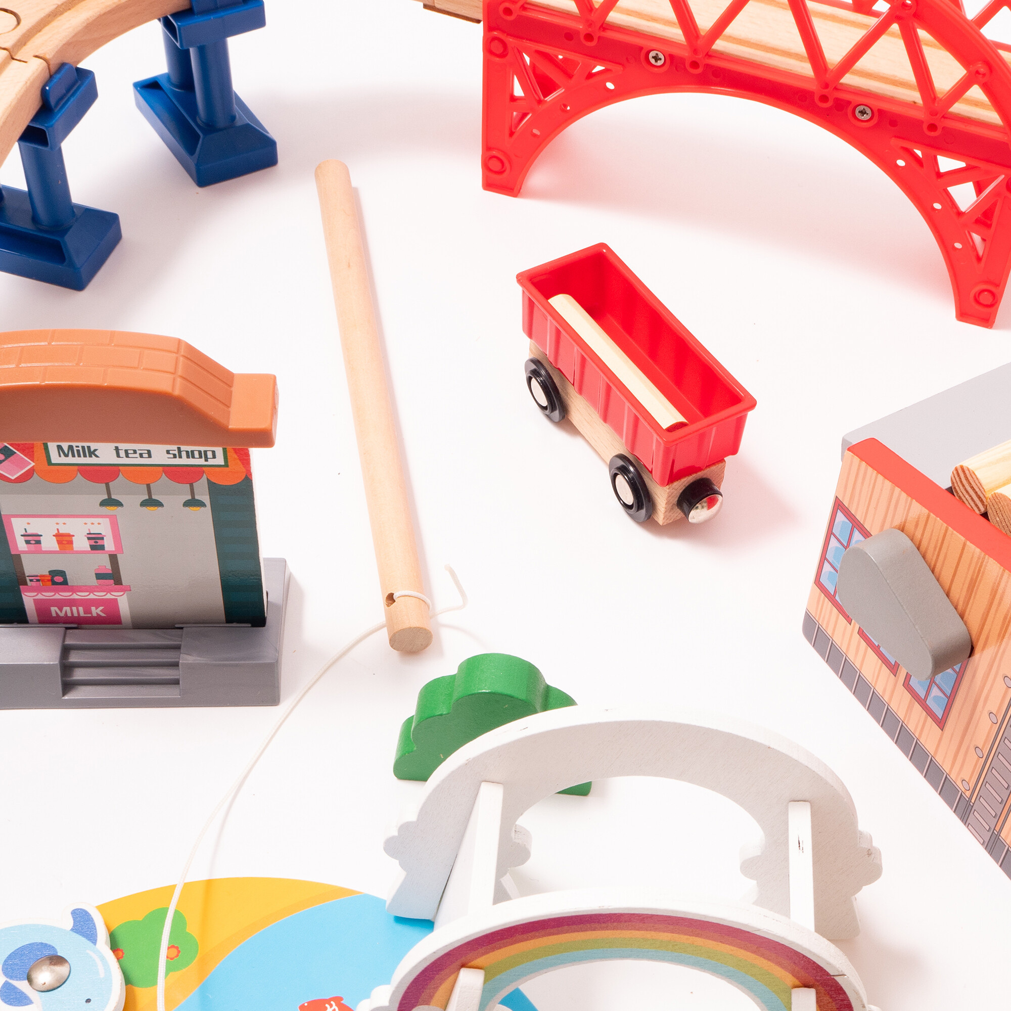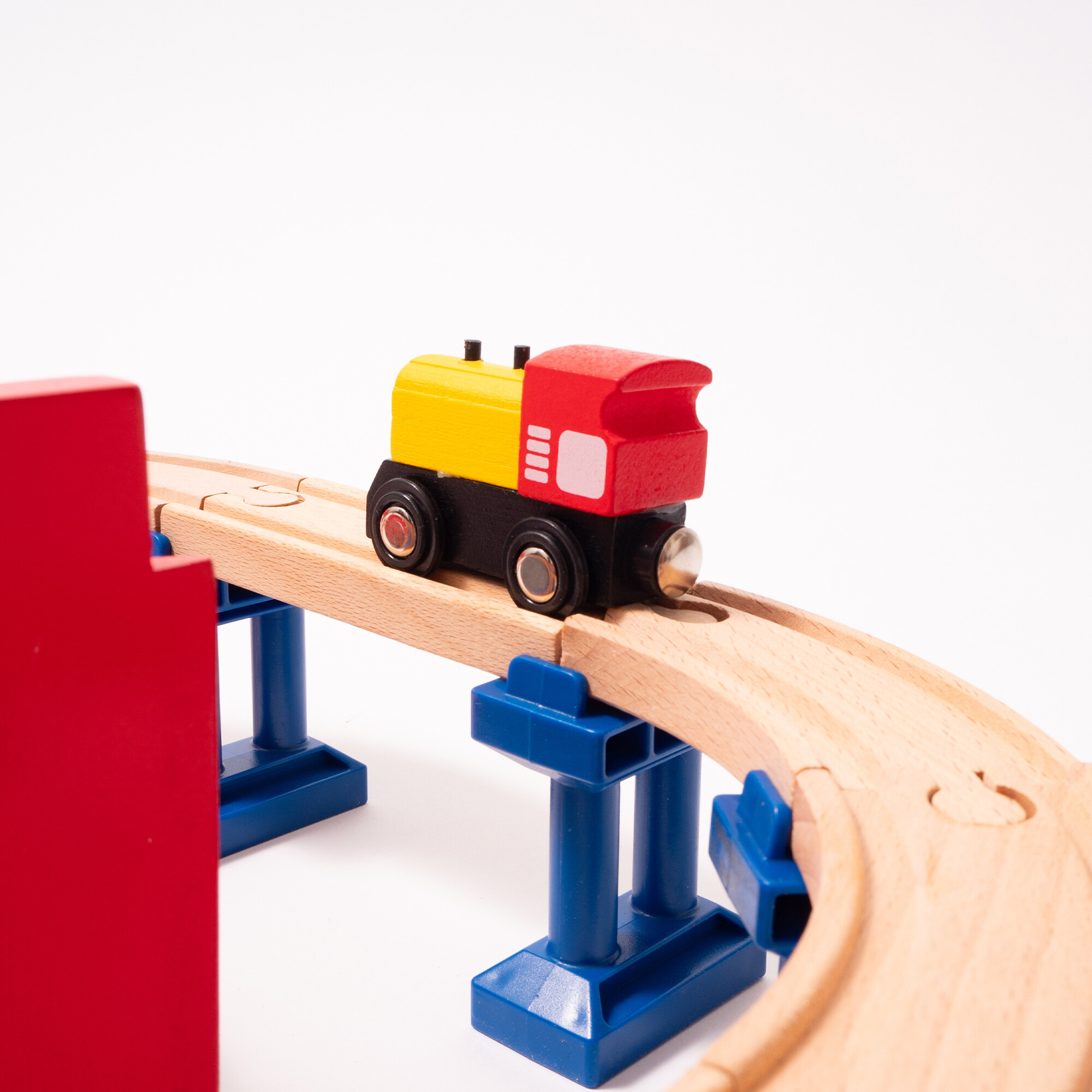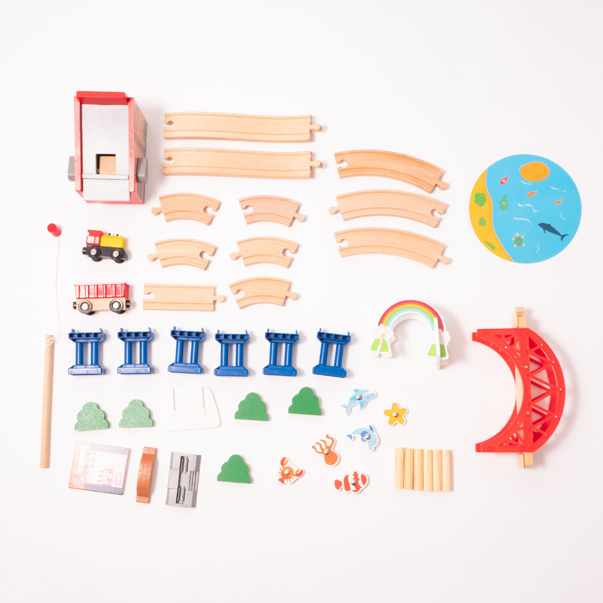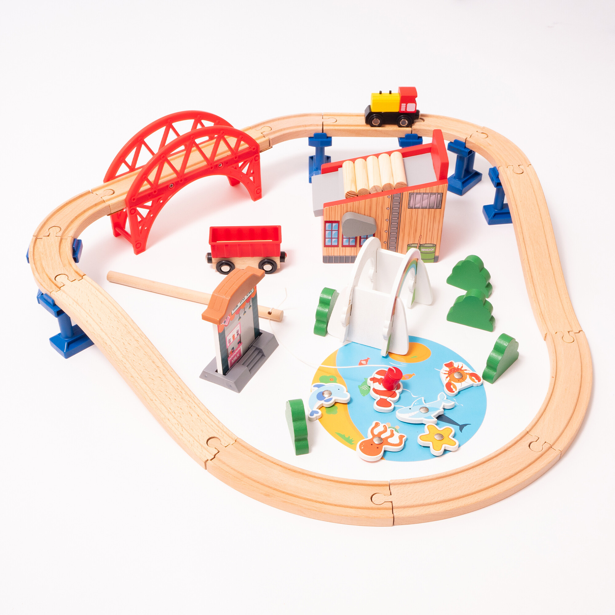 Gazdagon felszerelt fa vonatpálya az Aga4Kids cégtől.