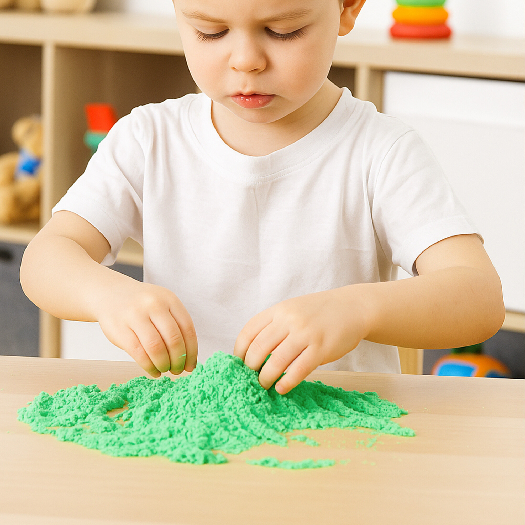 A kinetikus homokkal való játék fejleszti a finommotorikát, a kreatív képzelőerőt és a térbeli gondolkodást.