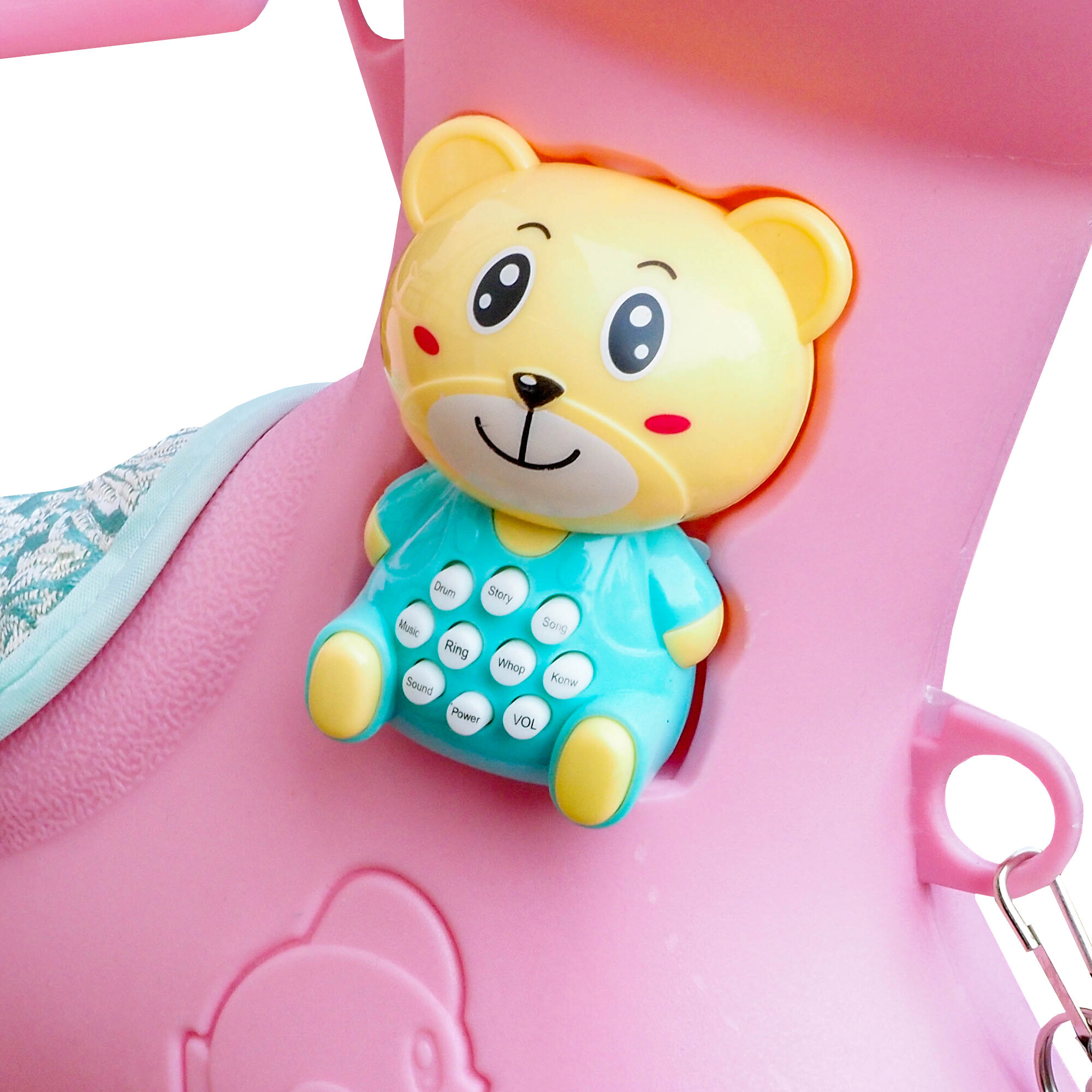 A ló nyakán egy interaktív mackó található, amely különböző hangokat és dallamokat ad ki.