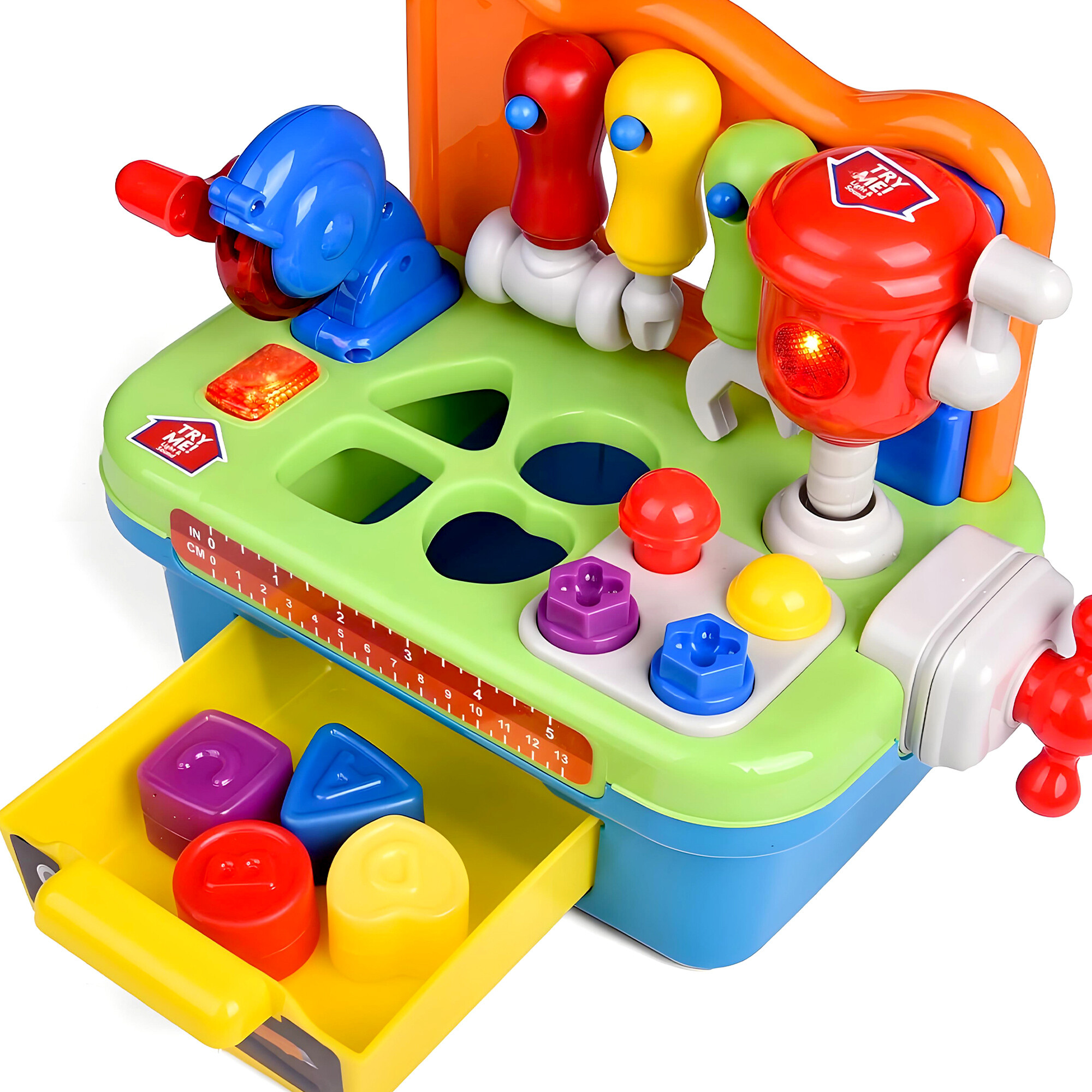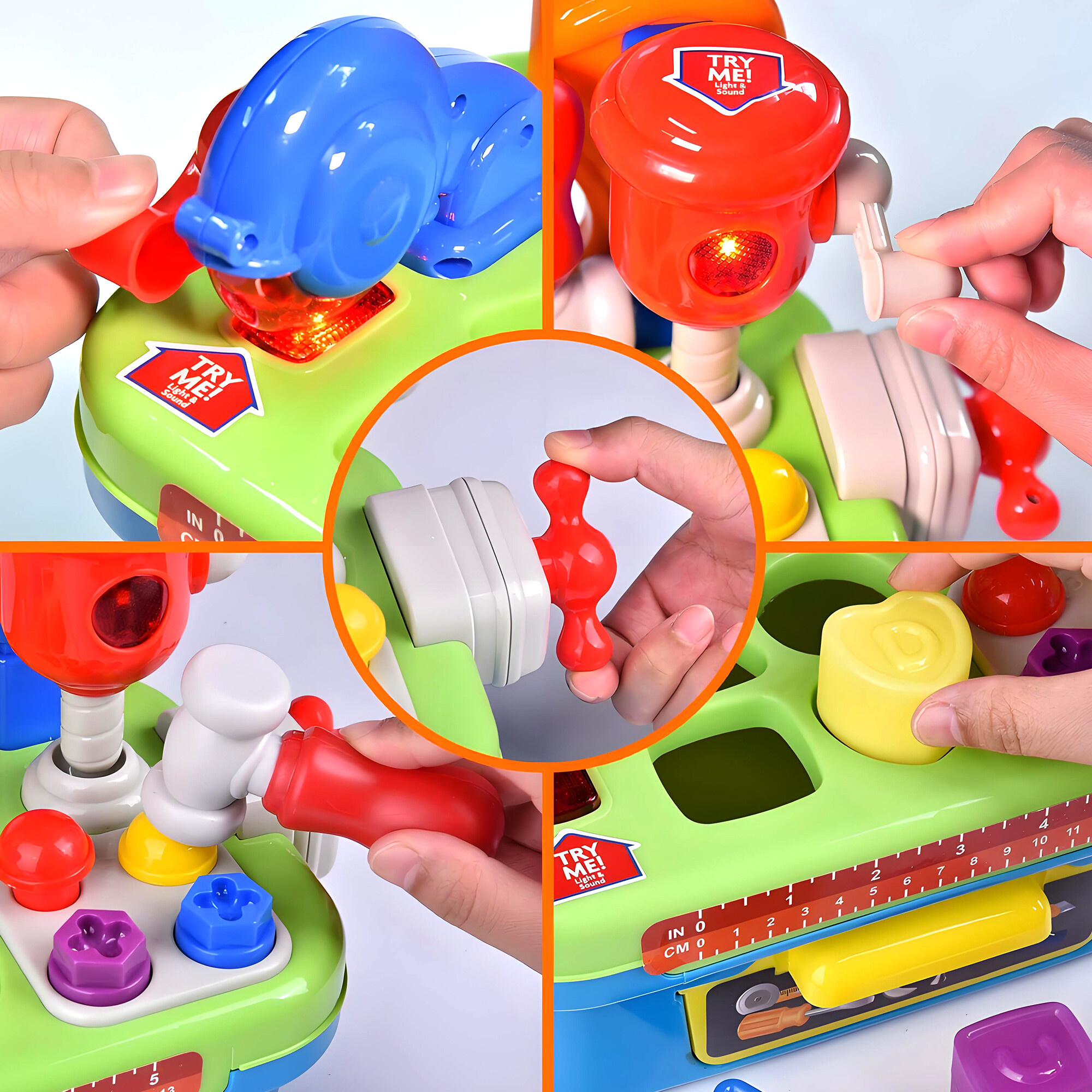 A felszerelésben találjon forgó fűrészt és fúrót fénnyel és hanggal, satu, kihúzható fiókot és egyéb szerszámokat. Továbbá az asztalka ki van alakítva bedobó nyílásokkal, amelyeken keresztül be lehet dobni a mellékelt színes kockákat.