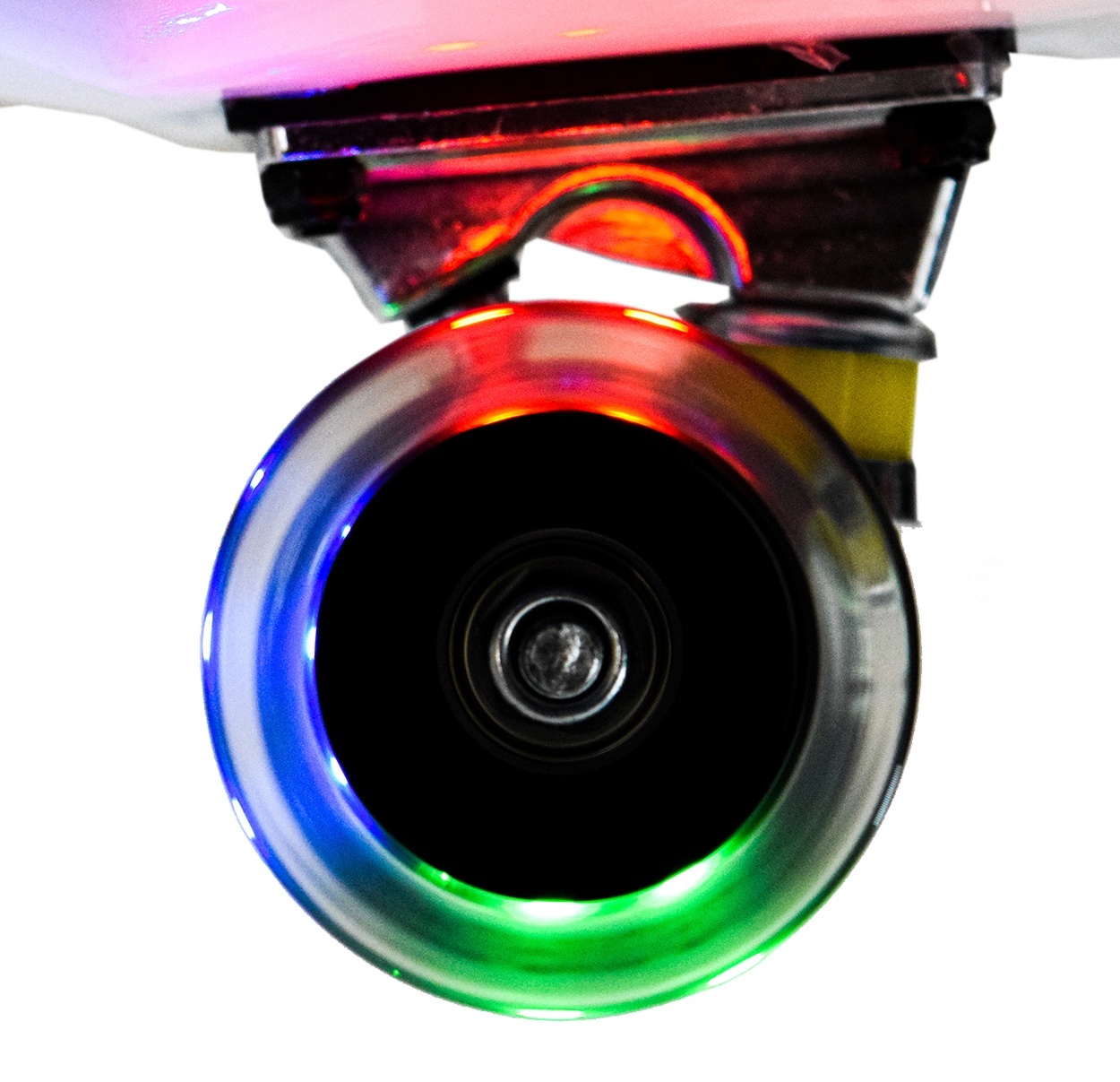 A gördeszka világító kerekekkel van felszerelve, amelyek világítani kezdenek, amint mozgásba kerülnek.