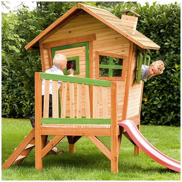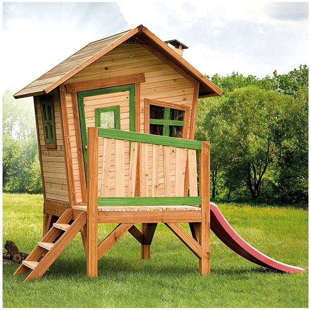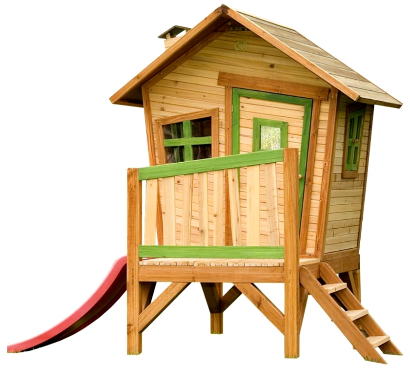 - Cölöpökön álló gyermekház lépcsővel, verandával és kis piros csúszdával