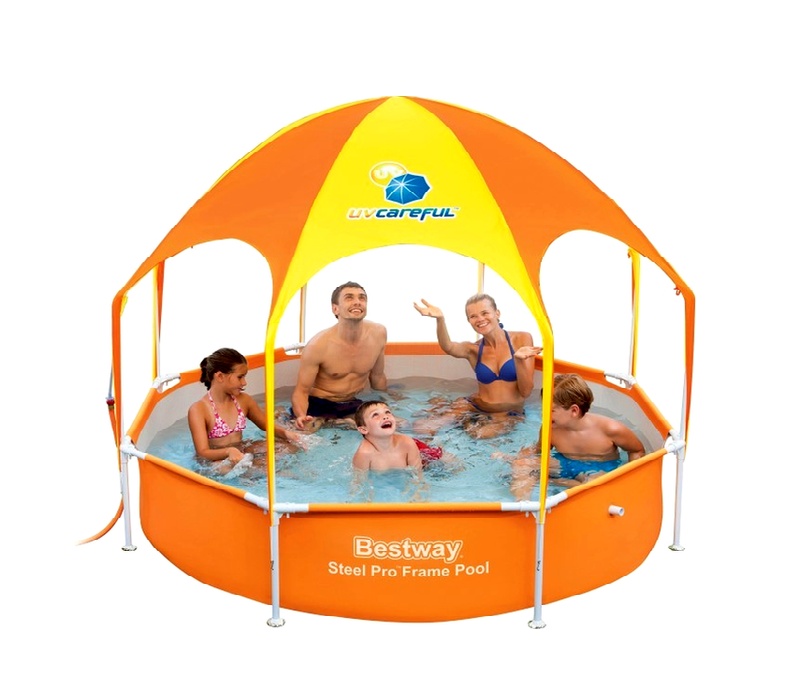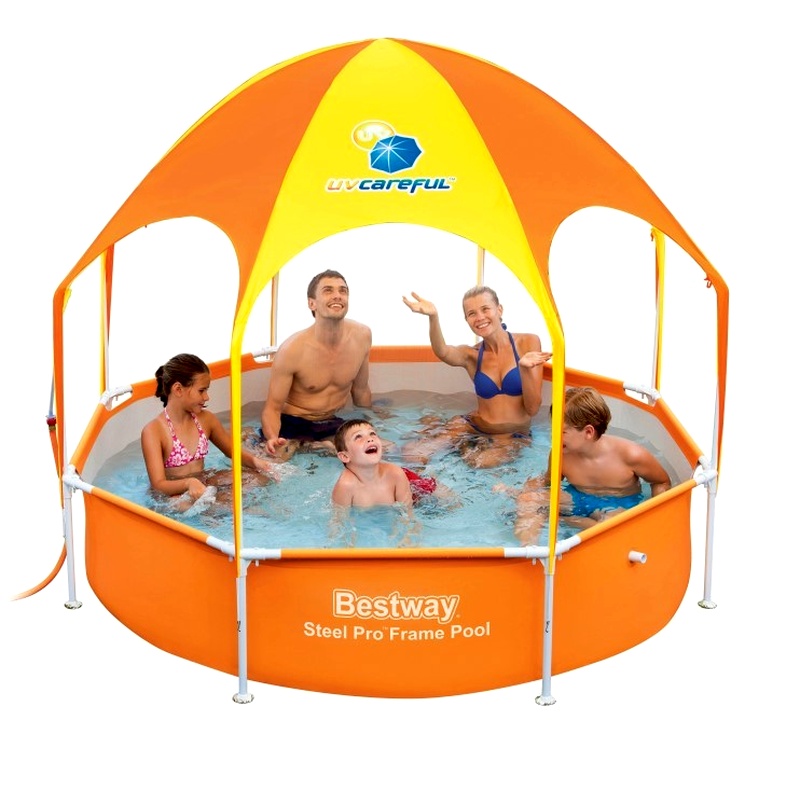 Föld feletti családi kerti medence az olasz Bestway cégtől, fémszerkezettel és napellenzővel.