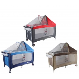 A kiságy pelenkázóasztallal, szúnyoghálóval és többfunkciós tartóval rendelkezik.