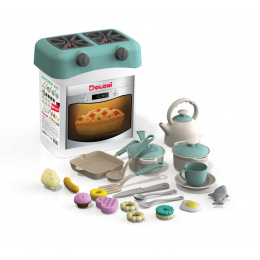Ez a gyerekkonyha modell 34 kiegészítővel van felszerelve - teáskanna fedéllel, 6x tányér, 4x pohár, 2x villa, 2x kanál, kés, merőkanál, spatula, nyeles lábas fedéllel, fazék fedéllel, serpenyő, kolbász, hal, rántotta, csirke és 5x süti.