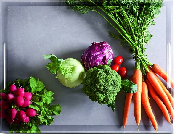 kiváló segítő az otthoni és kerti tálaláshoz kiváló minőségű MF műanyagból készült anyag tulajdonságai: átlátszatlan, magas fényű, karcolás- és vágásálló színtartó, egymásra rakható méretek: 40 x 31 cm dekoráció: zöldséges