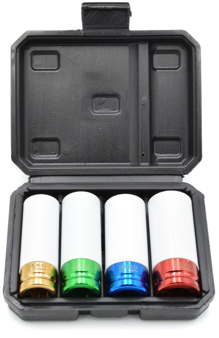A készlet 4 fejet tartalmaz 17, 19, 21, 22 mm méretekben, műanyag bőröndben tárolva.Minden fej egyedi színű, ami megkönnyíti a méret azonosítását.