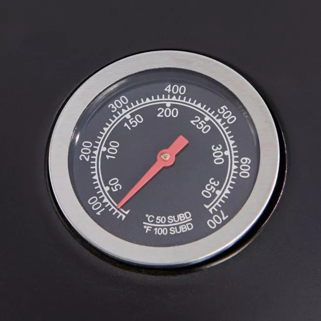 A grill praktikus, csuklós fedéllel van ellátva, beépített hőmérővel és a grillezőeszközök rögzítésére szolgáló kampókkal.
